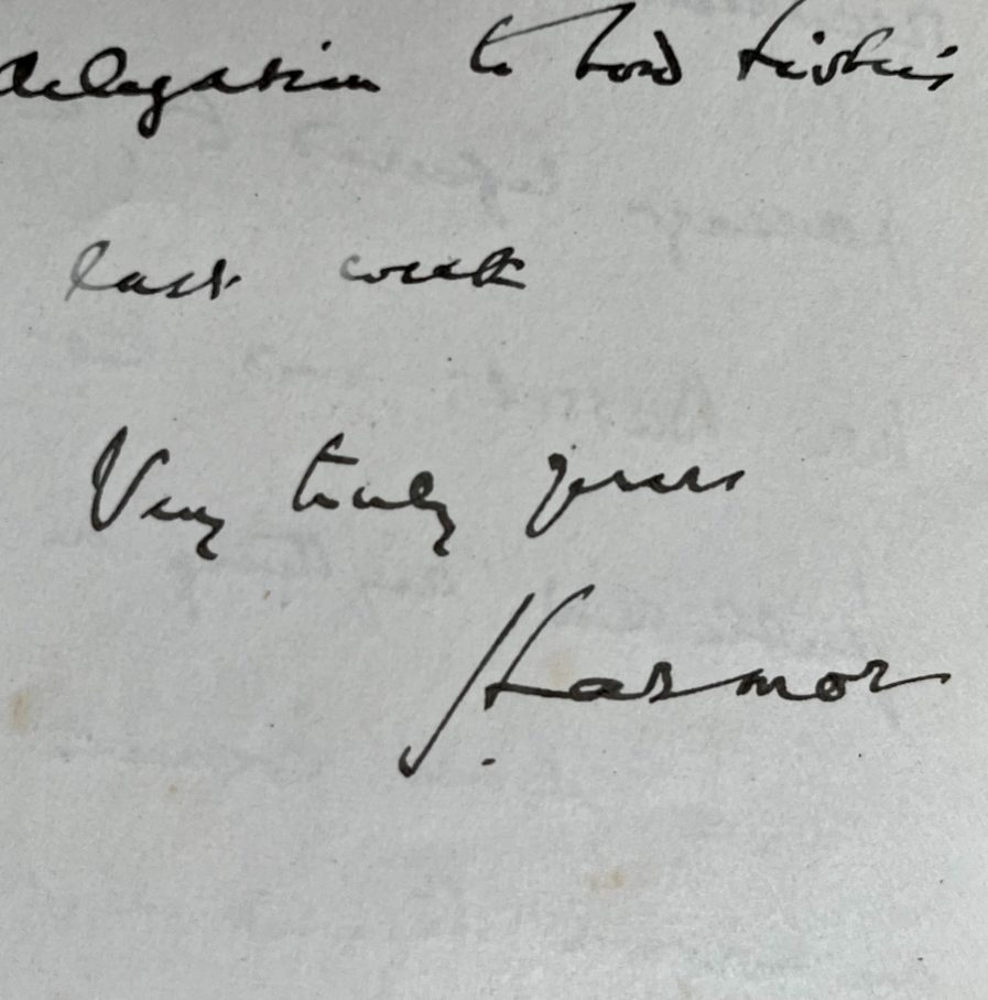Il présente ses excuses pour sa réponse tardive, étant trop occupé par ses affaires à Londres. Il évoque son fameux ouvrage Hydrodynamics et la référence d'un article publié à ce sujet (1884). I am sorry my occupations in London have délayer my reply to your letter of inquiètes about hydrodynamics". Larmor mentionne une lettre à son confrère le mathématicien Alfred Bernard Basset et salue la touchante délégation française présente pour les funérailles de Lord Joseph Lister (1827-1912), chirurgien britannique de renom, pionnier de l'antiseptie. "We were much touched and gratified by the strong French delegation to Lord Lister's funeral last week".