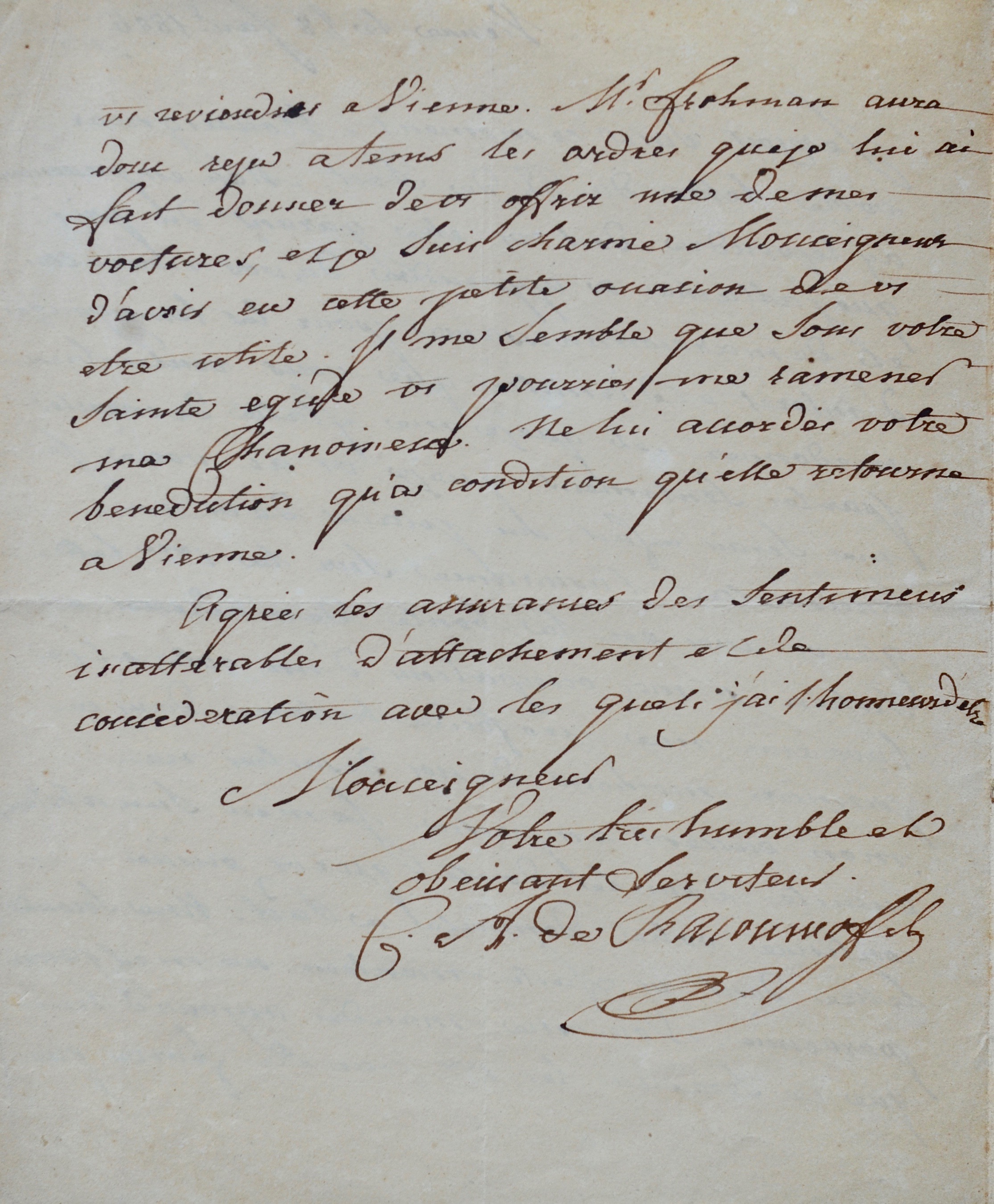 Andreï Razoumovsky (Hloukhiv, 1752/1836)Lettre pleine de déférence où perce, en filigrane, la situation à Vienne après la bataille d'Austerlitz, survenue un mois plus tôt, aux portes de la ville [2 décembre 1805, suivie du traité de Presbourg, le 26 décembre]. "Je reçois dans ce moment, Monseigneur, votre lettre du 22 de Pest. Mon empressement à y répondre doit vous être garant du prix que j'attache à apprendre de vos nouvelles, et de ma reconnaissance pour les témoignages d'intérêt et d'amitié que vous voulez bien me donner et que je me flatte de mériter par les sentiments que je vous ai voués. Je me serais fait un plaisir de vous en transmettre l'assurance sur la 1ère lettre que vous avez eu la bonté de m'adresser à Teschen, si mes occupations d'un côté, et je l'avouerai ma profonde tristesse dans ces premiers moments de nos désastres ne m'en eussent empêché [...]". Il a fait mettre à sa disposition l'une de ses voitures pour l'accueillir à Vienne lors de son arrivée prochaine. "Je suis charmé, Monseigneur, d'avoir en cette petite occasion de vous être utile. Il me semble que sous votre sainte égide vous pourriez me ramener ma chanoinesse. Ne lui accordez votre bénédiction qu'à condition qu'elle retourne à Vienne".