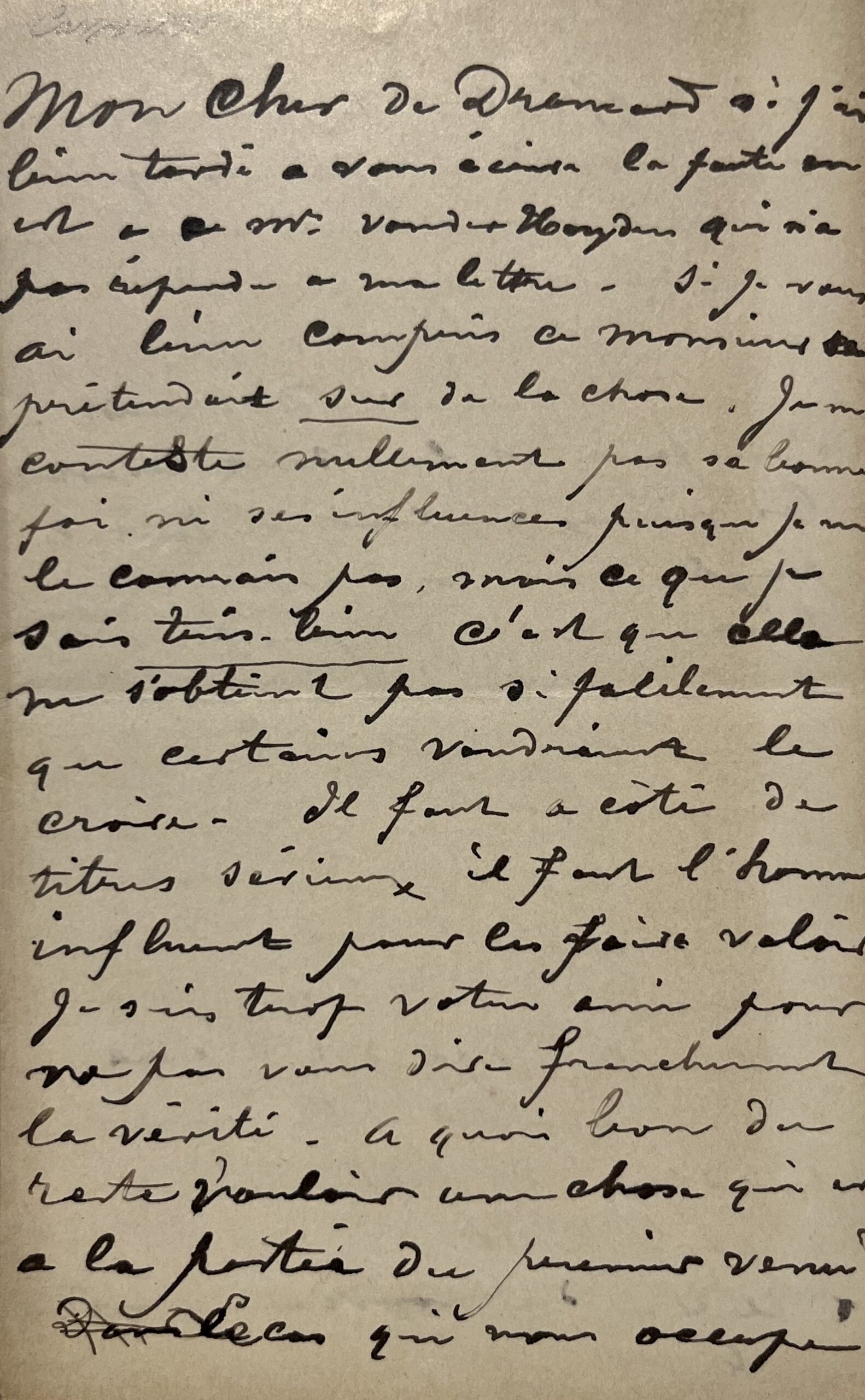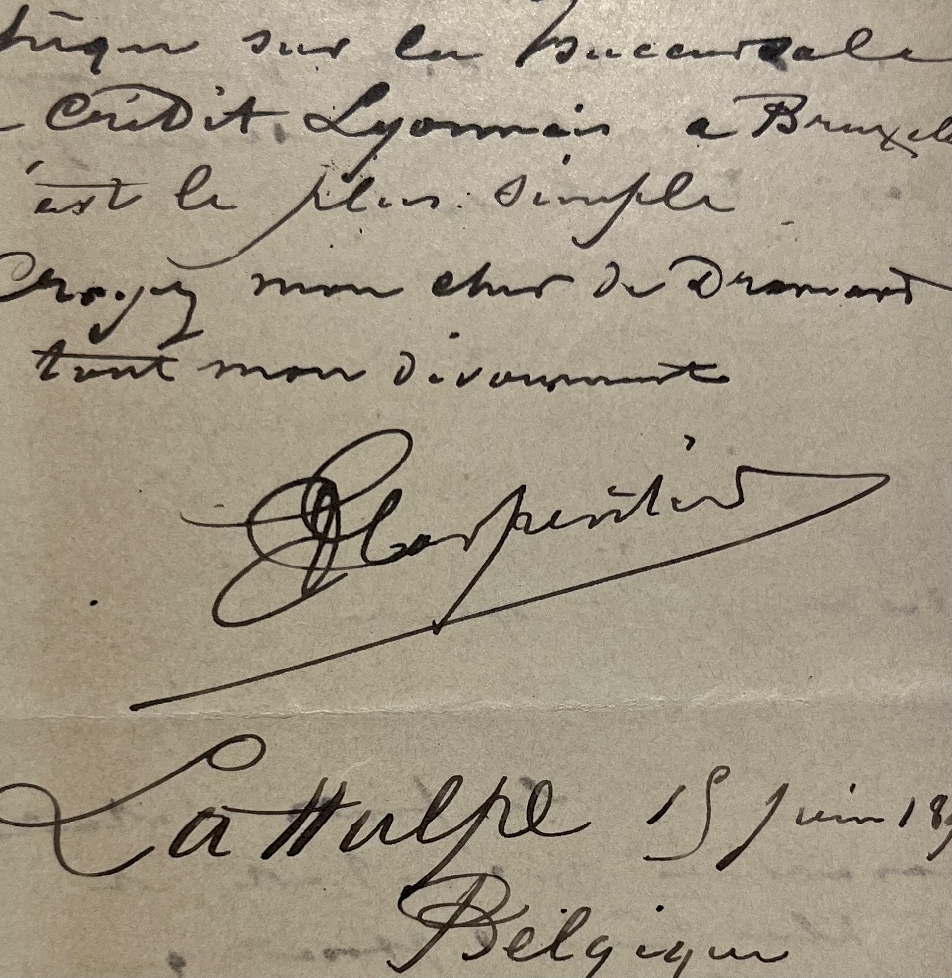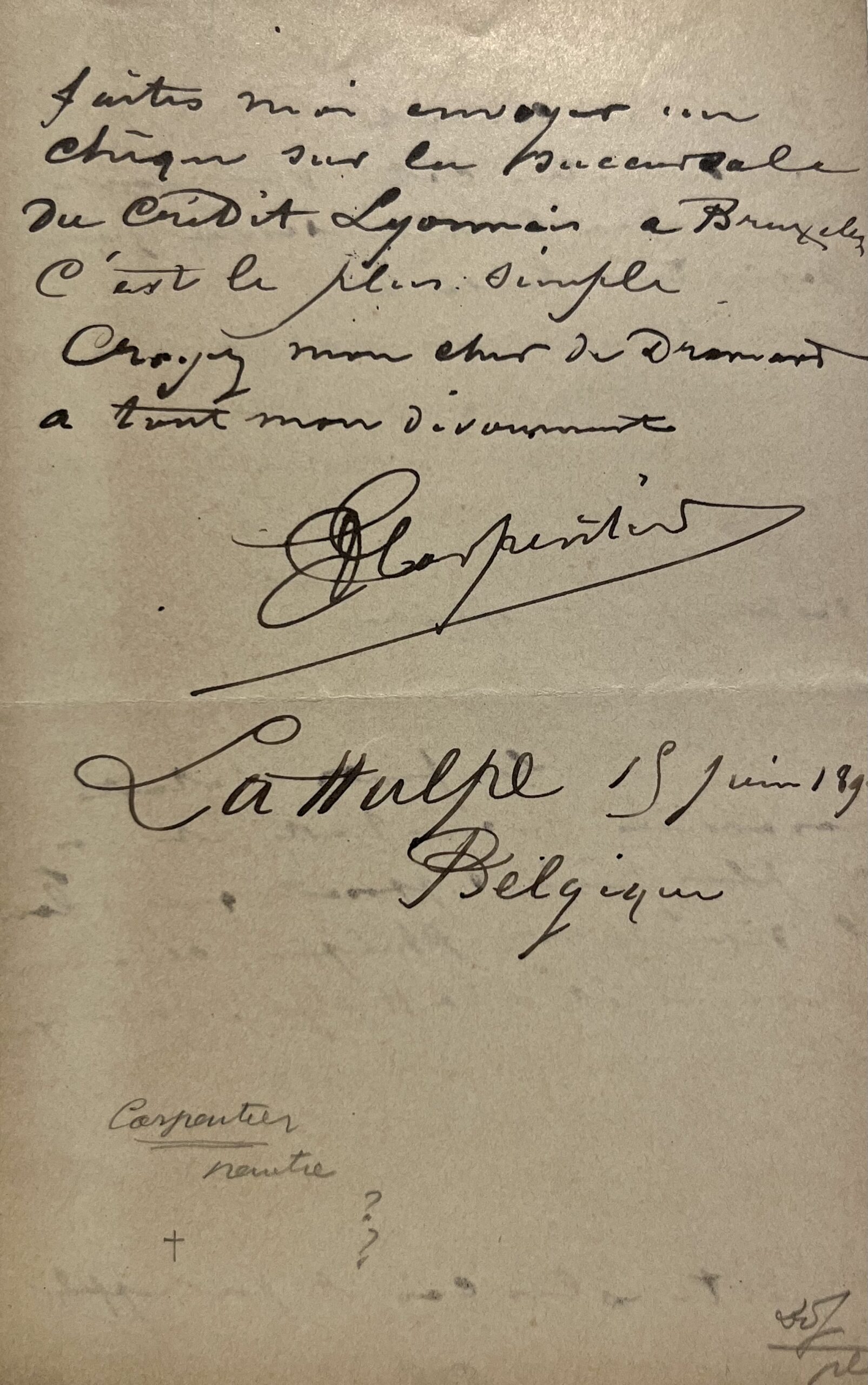 Maintenant un mot d’autre chose à titre de renseignement. Lors de notre conversation chez vous, vous m’avez dit de m’adresser à Monsieur Philipon pour les règlements de notre petite affaire de mon tableau acquis au Salon. C’était en vue de m’épargner ici une course à Bruxelles. Les fonds n’étant pas arrivés, je suis parti et je n’y ai plus pensé supposant que, selon le dire de Monsieur Philipon, cela me parviendrait à La Hulpe. Voilà donc 6 ou 7 semaines de cela. Je suppose qu’il n’y a pas de malentendu et que ce n’est qu’un simple retard pour un motif quelconque. Dans tous les cas et pour rappel faites moi envoyer un chèque sur la succursale du Crédit Lyonnais. C’est le plus simple. Croyez mon cher de Dramart à toute mon dévouement".