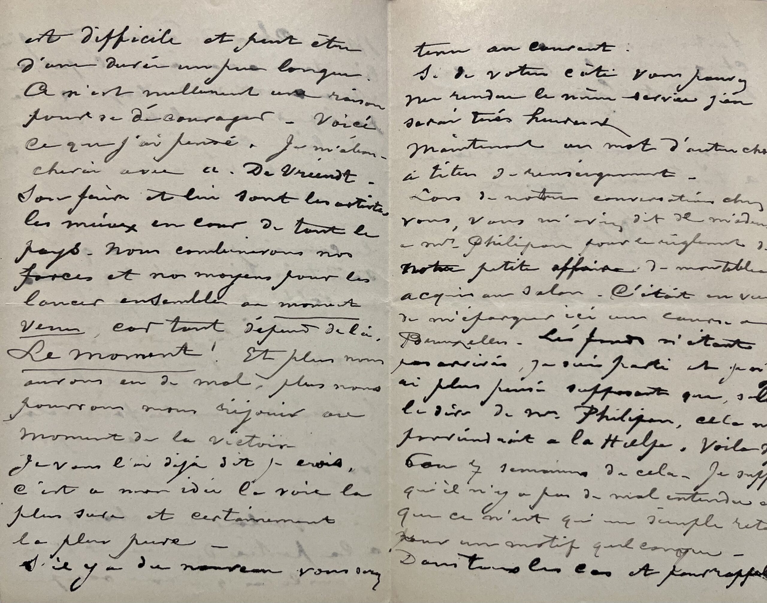 Je m'aboucherai avec « de Vriendt » [Julien et Albrecht de Vriendt]. Son frère et lui sont les artistes les mieux en cour de tout le pays. Nous combinerons nos forces et nos moyens pour les lancer ensemble au moment venu, car tout dépend de là, le moment ! Et plus nous aurons eu du mal, plus nous pourrons nous réjouir au moment de la victoire. Je vous l'ai déjà dit je crois, c’est à mon idée la voix la plus sure et certainement la plus pure.