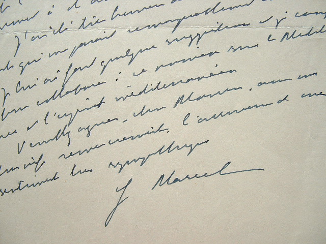 Lettre du philosophe Gabriel Marcel, d'une écriture très difficile à déchiffrer. «Bien sûr, je souscris, et du fond du coeur, à chaque mot de votre écrit, c'est la protestation de l'homme indigné par tant d'imposture et de férocité. Votre numéro est admirable [...]». Il applaudit chaleureusement cette initiative. Il a fait la connaissance de son fils avec qui il a longuement discuté et compte sur sa collaboration pour "l'esprit méditerranéen".