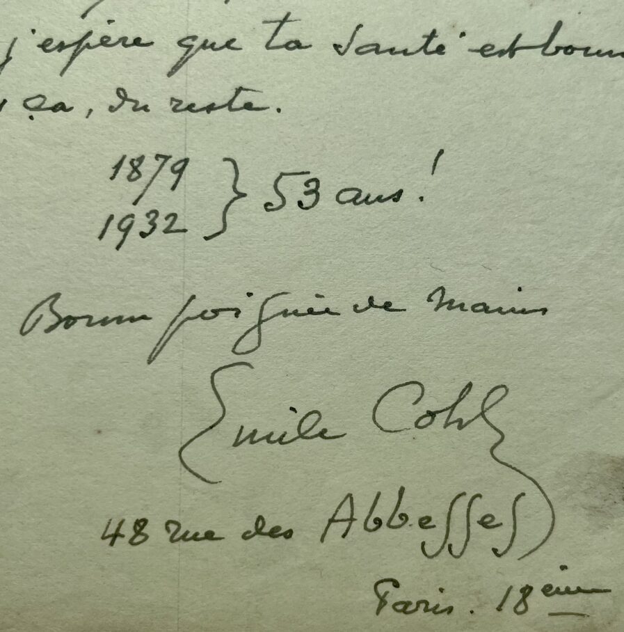 Emile Cohl (Courtet) (Paris, 1857/1938)Rare lettre d'Emile Cohl, pionnier du dessin animé. Il y évoque l'ancien groupe des Hydropathes.