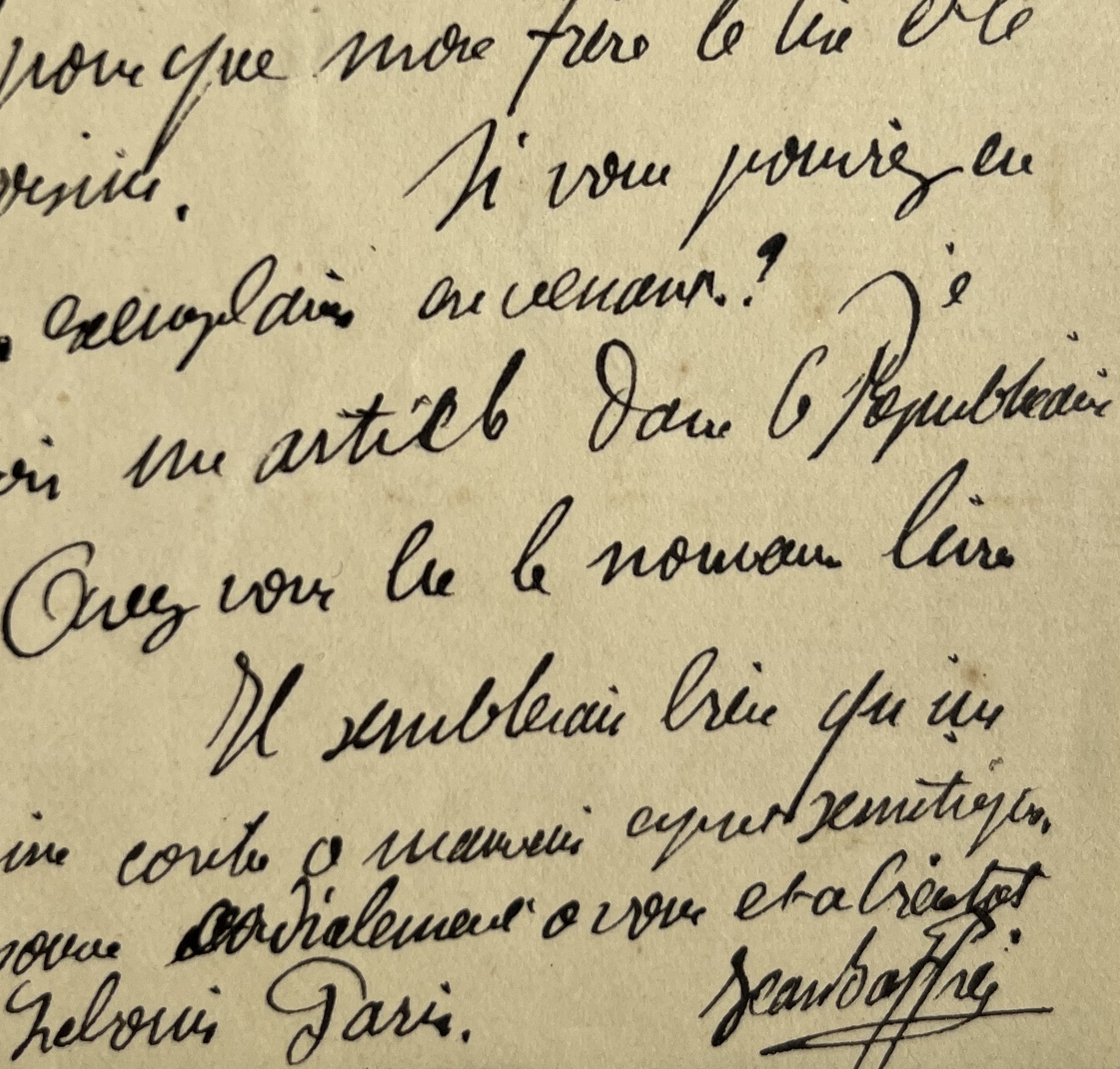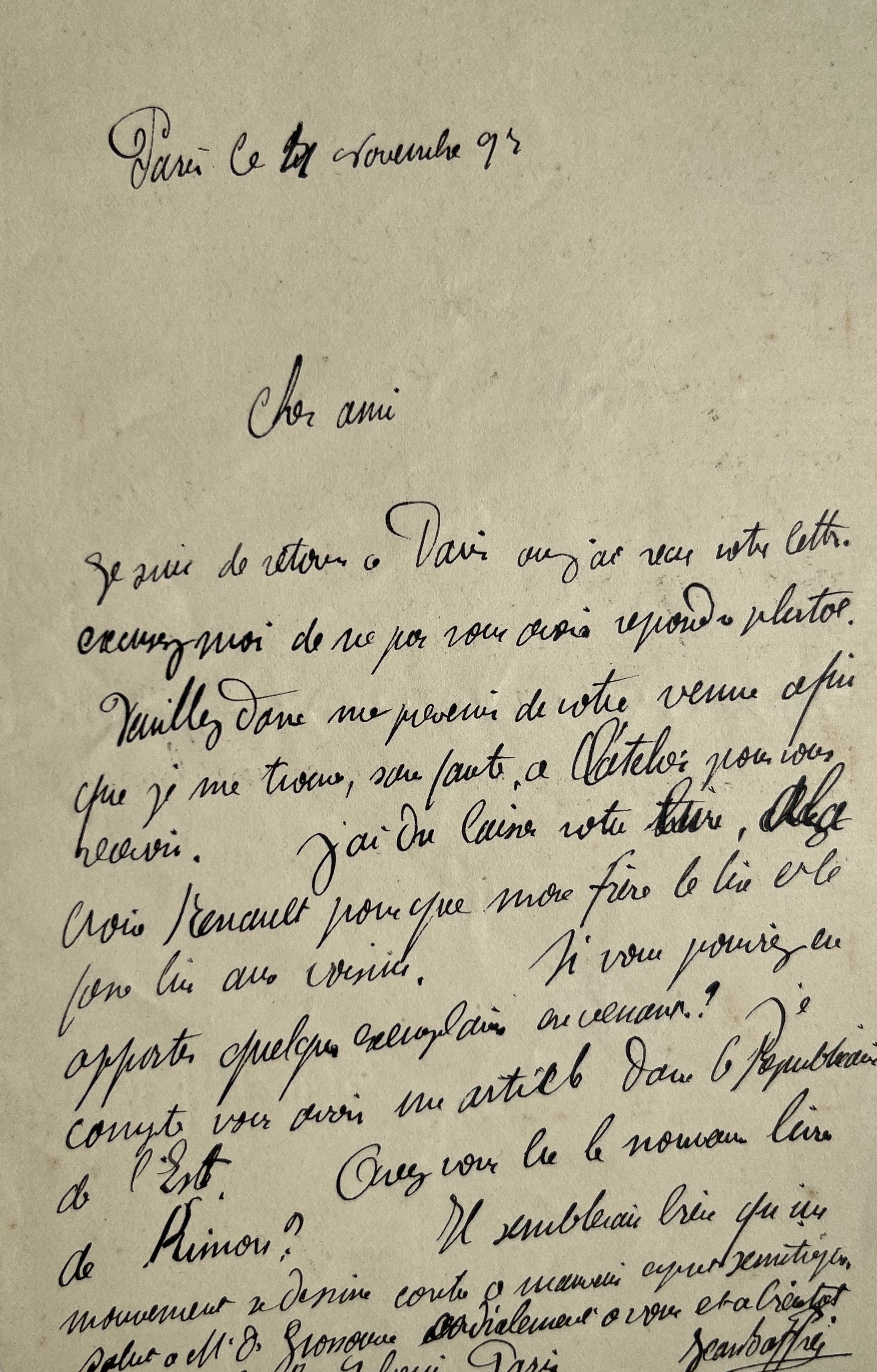 "Je suis de retour à Paris ou j'ai reçu votre lettre. Excusez moi de ne pas vous avoir répondu plus tôt. Veuillez donc me prévenir de votre venue afin que je me tienne sans faute à l'atelier pour vous recevoir. J'ai dû laisser votre livre à la Croix Renault pour que mon frère le lise et le fasse lire aux voisins. Si vous pouviez en apporter quelques exemplaires en venant ? Je compte vous devoir un article dans le Républicain de l'Est. Avez-vous lu le nouveau livre de Rimon ? Il semblerait bien qu'un mouvement se dessine contre ce mauvais esprit sémitique. Salut à M. de Grossouvre [...]".