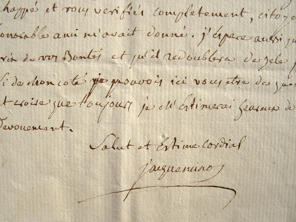 Jacqueminot adresse toute sa gratitude et sa reconnaissance pour le service que lui a rendu son correspondant. «Déjà l'estimable amiral Villaret [de Joyeuse] avait eu la bonté de m'assurer que je pouvais compter sur vos soins [...]».