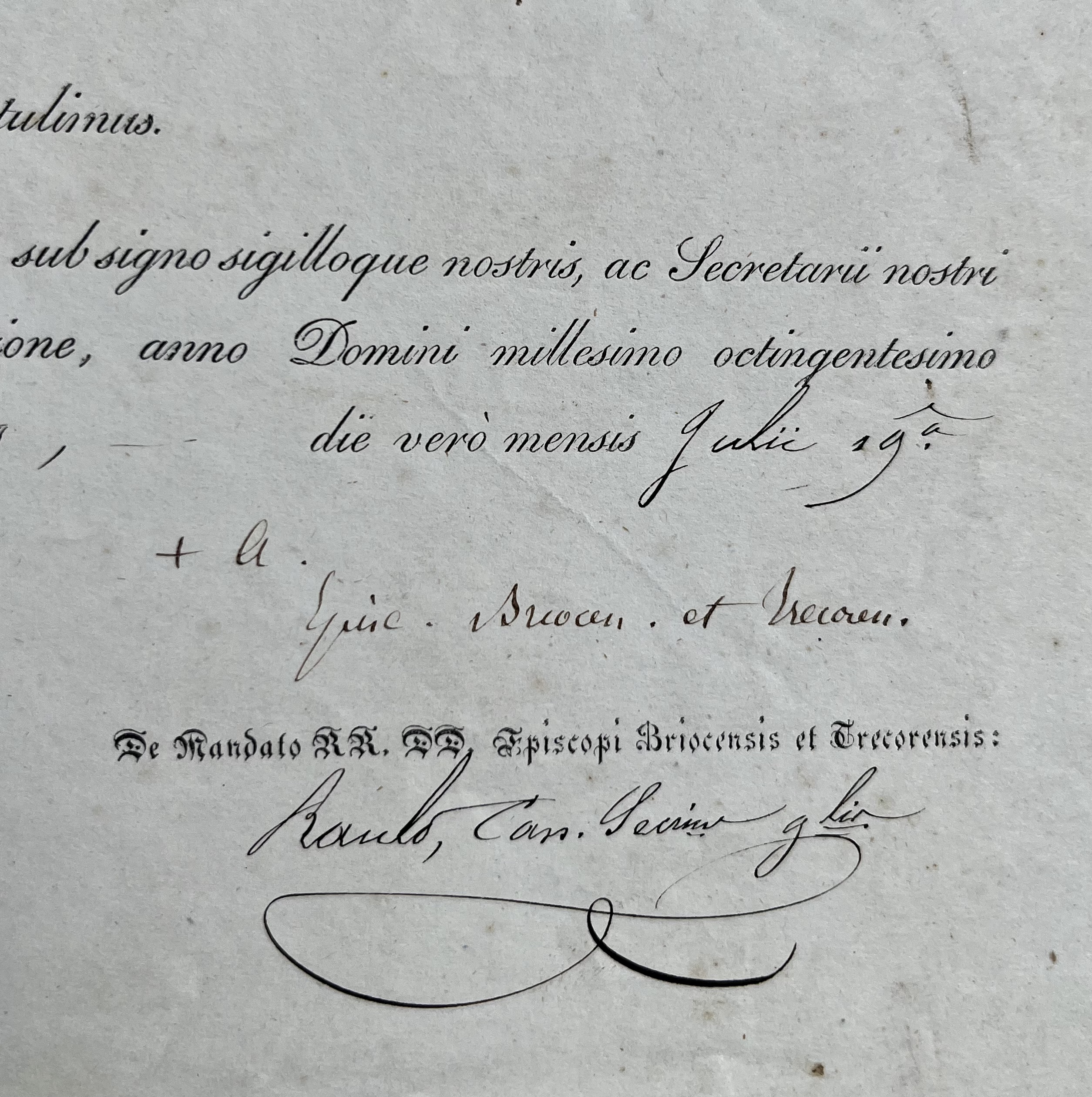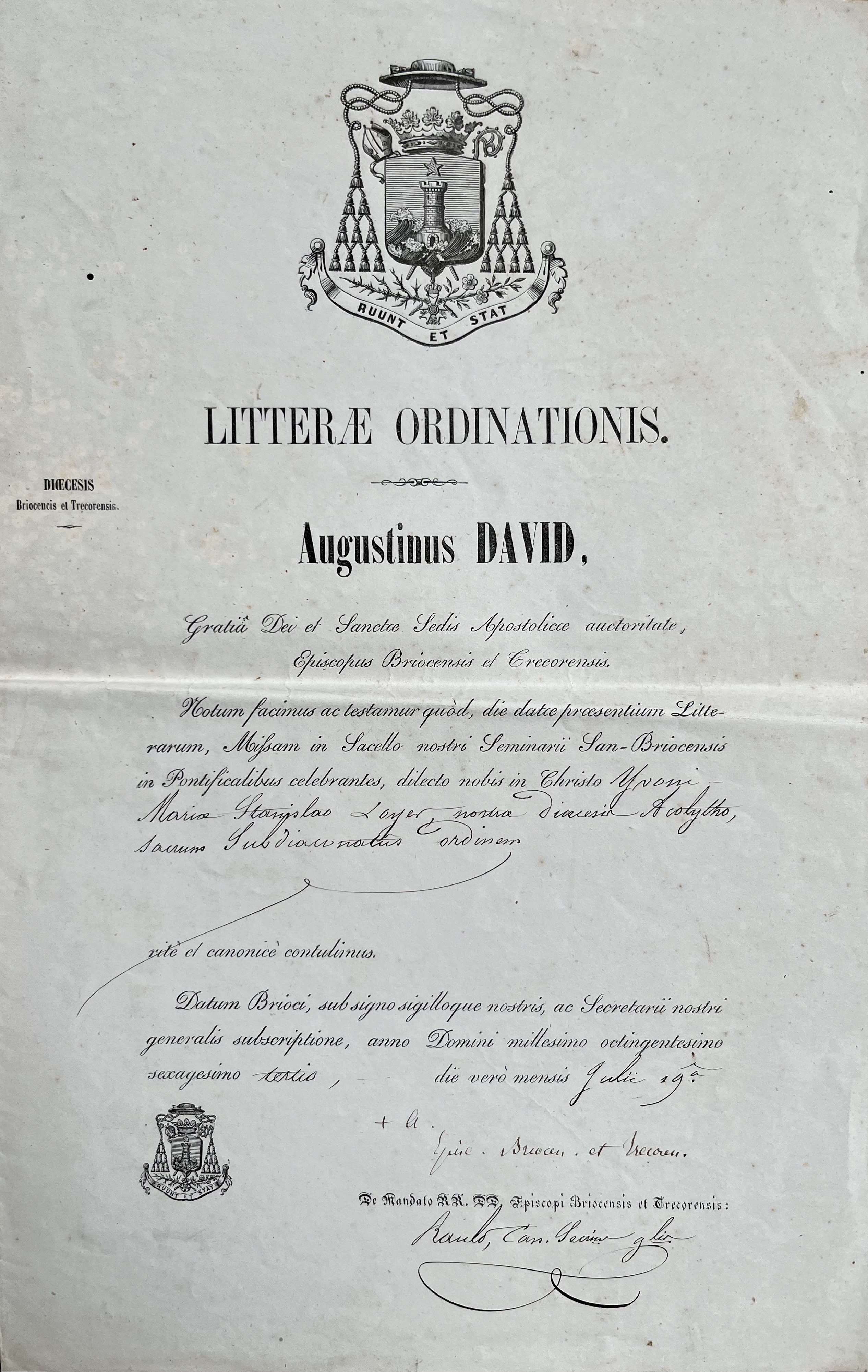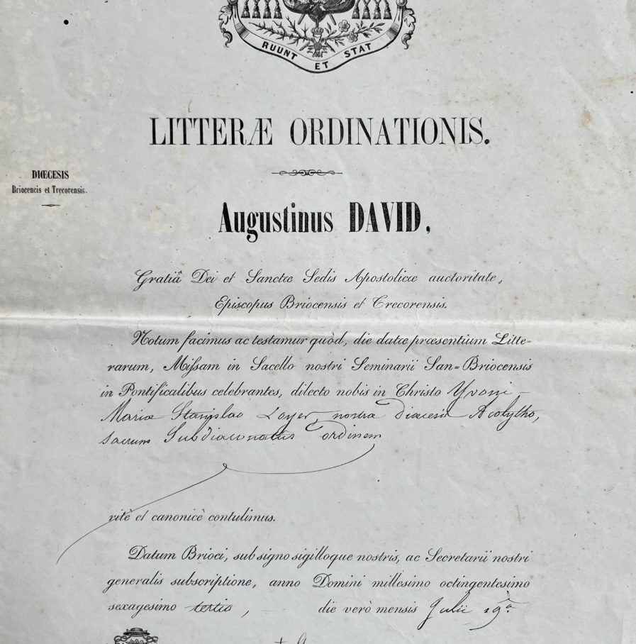 Il est joint sa lettre d'ordination, signée par l'évêque de Saint-Brieuc.