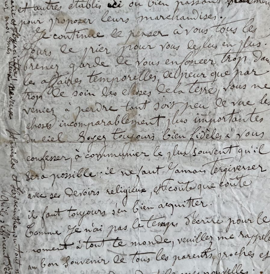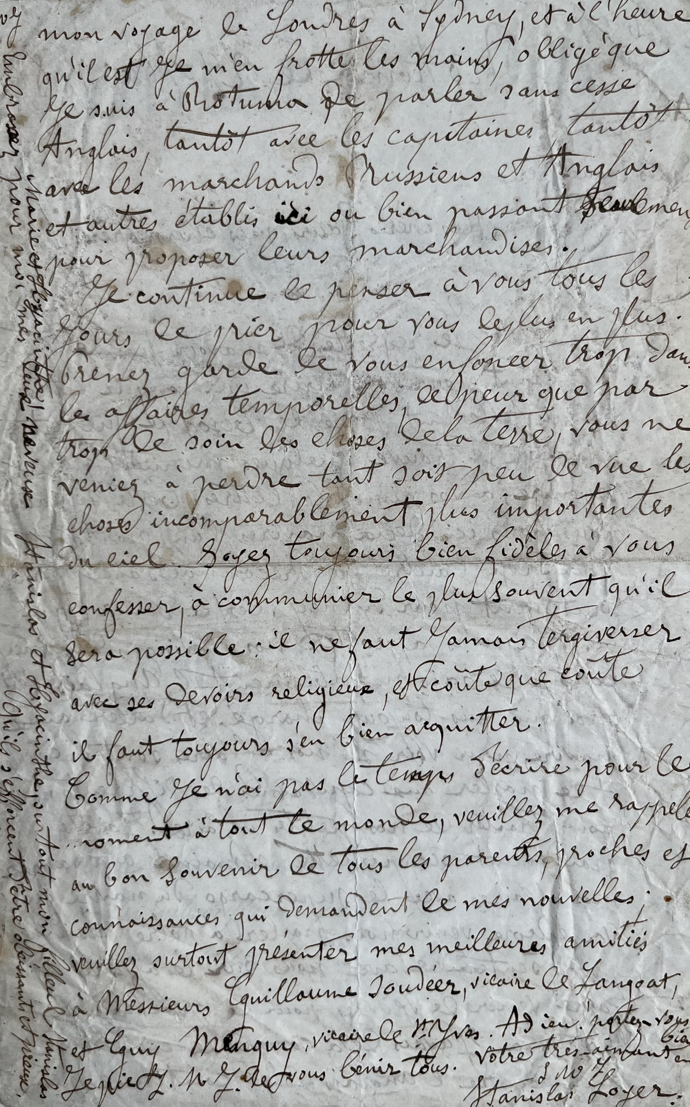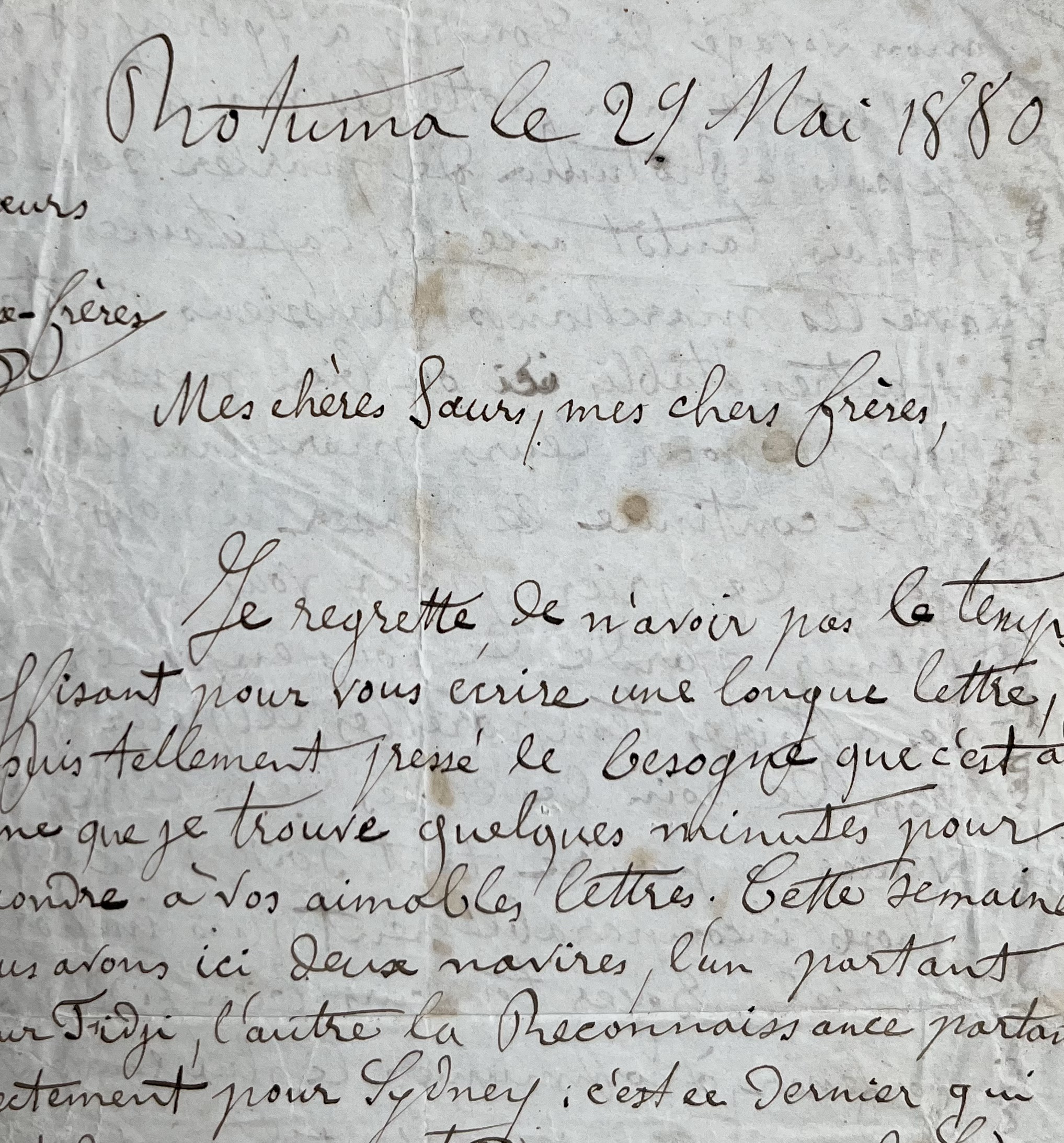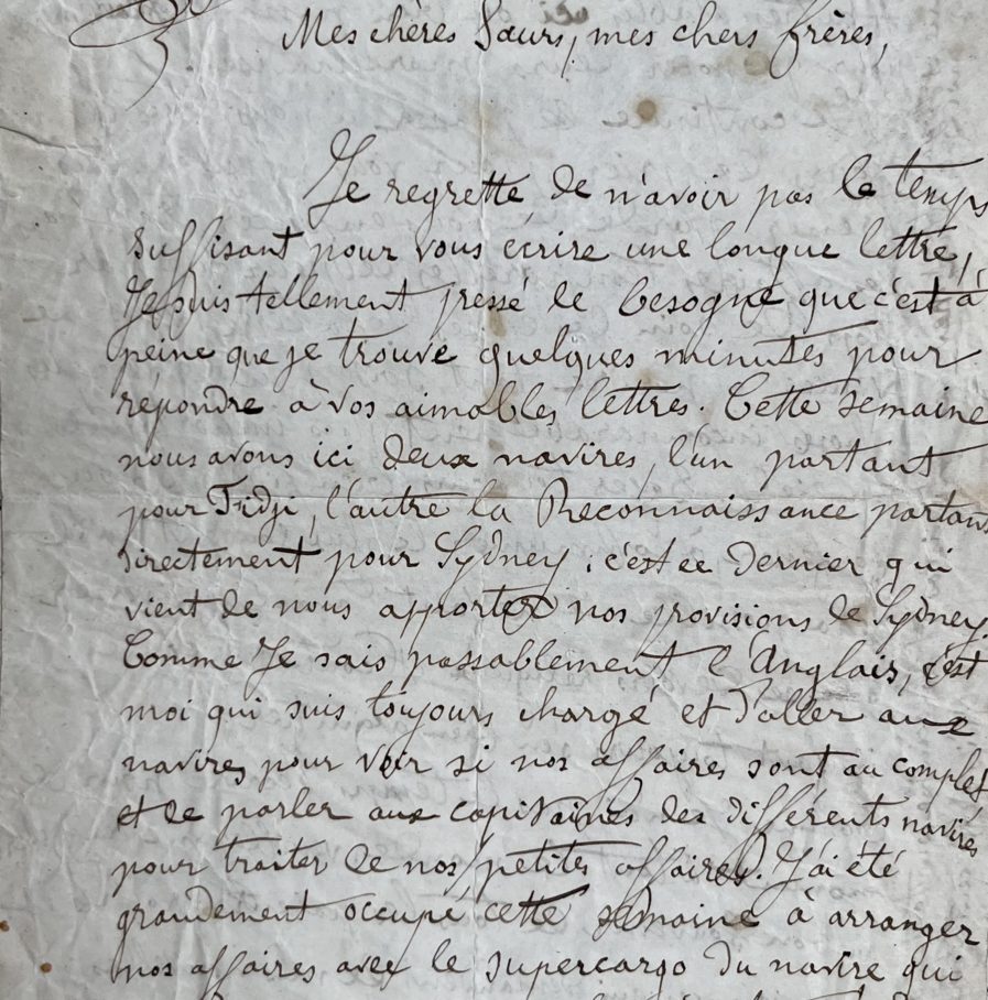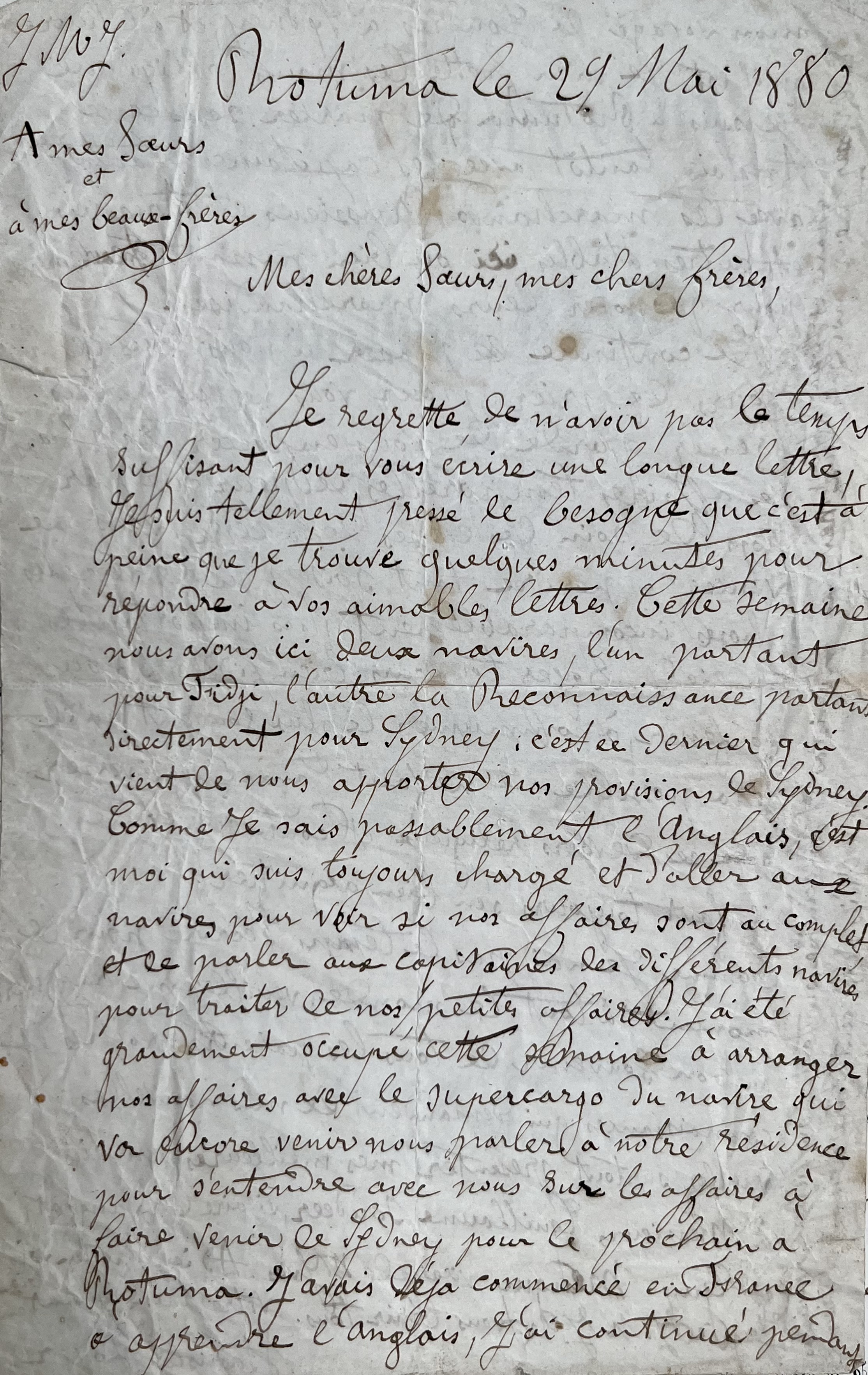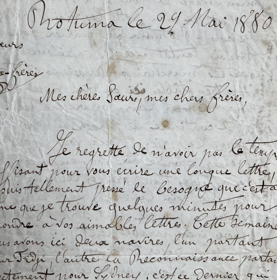 Il regrette de n'avoir pas le temps nécessaire pour l'écriture d'une longue lettre. « Je suis tellement pressé de besogne que c'est à peine si je trouve quelques minutes pour répondre à vos aimables lettres. Cette semaine nous avons eu ici deux navires, l'un partant pour Fidji, l'autre, La Reconnaissance, partant directement pour Sydney; c'est ce dernier qui vient de nous apporter nos provisions de Sydney. Comme je sais passablement l'anglais, c'est moi qui suis toujours chargé d'aller aux navires pour voir si nos affaires sont au complet et de parler aux capitaines des différents navires pour traiter de nos petites affaires. J'ai été grandement occupé cette semaine à arranger nos affaires avec le supercargo […]. J'avais déjà commencé en France à apprendre l'anglais, j'ai continué pendant mon voyage de Londres à Sydney, et à l'heure qu'il est, je m'en frotte les mains, obligé que je suis à Rotuma de parler sans cesse anglais, tantôt avec les capitaines tantôt avec les marchands prussiens et anglais […]. Je continue de penser à vous tous les jours, de prier pour vous de plus en plus. Prenez garde de vous enfoncer trop dans les affaires temporelles […] ».