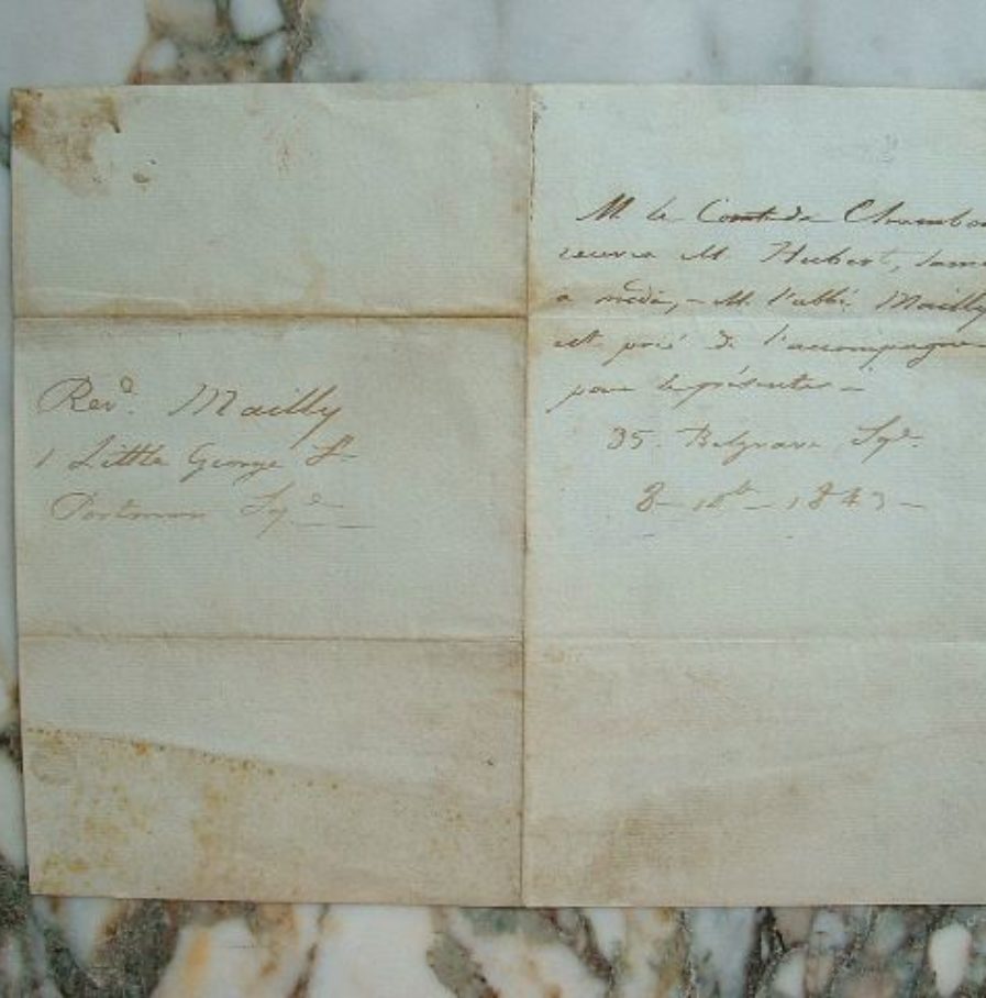 Lettre (non autographe) écrite au nom du comte de Chambord, alors à Londres. "M. le comte de Chambord recevra M. Hubert, samedi à midi, M. l'abbé Mailly est prié de l'accompagner pour le présenter". Ecrite du 35 Belgrave sq.