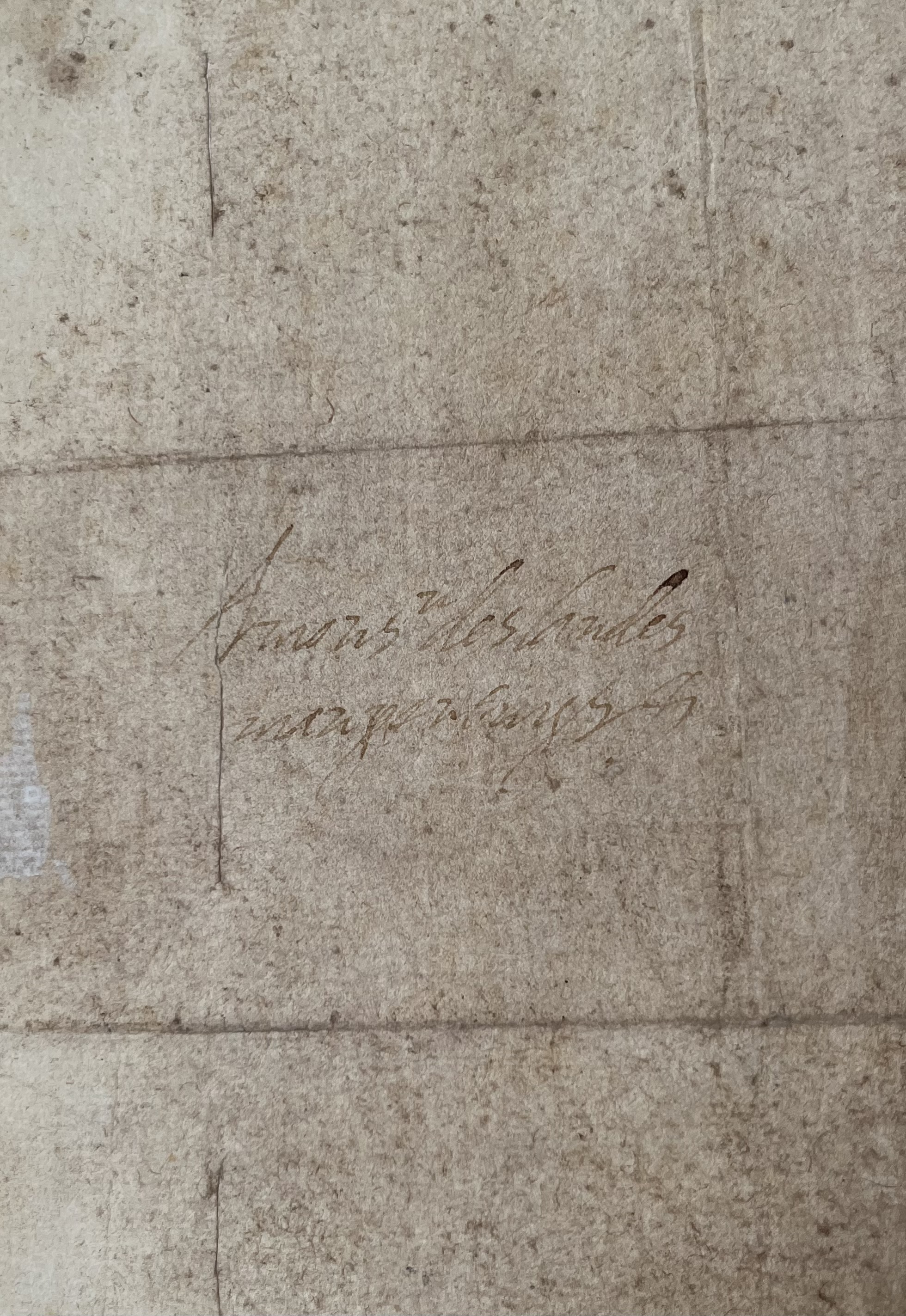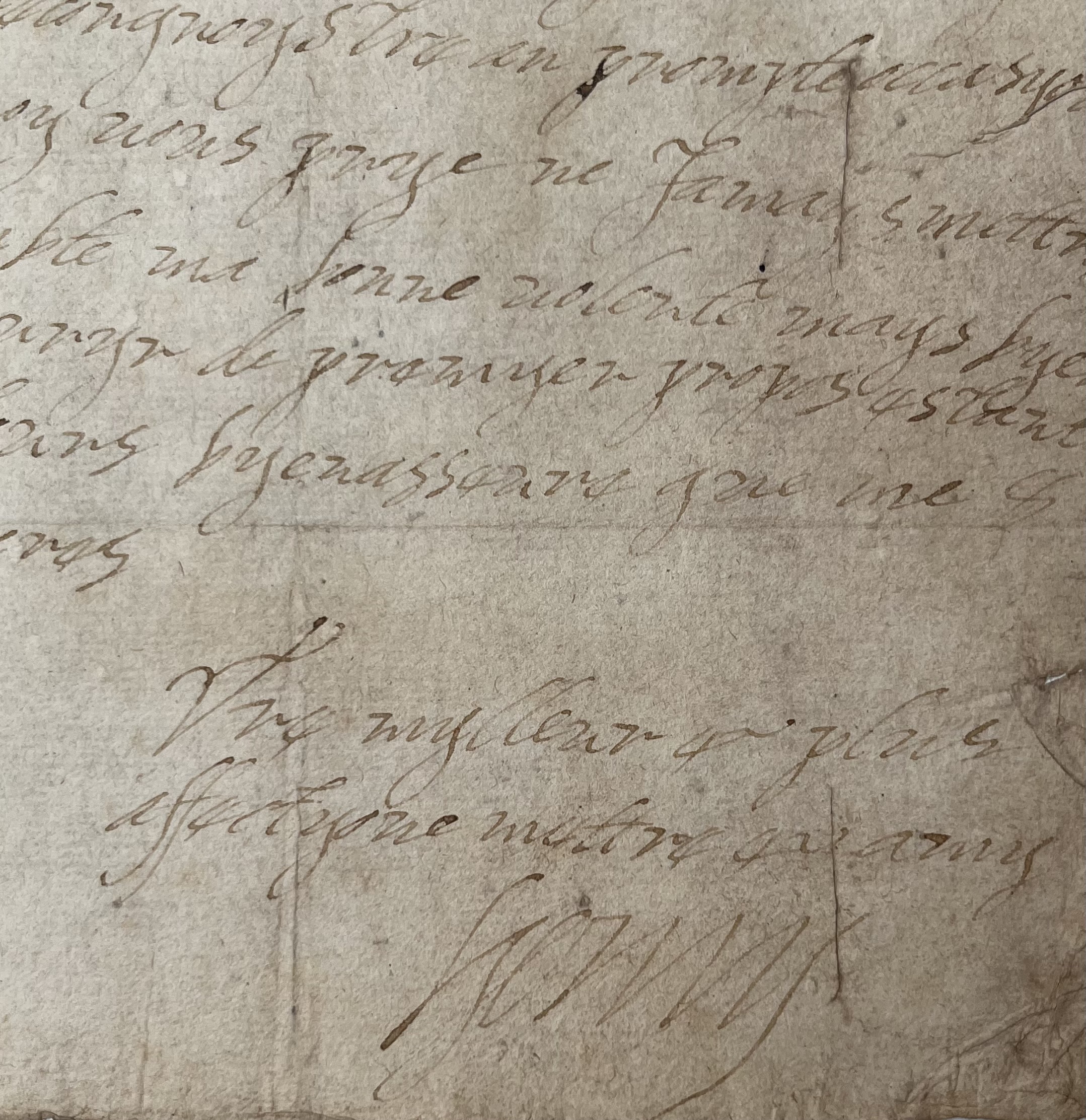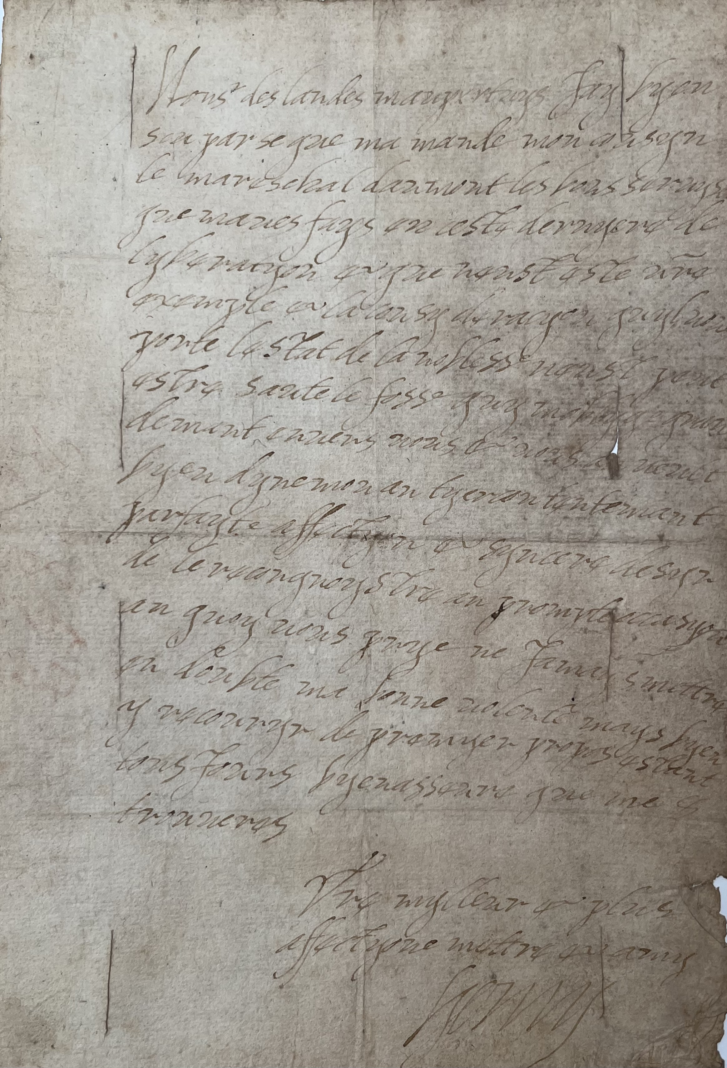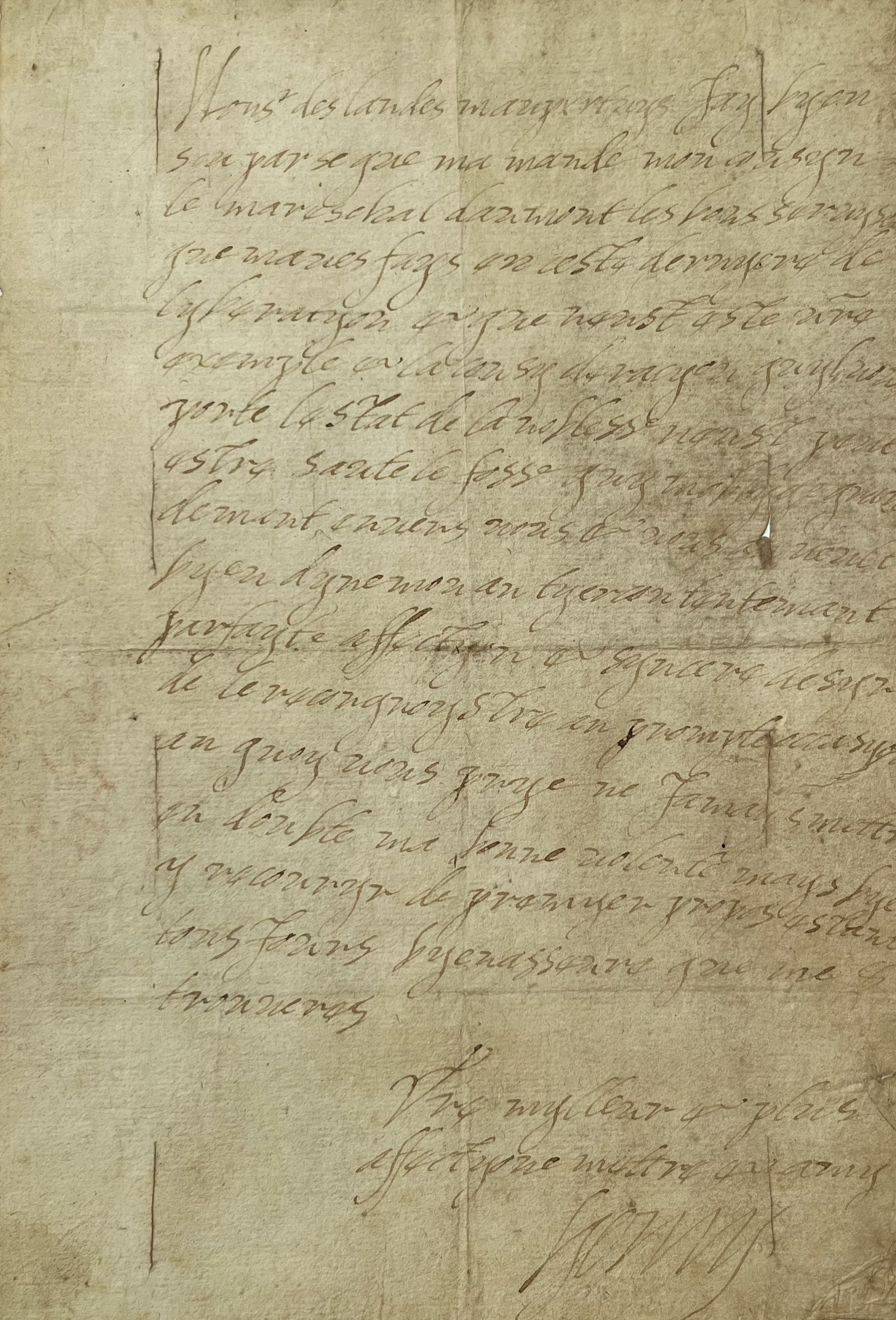 "Mons Deslandes Maupertuys Jay bien seu par se que ma mandé mon cousyn le mareschal d'Aumont [Jean d'Aumont (1522-1595)] les bons servyses que maves fays en ceste dernyere delyberacyon [des États de Bretagne] et que neust est vostre exemple et la consyderacyon quyl vous porte lestat de la noblesse neust peut estre sauté le fossé, quy moblyge grandement envers vous et vous en veult bien dyre mon antyer contentemant parfayte affectyon et syncere desyr de le recongnoystre en prompte occasyon. An quoy vous prye ne jamays mettre en doubte ma bonne volonté mays byen y recouryr de premyer propos estant toujours byen asseure que me trouveres Vostre meilleur et plus affectionné maistre et amy, Henry".