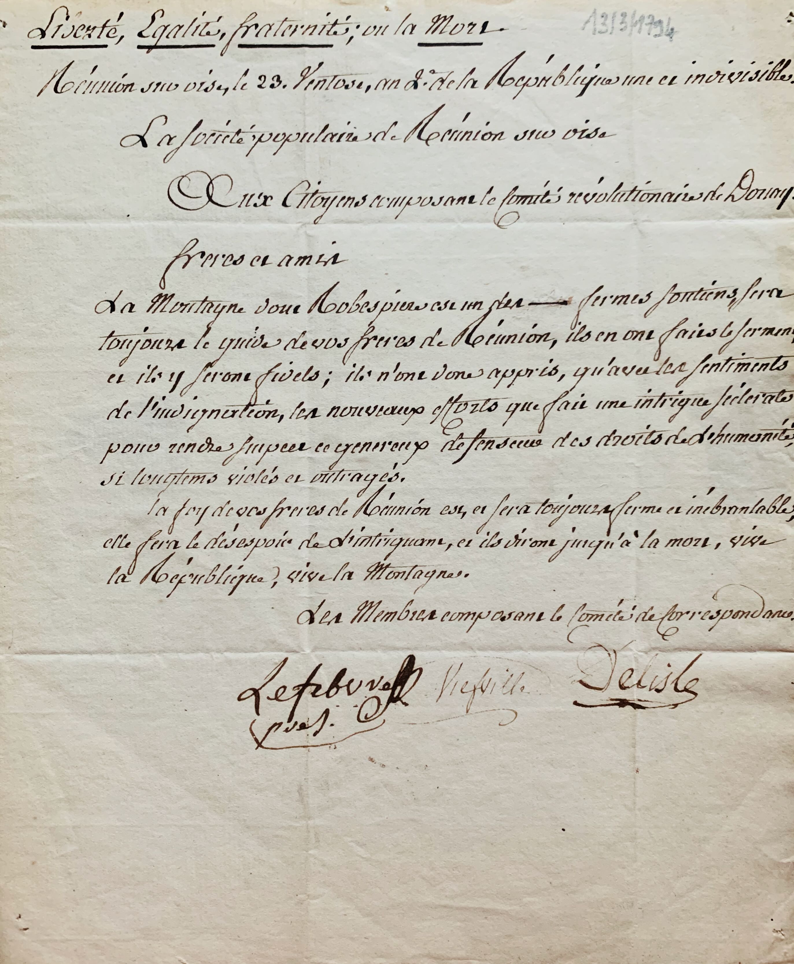"Frères et ami, la Montagne dont Robespierre est un des fermes soutiens, sera toujours le guide de vos frères de Réunion, ils en ont fait le serment, et il y seront fidèles ; ils n'ont donc appris, qu'avec les sentiments de l'indignation, les nouveaux efforts que fait une intrigue scélérate pour rendre suspect ce généreux défenseur des droits de l'humanité, si longtemps violés et outragés.