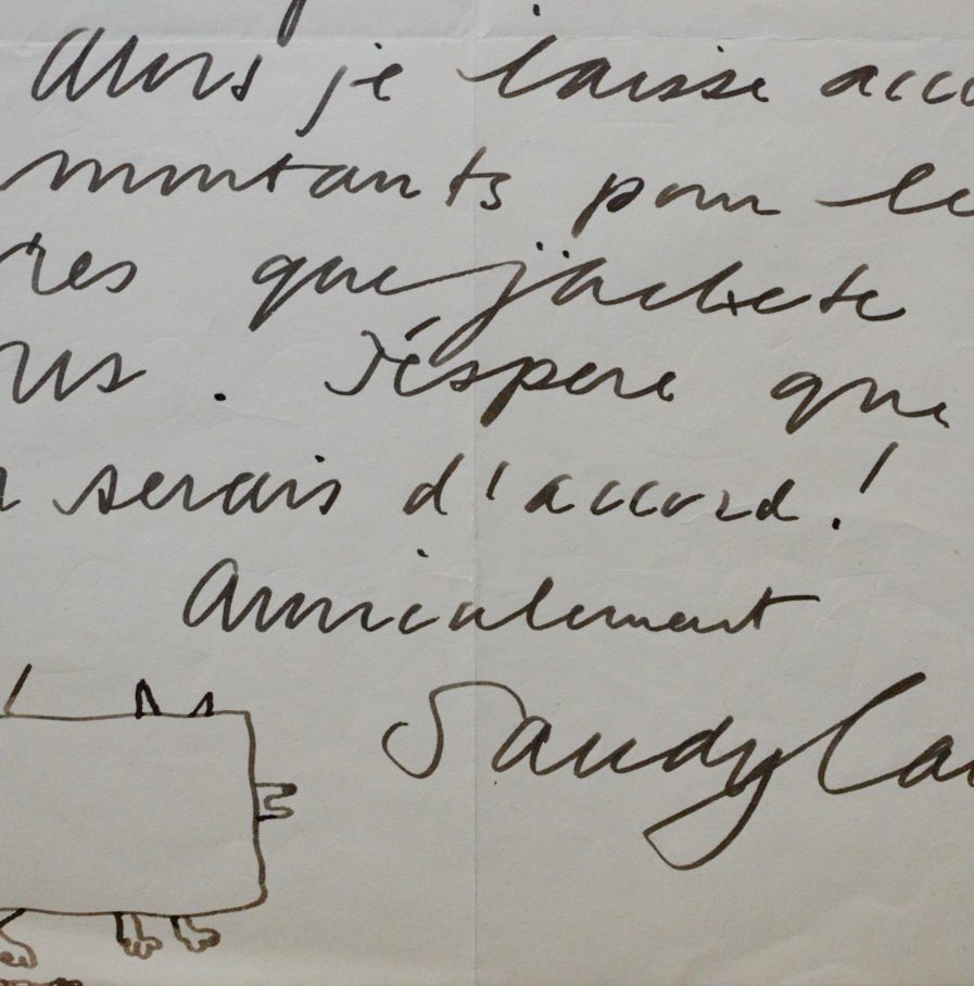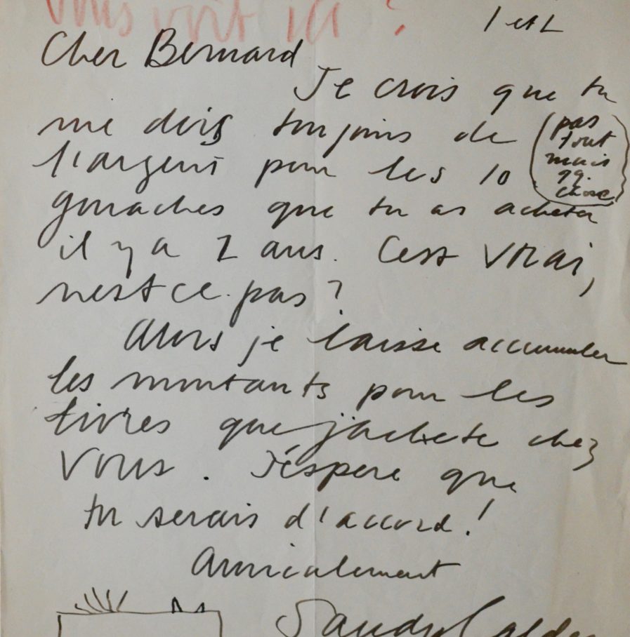 "Cher Bernard. Je crois que tu me dois toujours de l'argent pour les 10 gouaches que tu as acheter [sic] il y a 2 ans (pas tout mais qq. chose). C'est vrai n'est-ce pas ? Ainsi je laisse accumuler les montants pour les livres que j'achète chez vous. J'espère que tu serais d'accord ?". Calder ajoute au crayon rouge, en tête "Quand est-ce qu'on vous voit ici ?" et dessine un chien urinant caché derrière un panneau blanc.