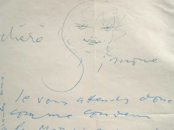 Marcel Vertès donne rendez-vous à Simone Simon cher Maxim's, «He costume foncé, She épaules nues». Il illustre sa lettre d'un portrait de Simone Simon dans le S de son prénom.
