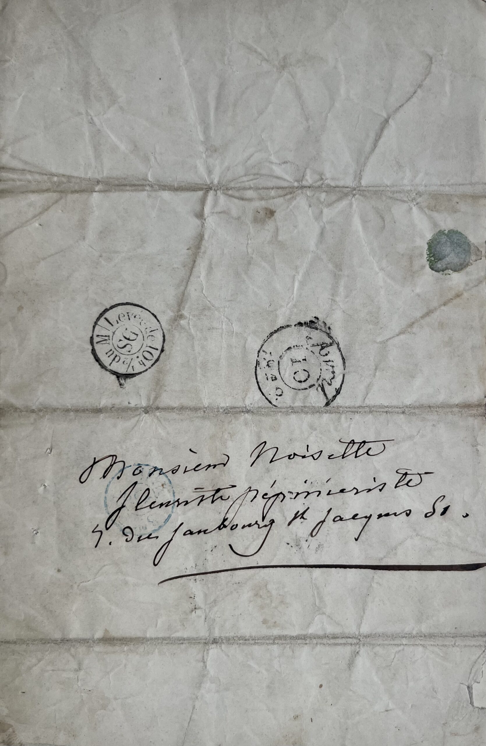 "J'ai bien des remerciements à vous faire, Monsieur. Les arbres ont été reçus en bon état et plantés. Veuillez envoyer chez moi pour faire toucher ce que je vous dois. Je vous demande pardon de ne pas vous l'envoyer. Mon domestique est un paysan qui ne connait pas les rues, et j'ai tant d'occupations avant mon départ que malgré mon désir d'aller revoir vos belles fleurs qui sentent si bon, je ne pourrai pas faire ce petit voyage".