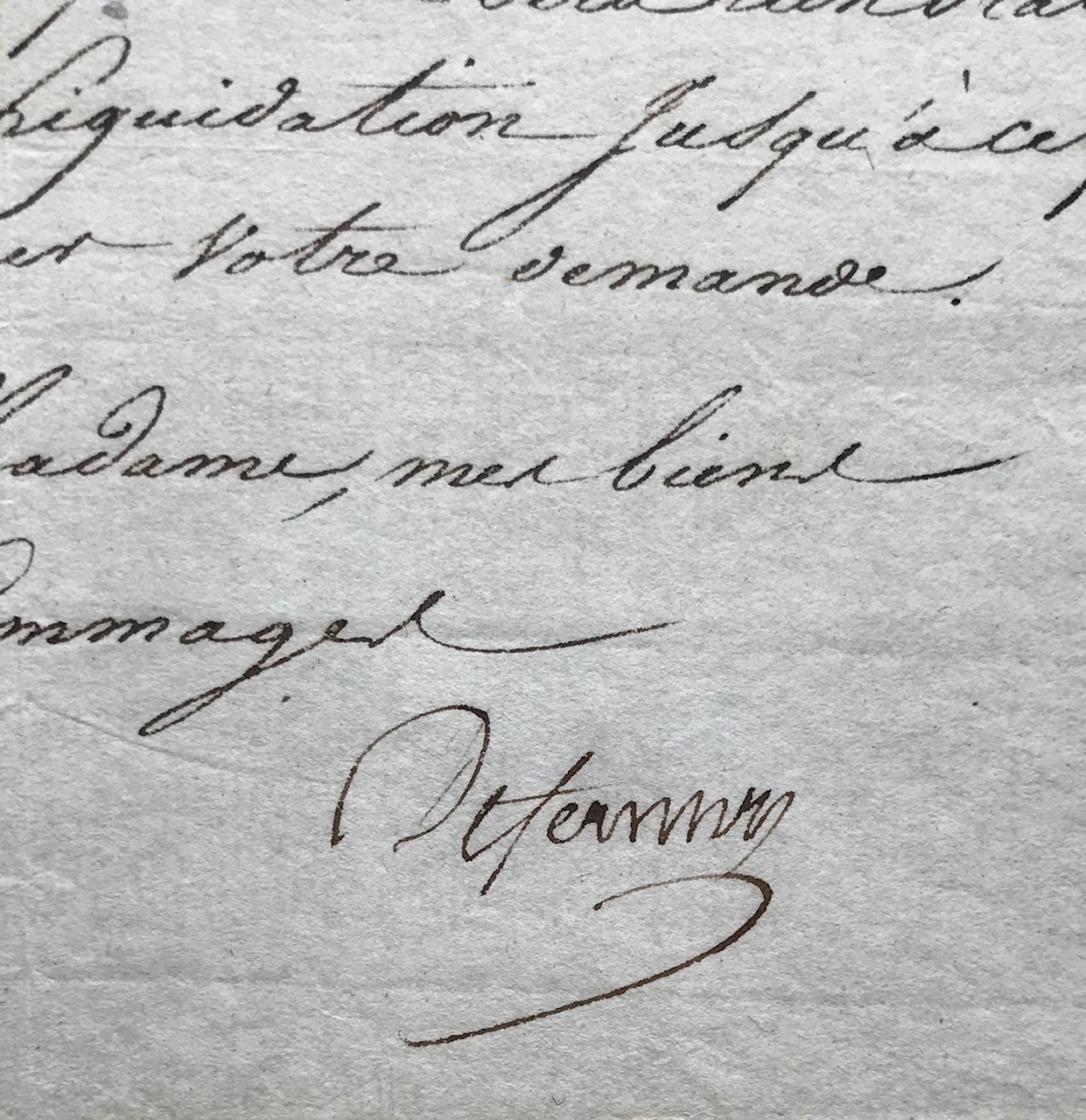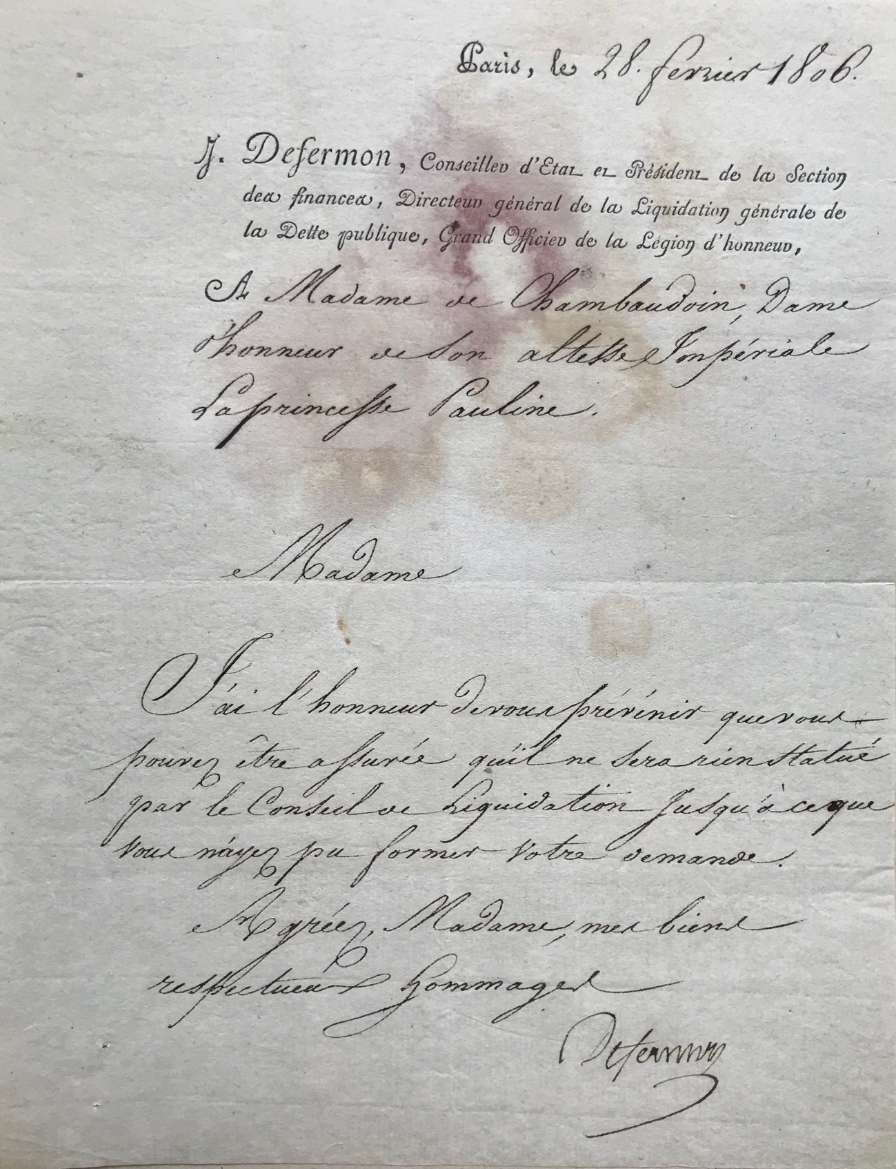Lettre de Jacques Defermon, alors directeur général du Conseil de la liquidation de la dette publique, adressée à la baronne de Chambaudoin, "Dame d'honneur de son altesse Impériale la Princesse Pauline".