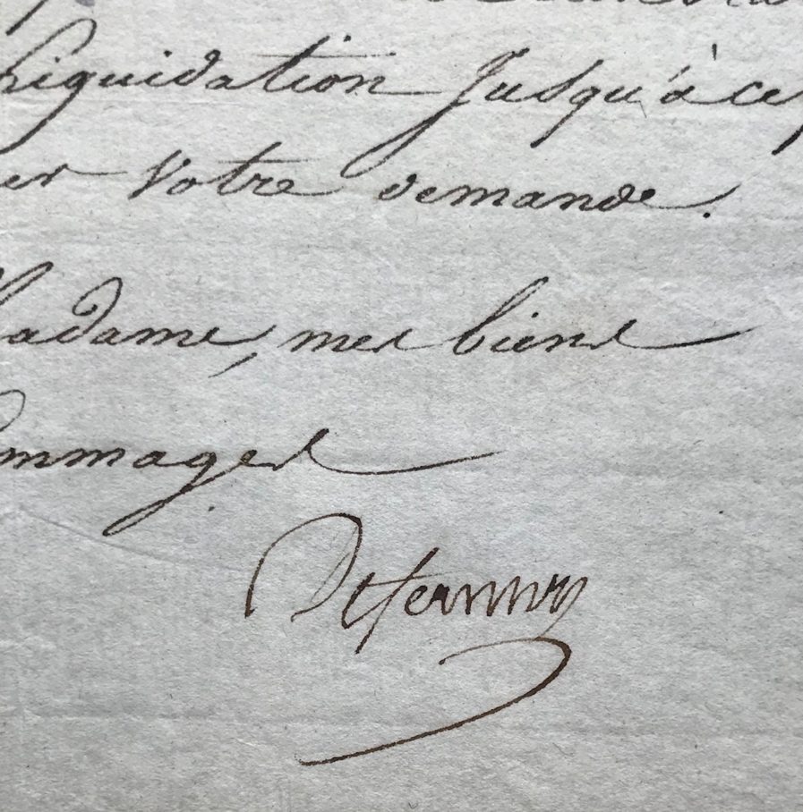 Encre brune sur papier vergé filigrané. En-tête imprimé "J. Defermon, conseiller d’État et président de la section des Finances, Directeur général de la Liquidation générale de la dette publique, Grand Officier de la Légion d'honneur".