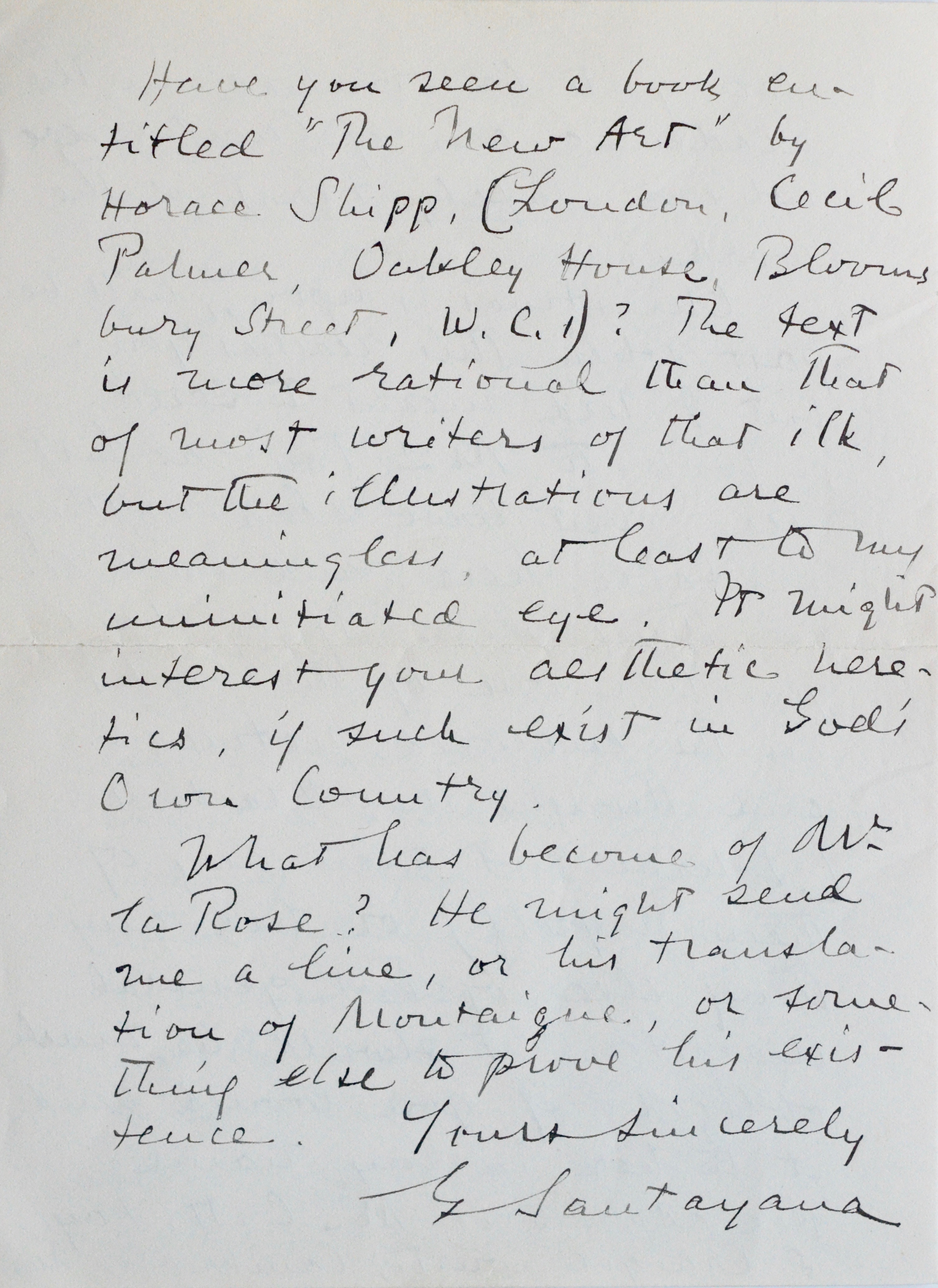 Accablé par le poids de deux gros livres envoyé par Firnski, Santayana lui demande ne ne plus lui envoyer d'ouvrages sans importance. Il évoque ensuite l'ouvrage After the death of Lenin, de Max Eastman et demande qu'on lui envoie et évoque la République de Platon et une traduction de Montaigne. "[...] Can you send me Eastman's book, or is it too incendiary to be touched in the academic air of Cambridge, where Safety first is the word?". Santayana commande et commente certains ouvrage, comme The New Art, d'Horace Shipp "the text is more rational than that of mort writers of that ilk, but the illustrations are meaningless [...]".