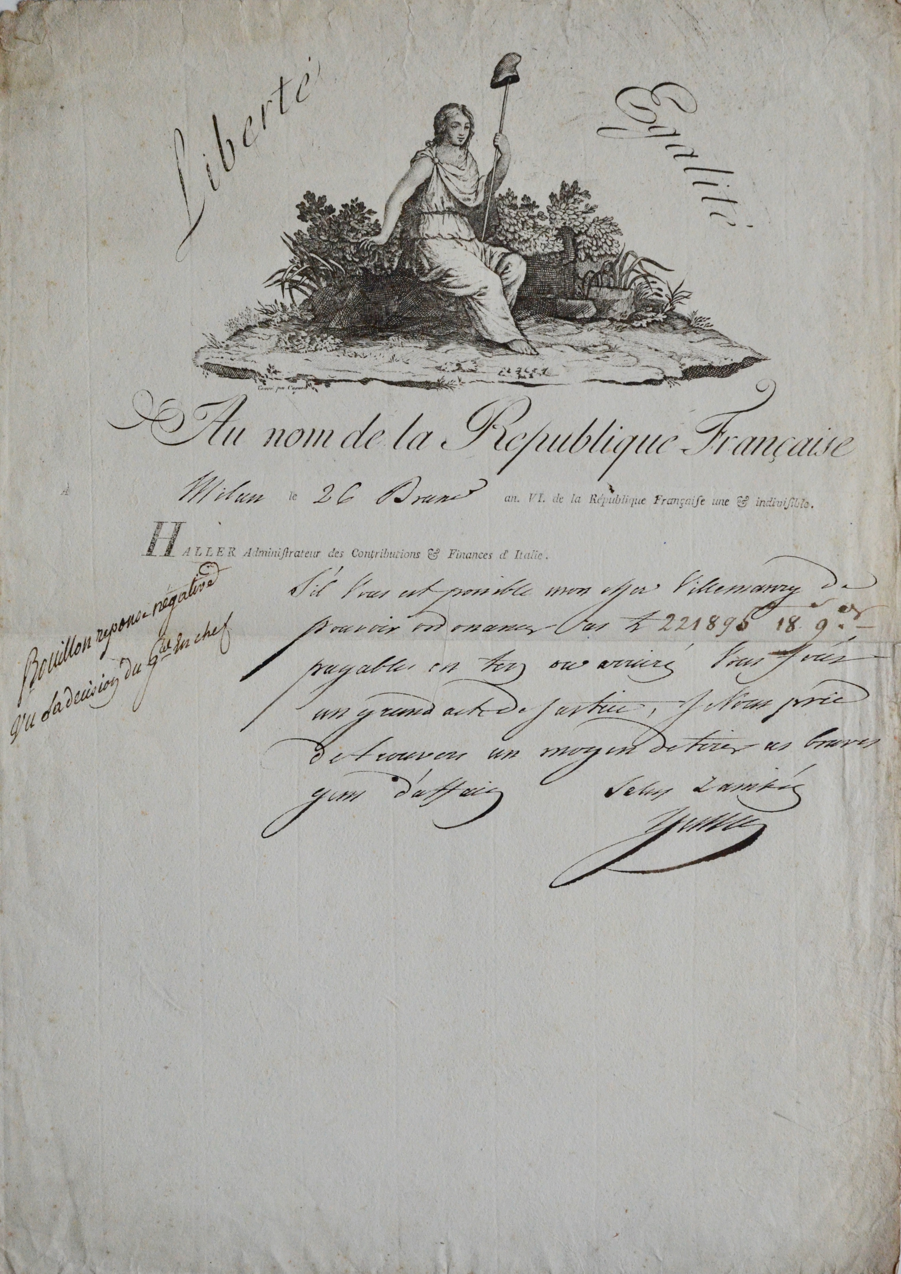 Lettre de l'administrateur des contributions et finances d'Italie, Emanuel von Haller, ornée de sa grande et superbe vignette emblématique gravée par Cagnoni [Boppe et Bonnet, p. 102, non reproduite]
