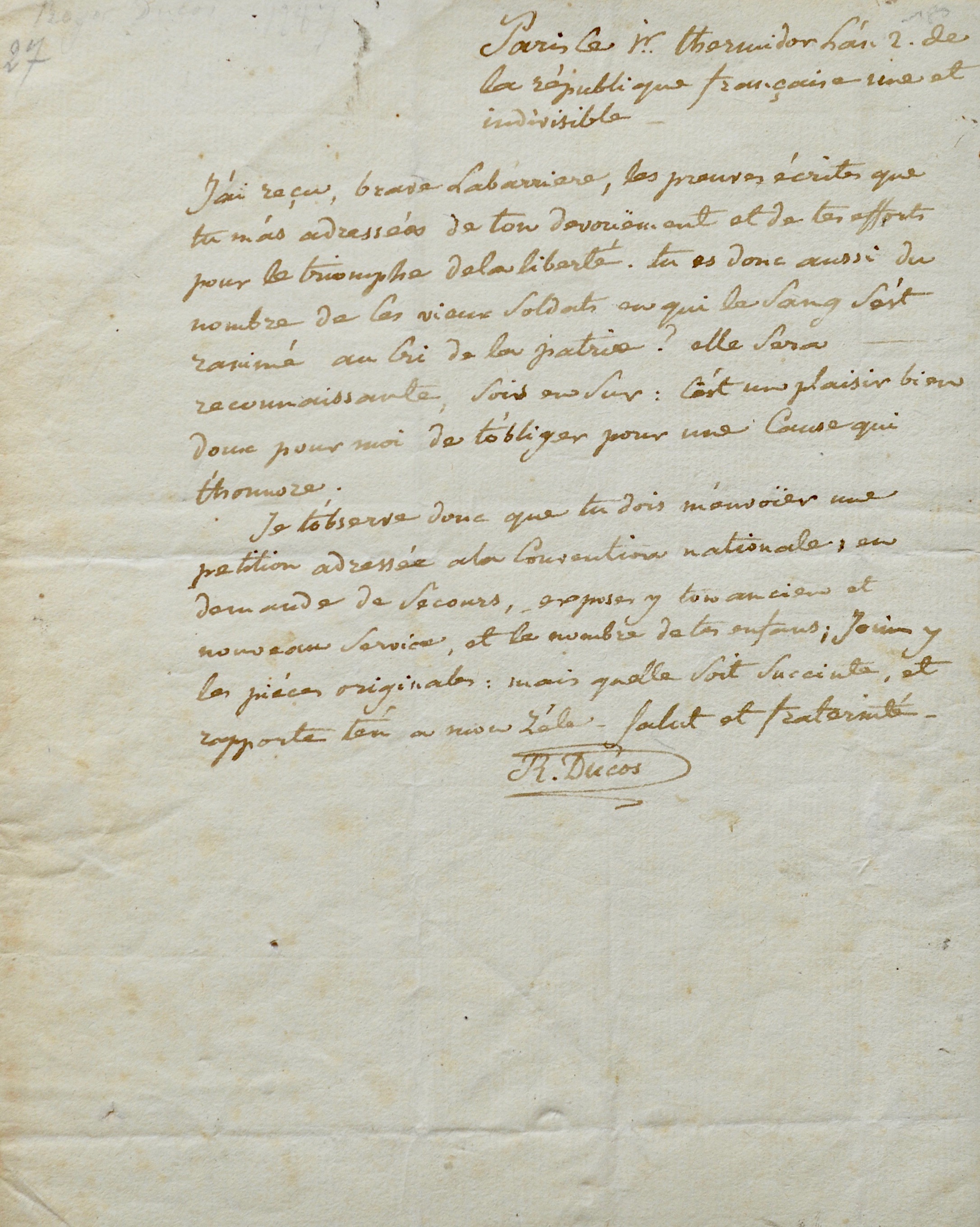Lettre du 1er thermidor an 2 à son compatriote Pierre Louis Labarrière "ancien volontaire au 3è bataillon des Landes, à Dax", pleine d'exaltation et teintée d'idéaux révolutionnaires. "J'ai reçu, brave Labarrière, les preuves écrites que tu m'as adressées de ton dévouement et de tes efforts pour le triomphe de la liberté. Tu es donc aussi du nombre de ces vieux soldats en qui le sang s'est ranimé au cri de la patrie? Elle sera reconnaissante, sois en sur : c'est un plaisir bien doux pour moi de t'obliger pour une cause qui t'honore". Il l'invite à envoyer une pétition à la Convention nationale, dont il lui indique la teneur.