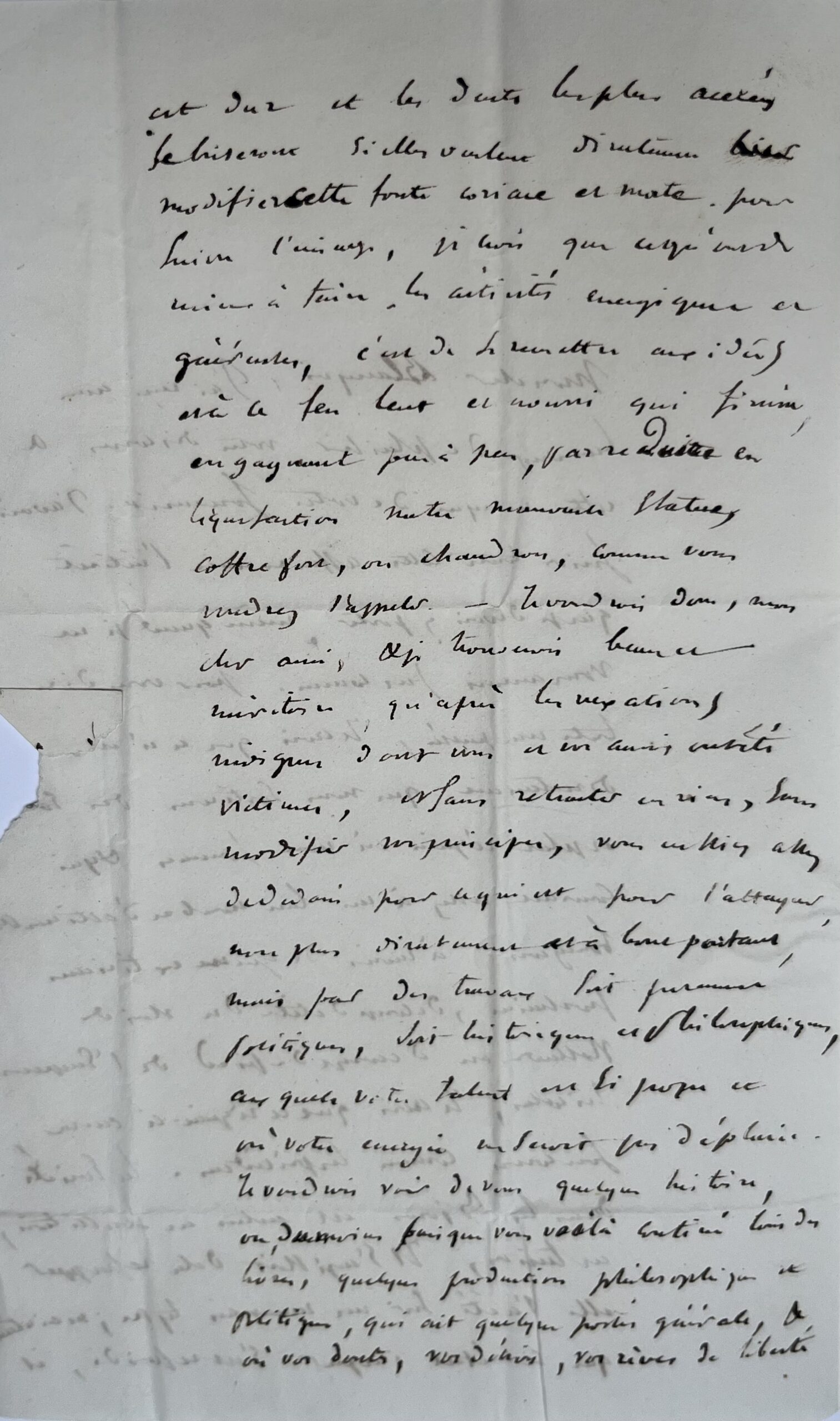 « […] Pour vous dire toute ma pensée, je crois que ce n'est pas directement que nous sortirons du plat régime où nous sommes et qui convient assez à un bon nombre d'estimables bourgeois. A moins de guerre extérieure prochaine, de coup de tête du Roi de Hollande ou d'un coup de pied de l'Empereur Nicolas, je crois que ce régime-ci aura son cours comme les précédents. La société dans les 3 jours est entrée en ébullition, en tension, il s'agissait de la refrapper, elle l'a été sur un mauvais type ; maintenant que ce métal impur s'est refroidi il est dur, et les dents les plus acérées se briseront […]. Je crois que ce qu'on a de mieux à faire […] c'est de se remettre aux idées et à ce feu lent et nourri qui finira, en gagnant peu à peu, par réduire en liquéfaction notre mauvaise statue […]. Je voudrais, après les vexations indignes dont vous et vos amis ont été victimes […] vous eussiez assez de dédain pour ce qui est de l'attaquer, non plus directement et à bout portant, mais par des travaux soit purement politiques, soit historiques et philosophiques, auxquels votre talent est si propre et où votre énergie ne serait pas déplacée. Je voudrais voir de vous quelques histoires ou du moins, puisque vous voilà confiné loin des livres, quelque production philosophique et politique qui ait quelque portée générale & où vos dents, vos désirs, vos rêves de liberté et de bonheur pour les hommes soient consignés avec aussi peu de lumière directe & autant de mépris silencieux que possible. Quant aux heures décisives où l'action est un devoir et où toutes les facultés générales se déploient dans une sublime ivresse, elles reviendront, je le crois, mais ce n'est pas demain encore ».