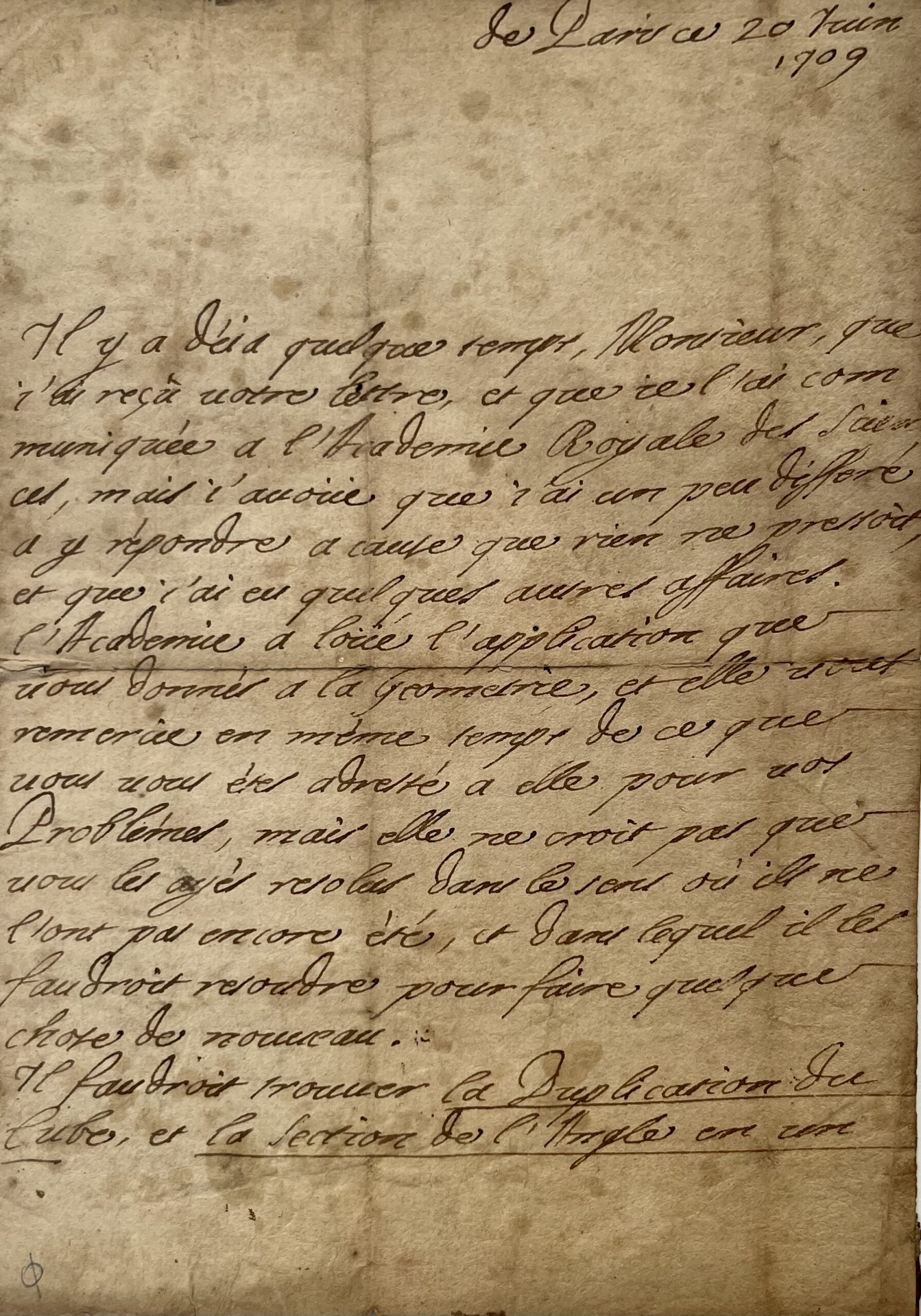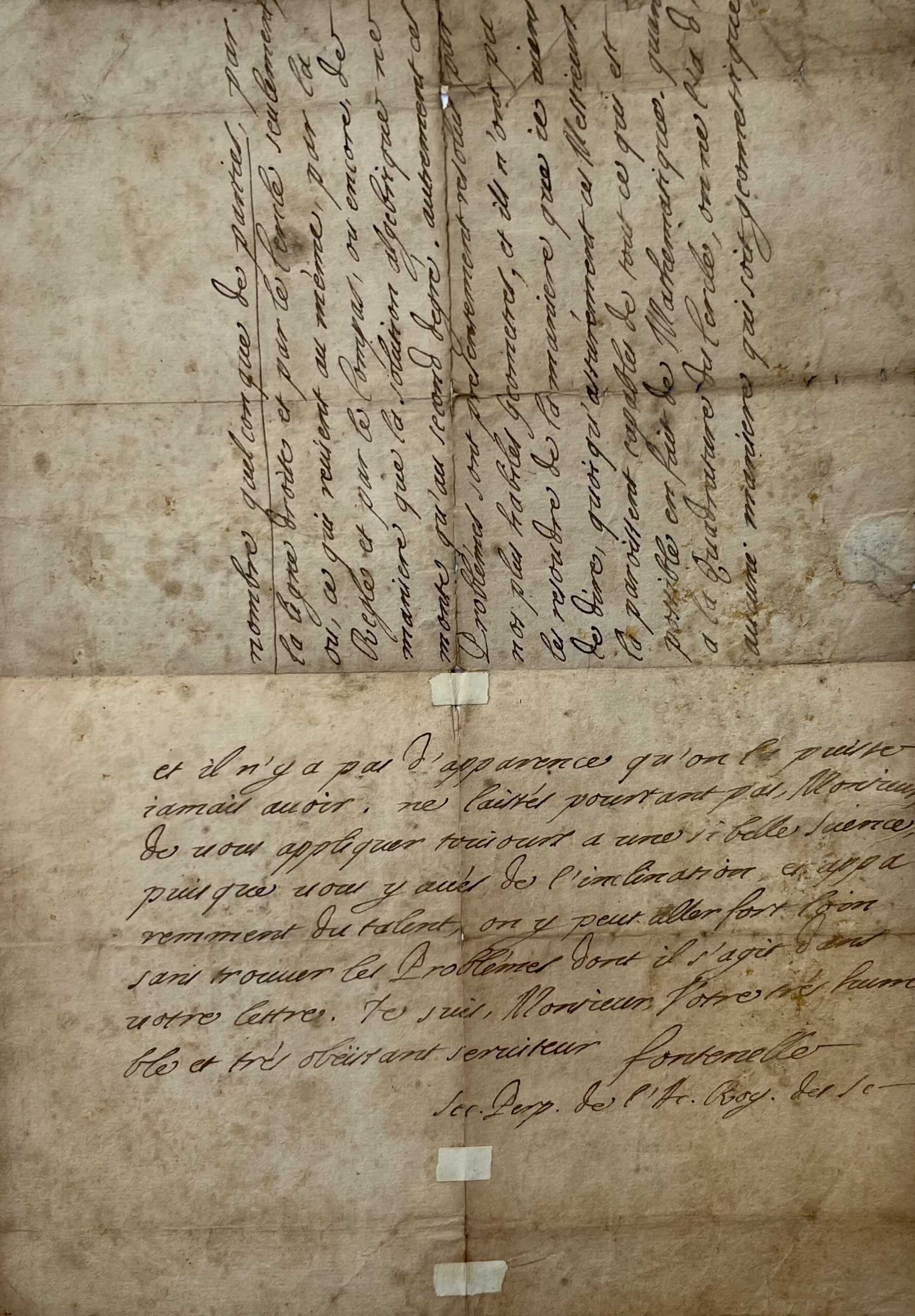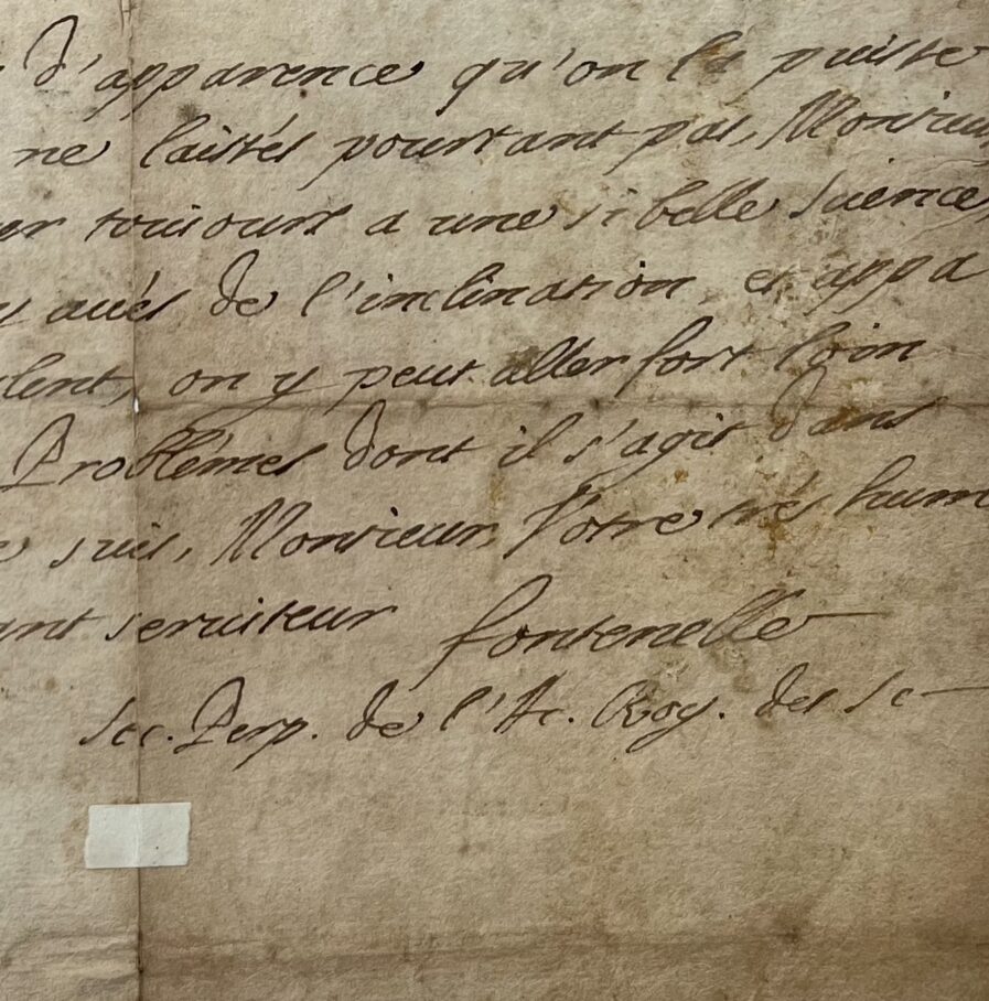 Bernard de Fontenelle (Rouen, 1657/1757)Intéressante lettre scientifique de Fontenelle sur les mathématiques, signée "Fontenelle" comme "Sec. Perp. de l'Ac. Roy. des Sc" [secrétaire perpétuel de l'Académie Royale des Sciences].