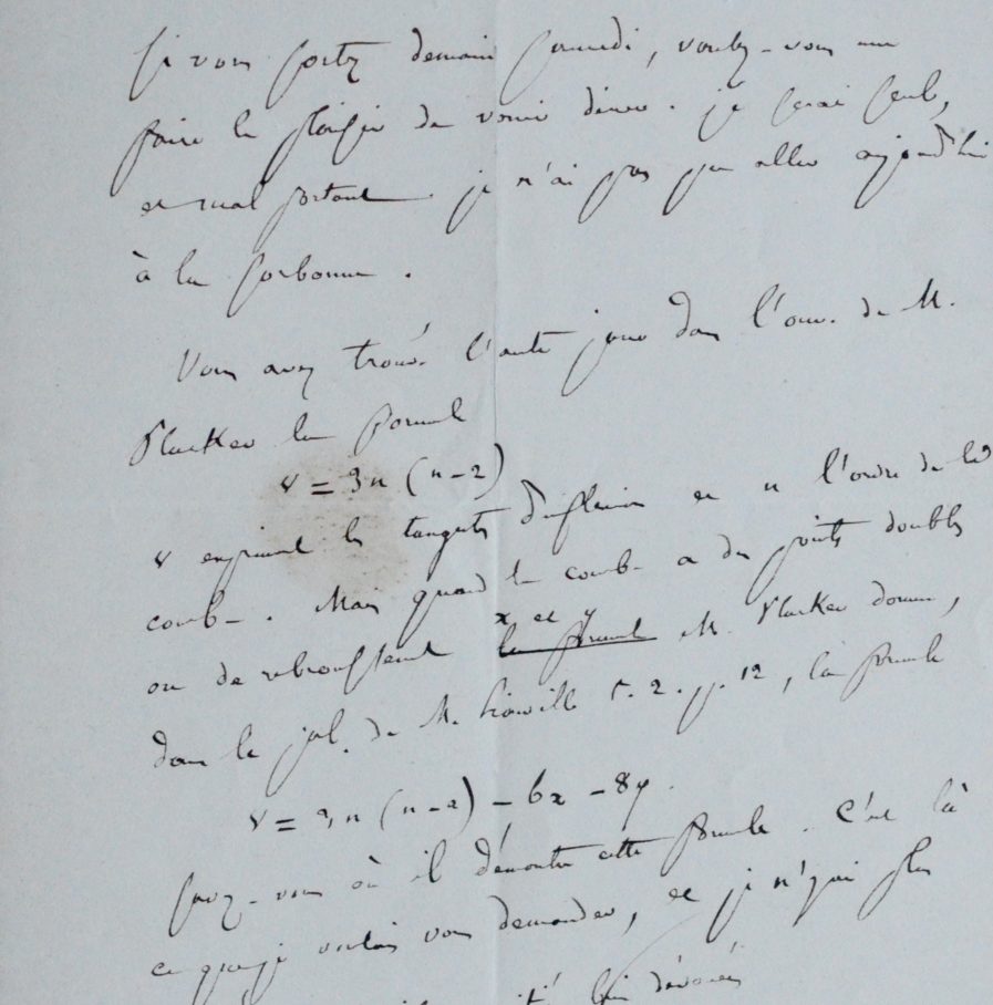 Chasles, "seul et mal portant", invite Bienaymé à dîner, puis l'entretient de formules de mathématiques : "Je n'ai pas pu aller aujourd'hui à la Sorbonne". Il évoque les travaux du mathématicien prussien Julius Plücker () : "Vous avez trouvé l'autre jour dans l'ouv. de M. Plücker la formule v=3n (n-2). V exprime les tangentes d'inflexion et n l'ordre de la courbe. Mais quand la courbe a des points doubles ou de rebroussement x et y M. Plücker donne, dans le j[ourn]al de M. Liouville T.2 p. 12, la formule v=3n (n-2) - 6x - 8y. Savez-vous où il démontre cette formule? C'est là ce que je voulais vous demander, et je n'y ai plus pensé".