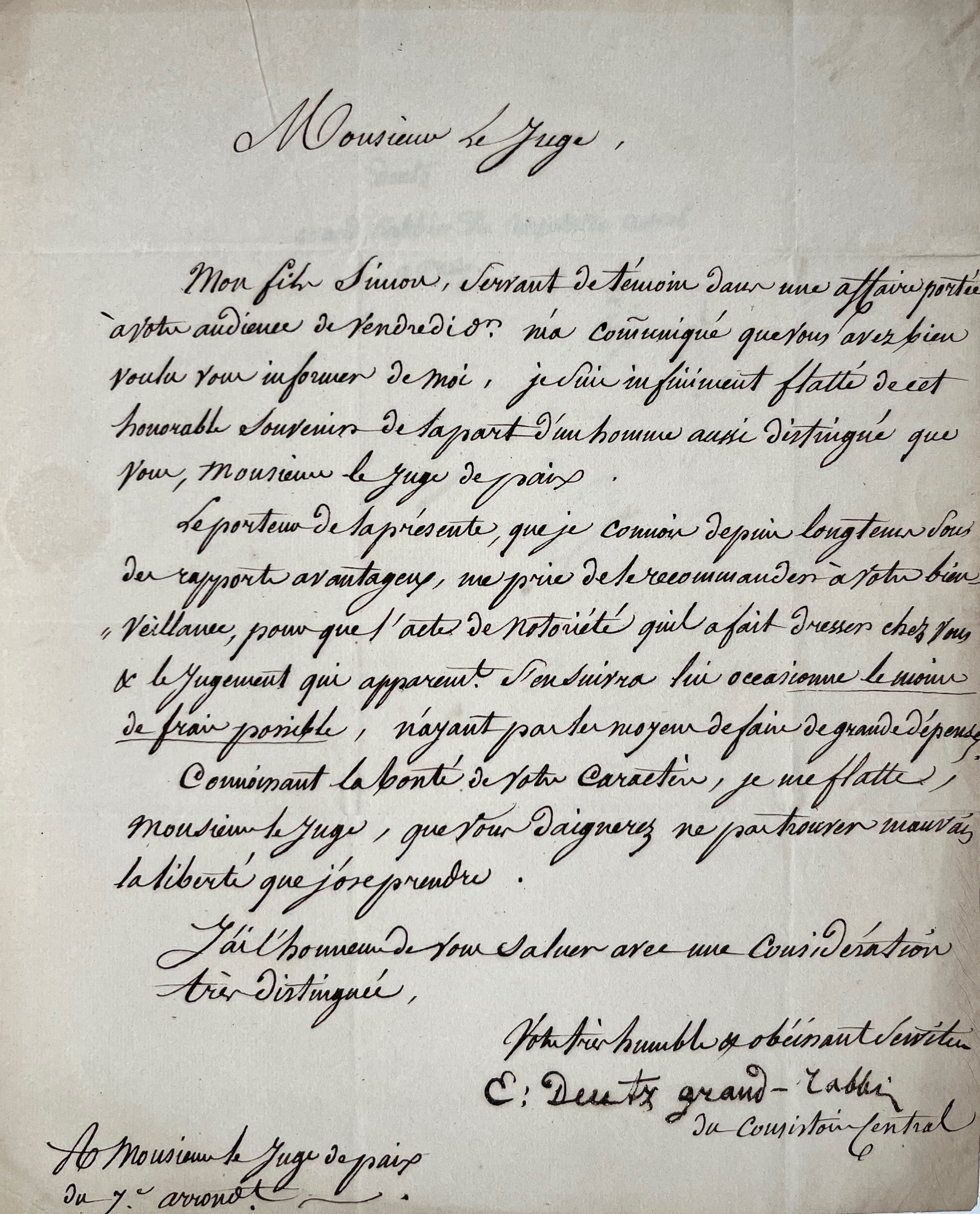 Lettre d'Emmanuel Deutz, signée « E : Deutz grand-rabbin », relative à une audience durant laquelle son fils Simon doit témoigner. Il demande à ce que l’acte de jugement « lui occasionne le moins de frais possible, n’ayant pas les moyens de faire de grande dépense [...] ».