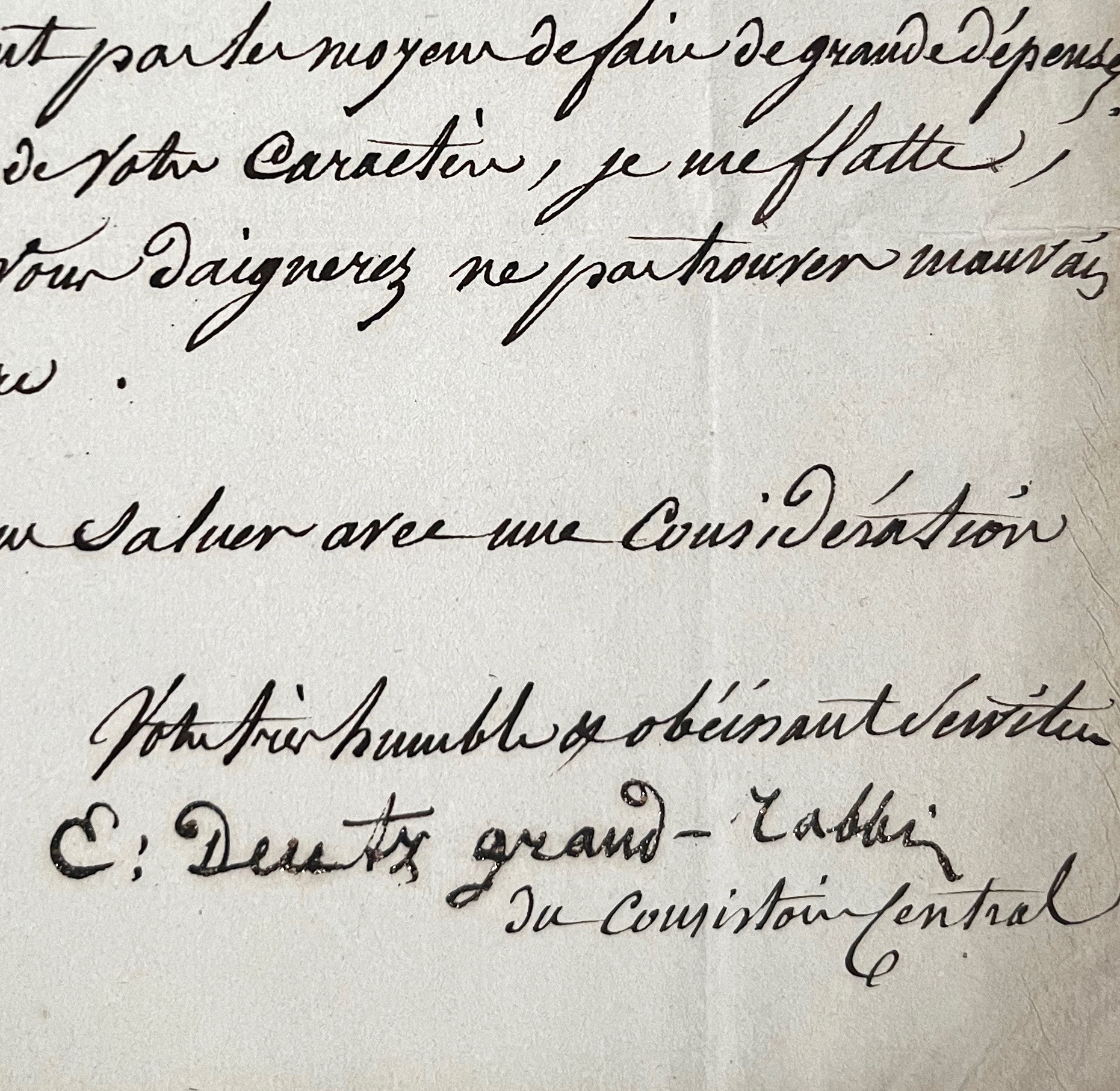 Lettre signée du grand-rabbin Emmanuel Deutz