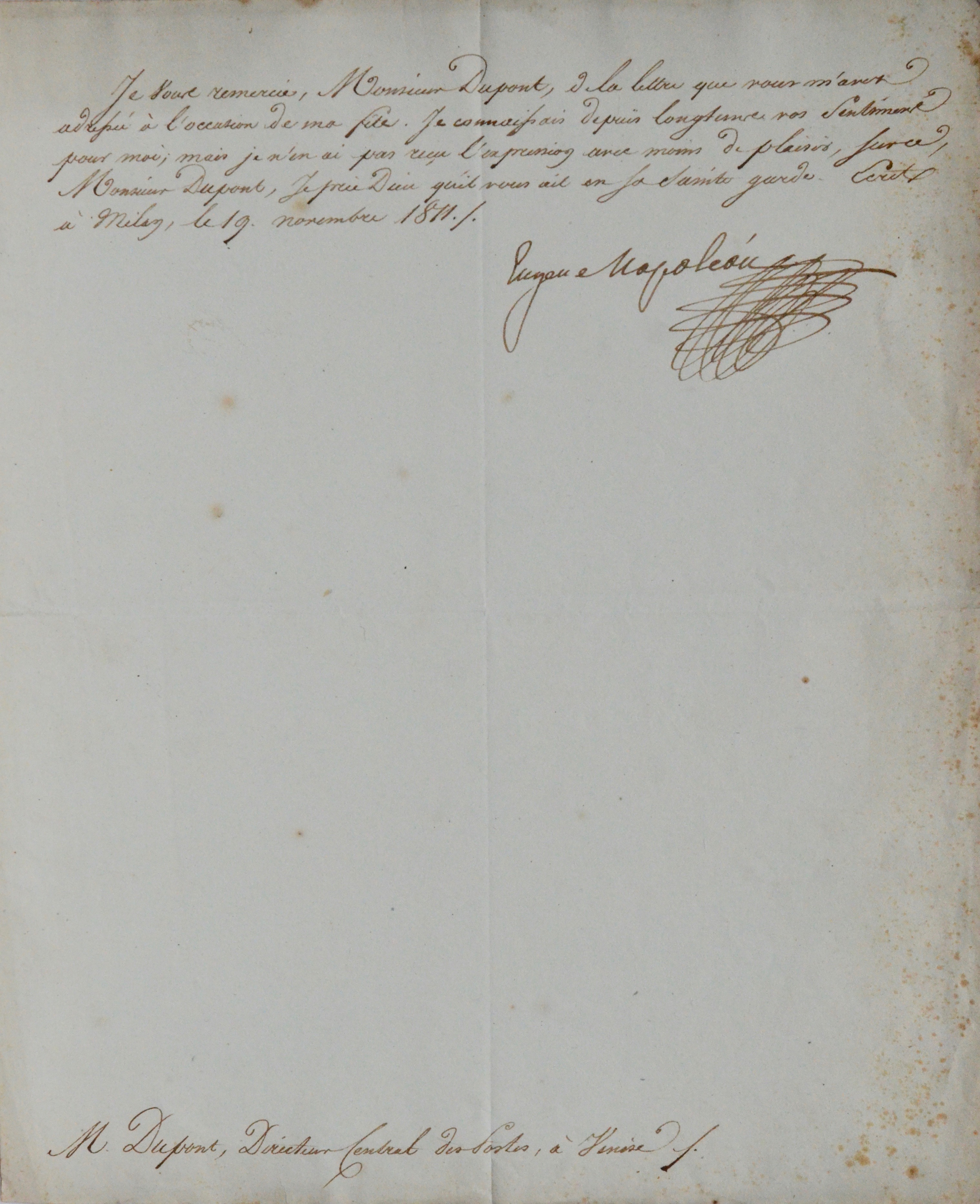 Le prince Eugène de Beauhanais remercie le directeur des postes de Venise "de la lettre que vous m'avez adressée à l'occasion de ma fête. Je connaissais depuis longtemps vos sentiments pour moi, mais je n'en ai pas reçu l'expression avec moins de plaisir [...]".