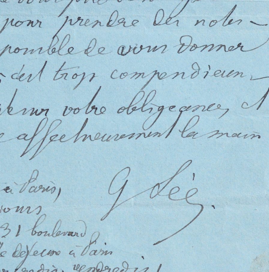 -billet adressé à un confrère. Il va parler du travail de ce dernier lors de son prochain cours, le lendemain et l'y convie. Paris, 28 mars.