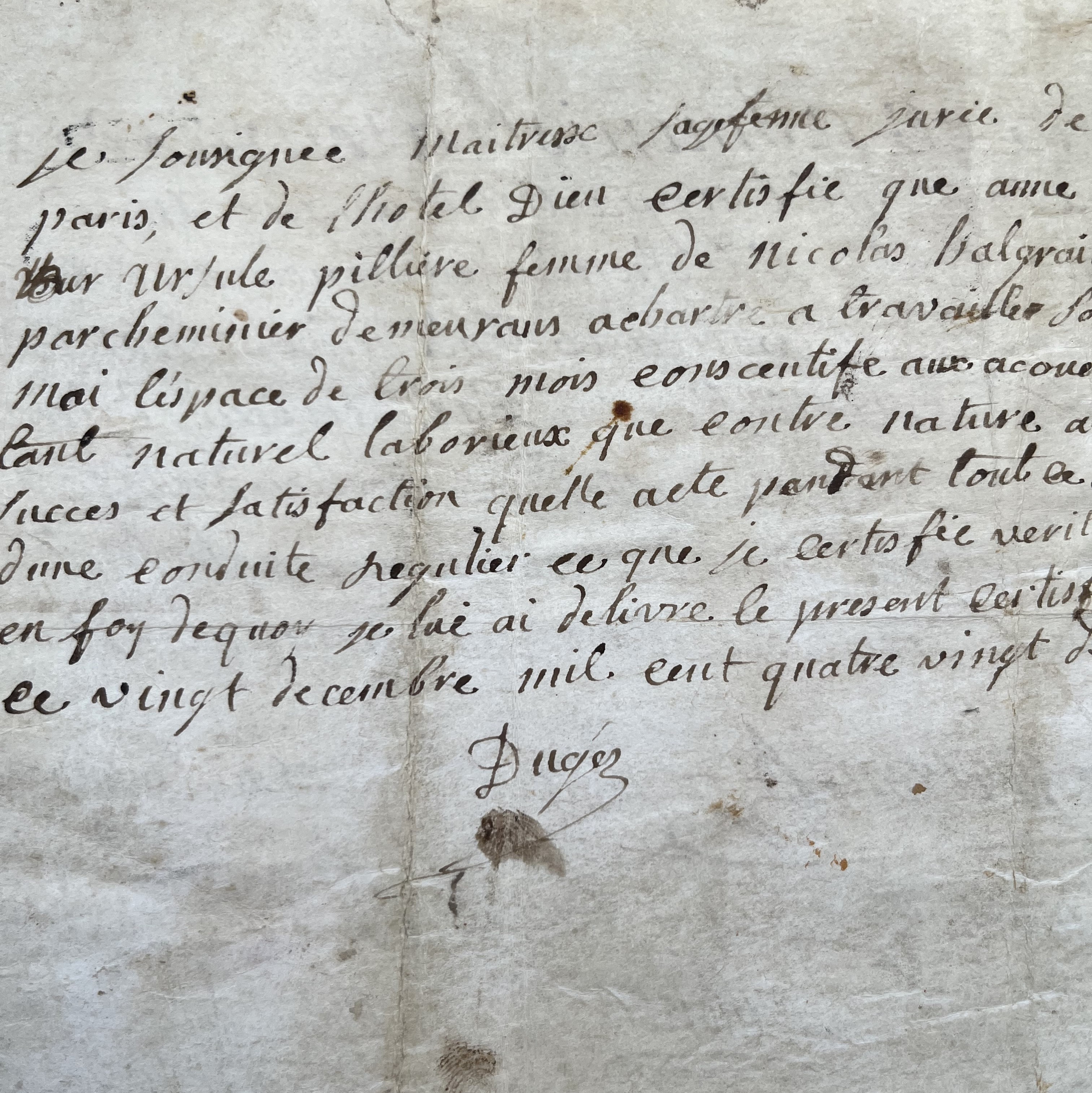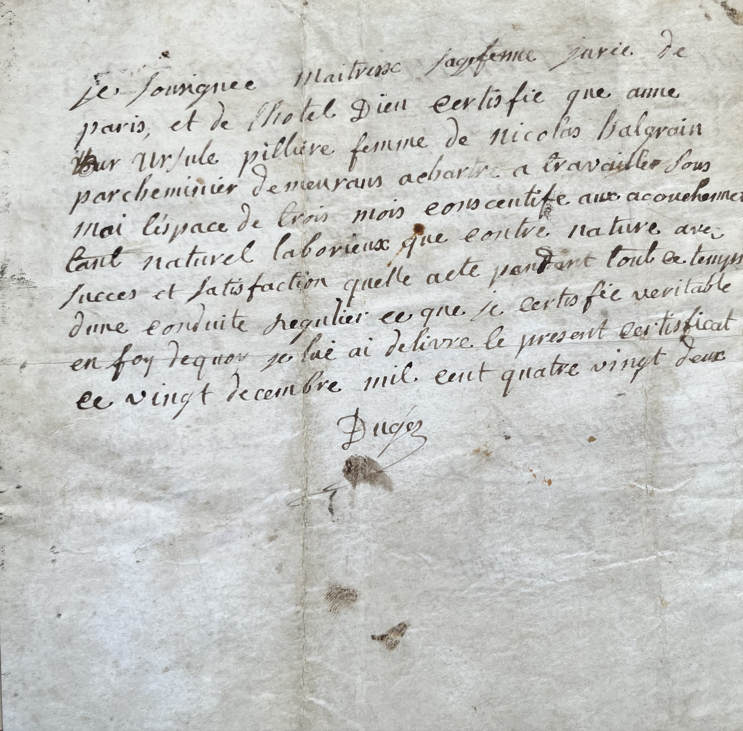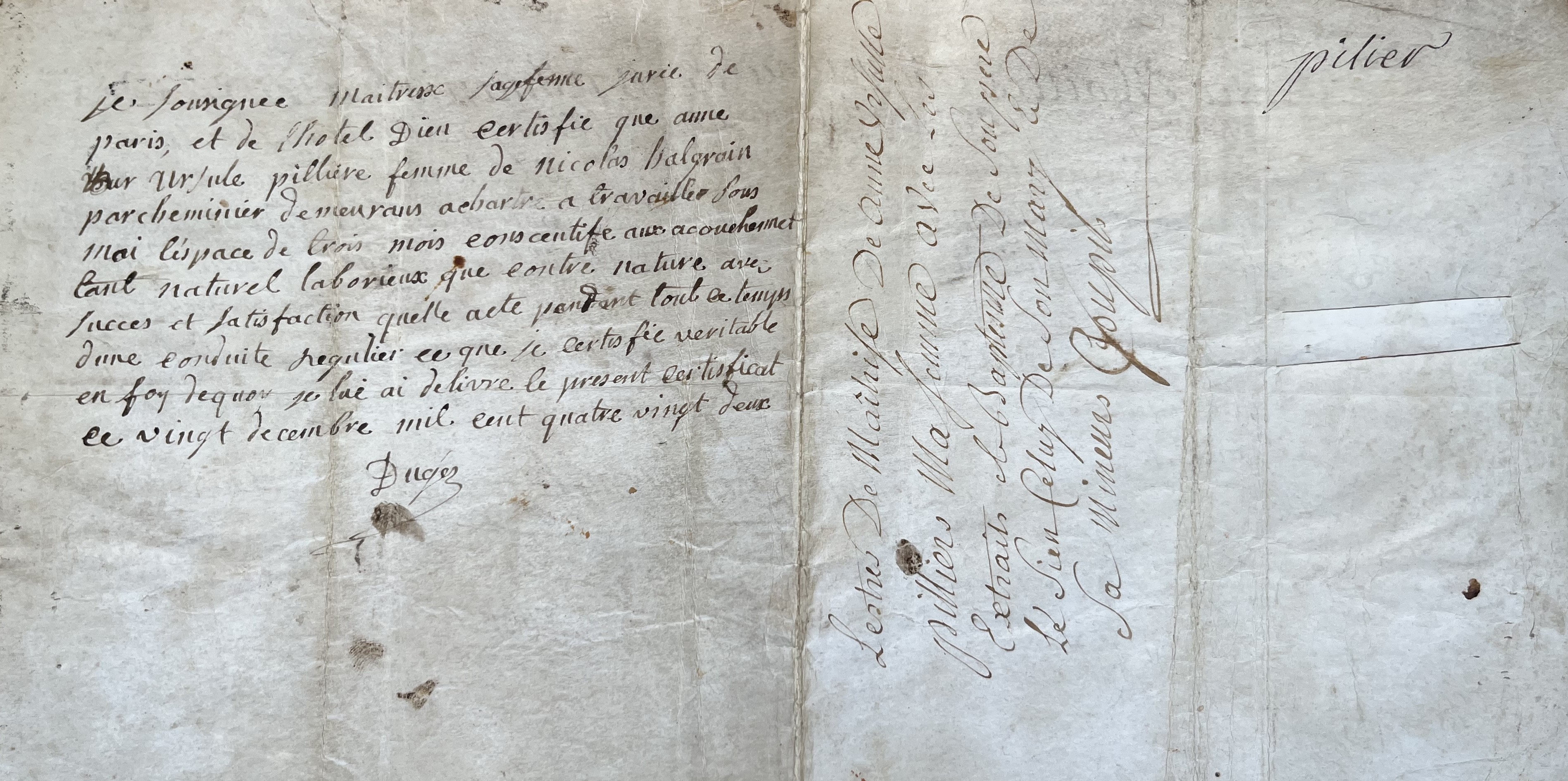 Au verso, figurent dix lignes autographes signées par Marie Jonet-Dugès : « Je soussigné Maîtresse sagefemme jurée de Paris, et de l’hôtel Dieu certifie que Anne Ursule Pillière […] a travaillé sous moi l’espace de trois mois consécutifs aux accouchements tant naturels laborieux que contre nature avec succès et satisfaction, qu'elle a été pendant tout ce temps d’une conduite régulière ce que je certifie véritable […] ».