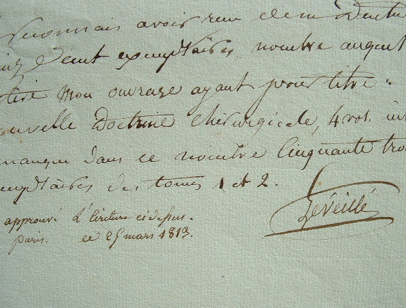Léveillé reconnaît avoir reçu de Dentu 1.500 exemplaires «nombre auquel a été tiré mon ouvrage ayant pour titre : Nouvelle doctrine chirurgicale, 4 vol. in-8». Il précise : «Il manque dans ce nombre cinquante trois exemplaires des tomes 1 et 2». [Nouvelle doctrine chirurgicale, ou Traité complet de pathologie, de thérapeutique et d'opération chirurgicale, publié en 1812 chez Dentu, en 4 vol. in-8].