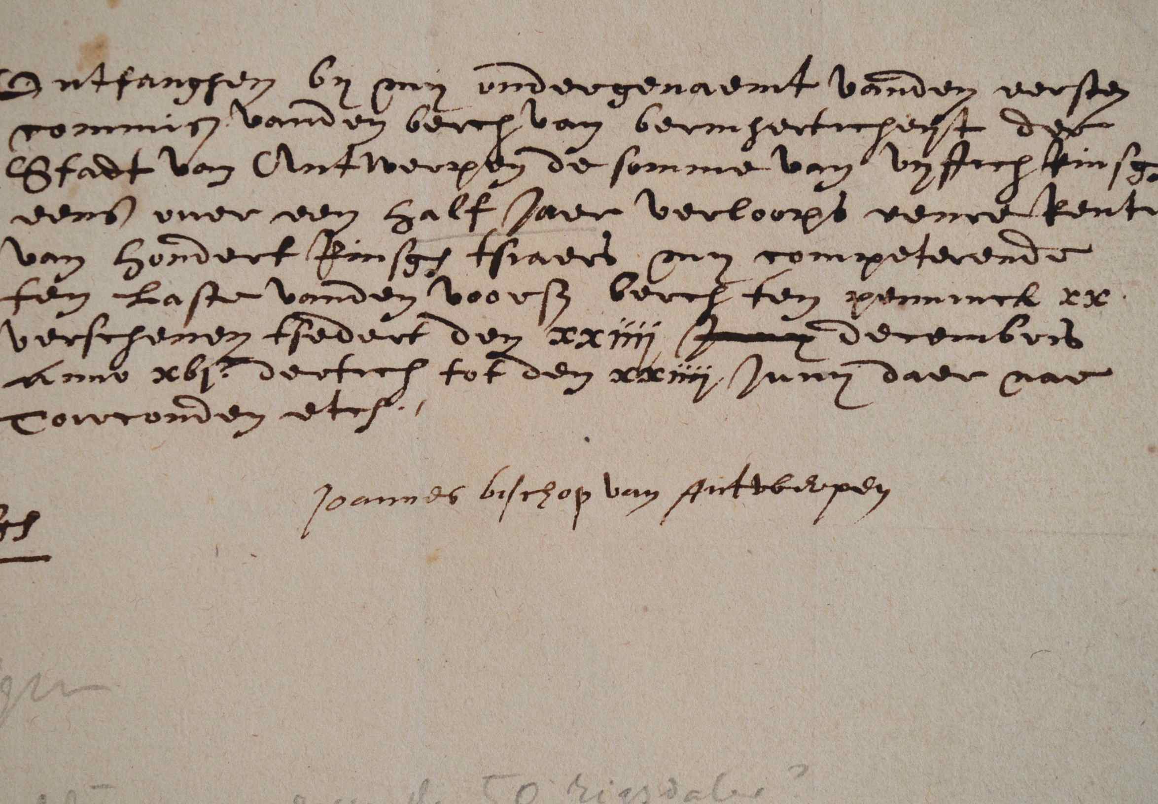 Reçu signé par l'évêque d'Anvers, Jean Maldère, pour un semestre de rentes.