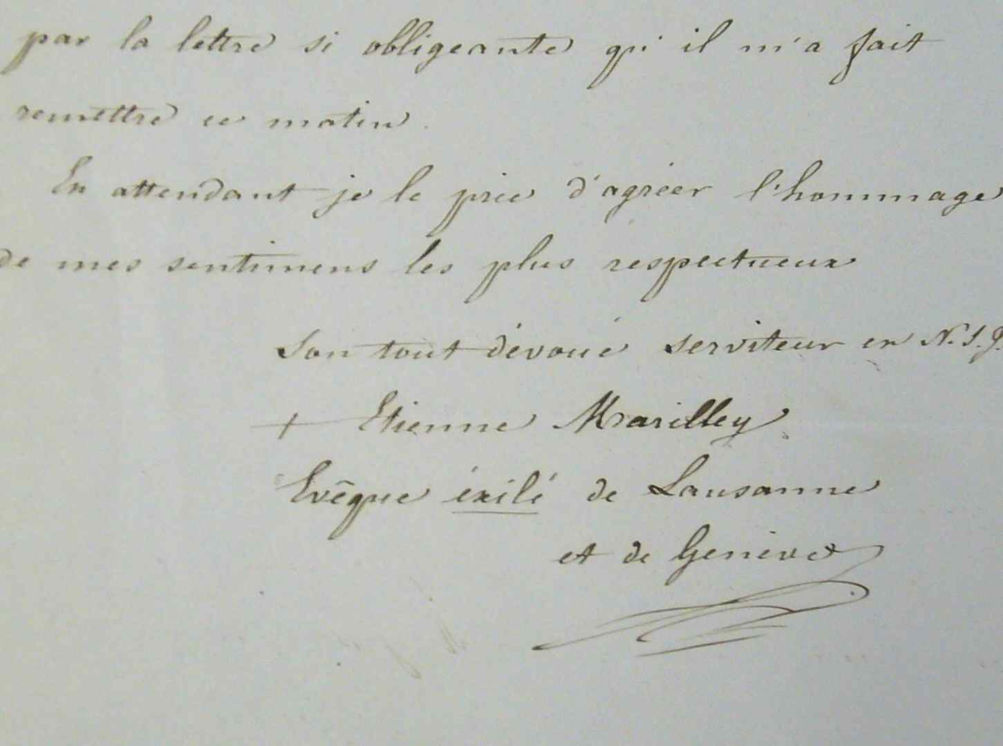 Courte lettre de Mgr Marilley, évêque de Lausanne et de Genève, écrite à la fin de son exil. "Je recevrais avec autant de reconnaissance que de consolation la visite que Monsieur de St Vincent a bien voulu m'annoncer par la lettre si obligeante qu'il m'a faite remettre ce matin [...]". Et signe "évêque exilé de Lausanne et Genève".
