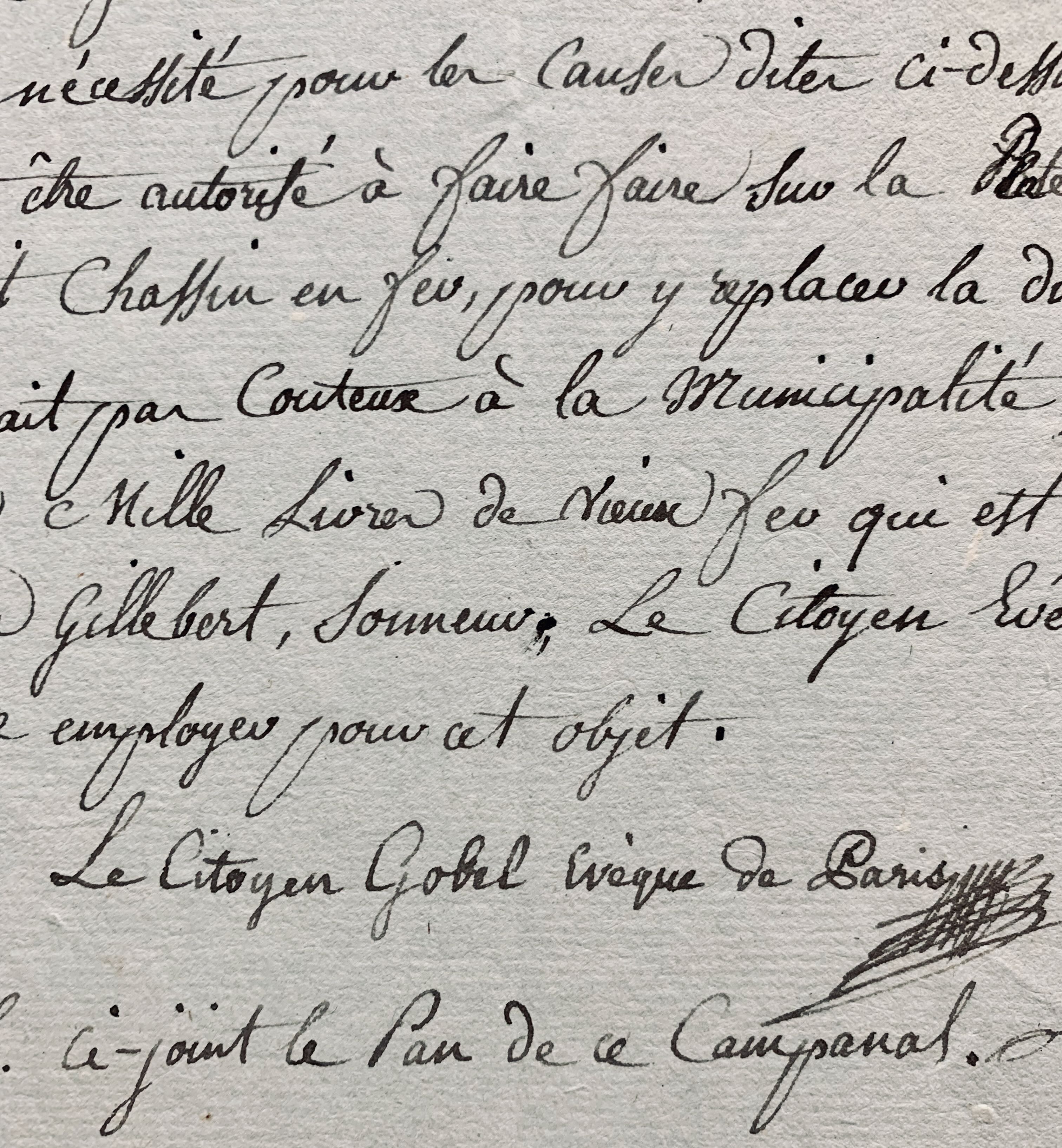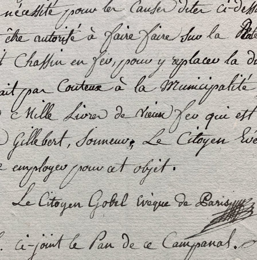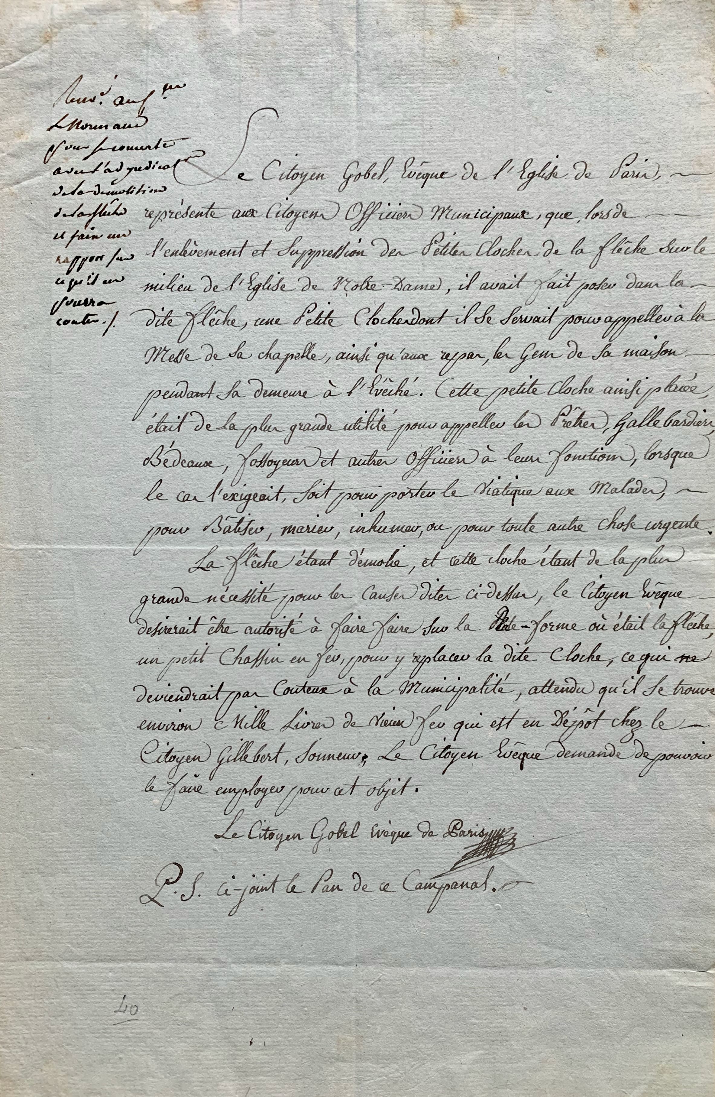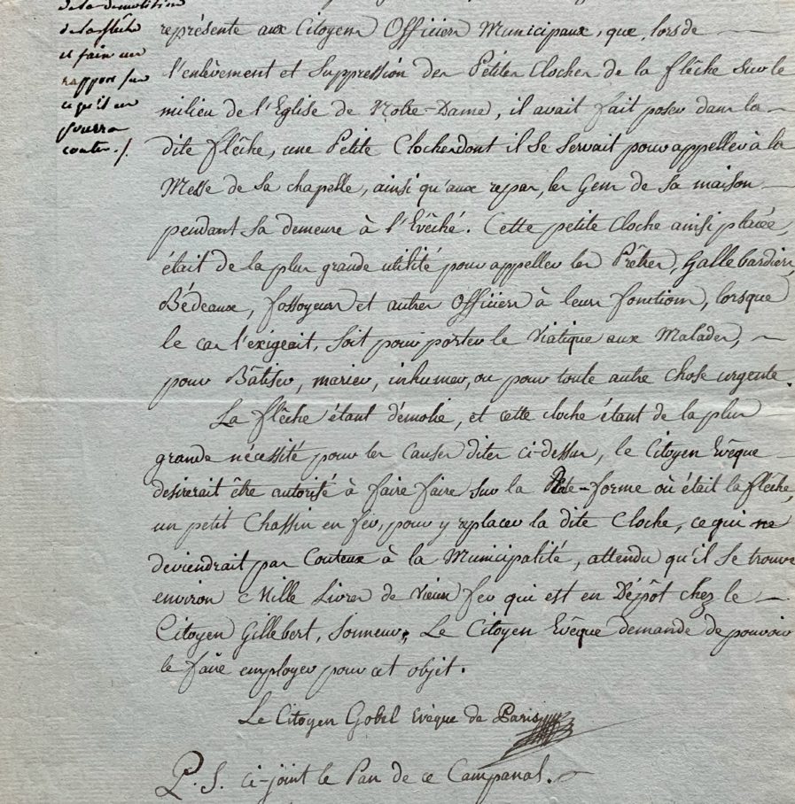 Gobel, comme "évêque de Paris" [il avait été nommé évêque constitutionnel en 1791], demande à ce que la petite cloche dont il se servait soit remise en place. "Lors de l'enlèvement et suppression des petites cloches de la flèche sur le milieu de l'Eglise de Notre-Dame, il avait fait poser dans la dite flèche, une petite cloche dont il se servait pour appeler à la messe de sa chapelle, ainsi qu'aux repas, les gens de sa maison pendant sa demeure à l'évêché. Cette petite cloche ainsi placée, était de la plus grande utilité pour appeler les prêtres, hallebardiers, bedeaux, fossoyeurs at autres officiers à leurs fonctions, lorsque le cas l'exigeait, soit pour porter le viatique aux malades, pour baptiser, marier, inhumer ou pour toute autre chose urgente. La flèche étant démolie, et cette cloche étant de la plus grande nécessité pour les causes dites ci-dessus, le citoyen évêque désirerait être autorisé à faire faire sur la plateforme où était la flèche, un petit chassis en fer pour y replacer ladite cloche [...]".