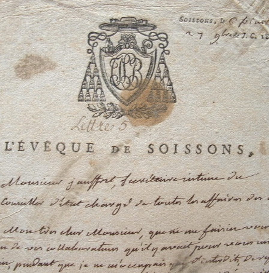 Datée du 6 frimaire an 12. Vignette et en-tête de l'évêque de Soissons.