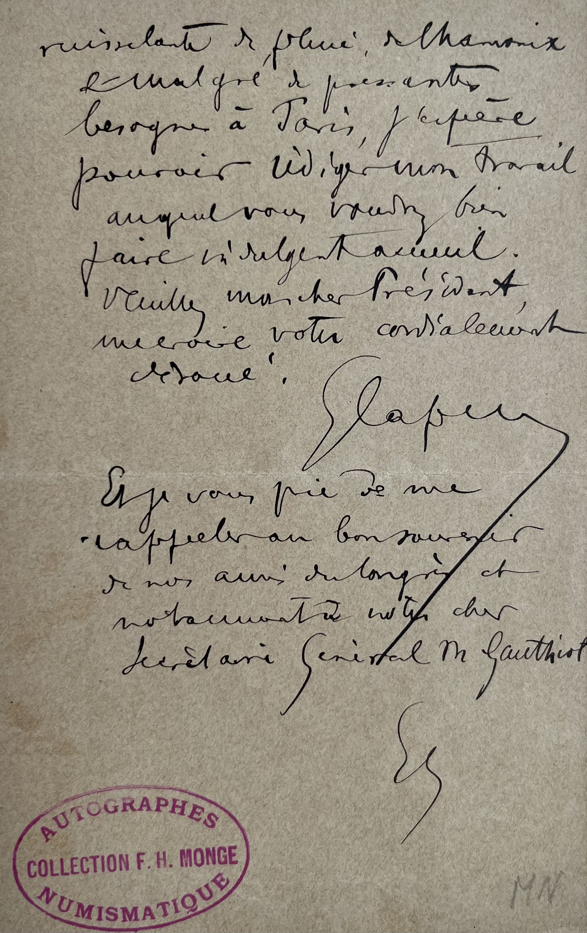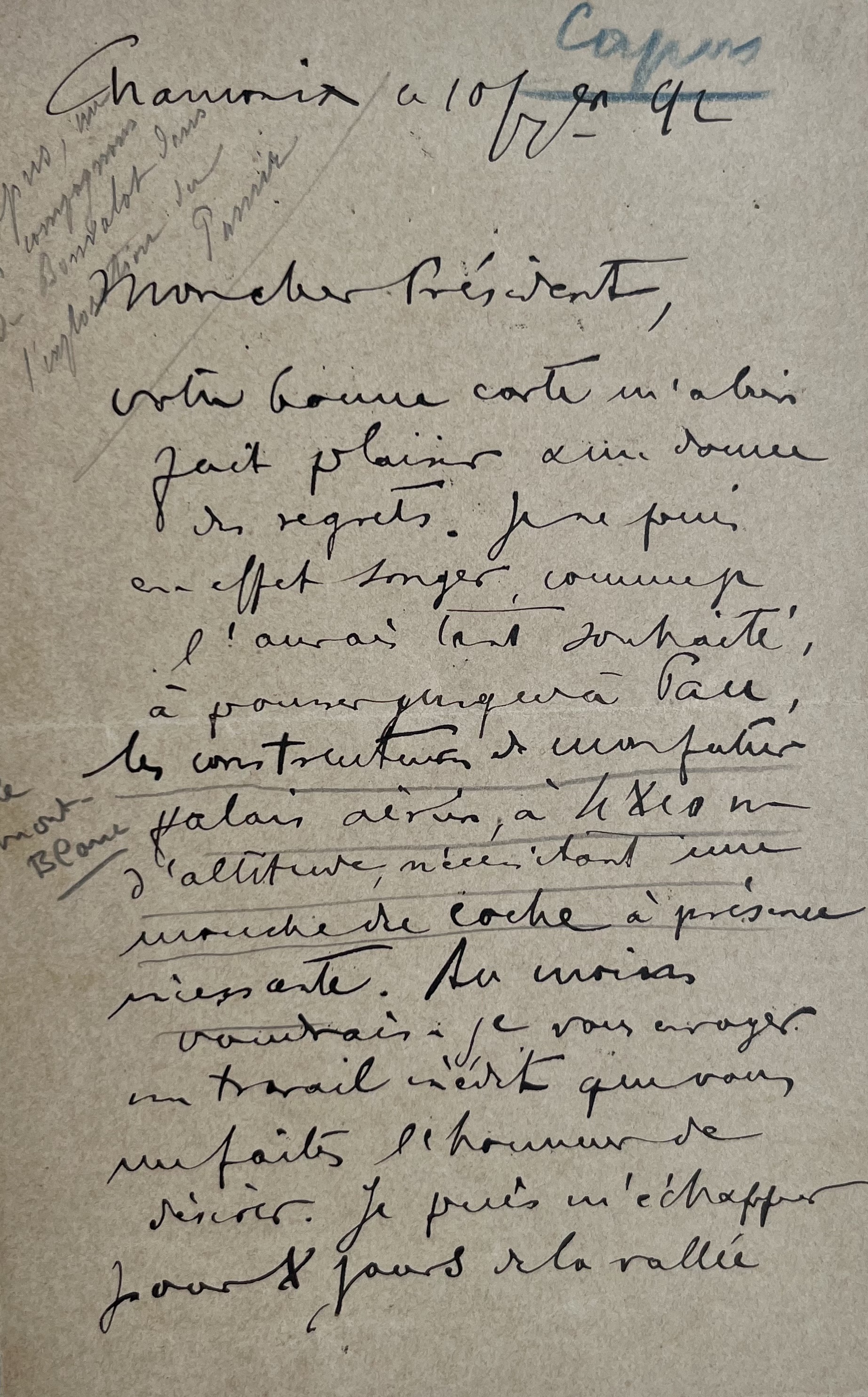 "Votre bonne carte m'a bien fait plaisir & me donne des regrets. Je ne puis en effet songer, comme je l'aurais tant souhaité, à pousser jusqu'à Pau. Les constructions de mon futur palais aérien, à 4810 m. d'altitude, nécessitant une mouche du coche à présence incessante. Au moins voudrais-je vous envoyer un travail inédit que vous me faites l'honneur de désirer. Je puis m'échapper pour 8 jours de la vallée ruisselante de pluie de Chamonix […]".