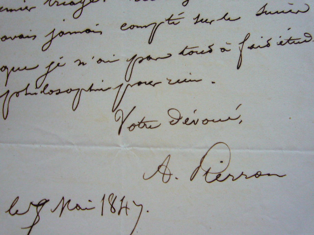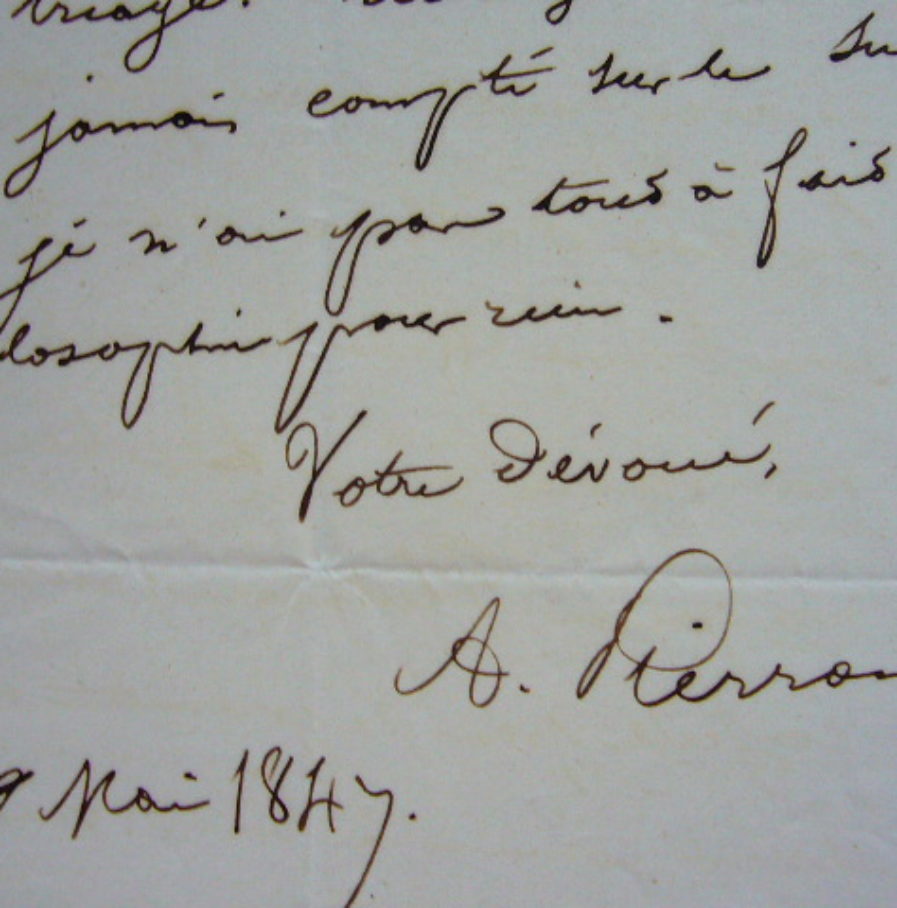 Alexis Pierron invite son correspondant à imprimer «et le plus tôt possible, et de votre mieux, et aux meilleures conditions, la philosophie de Voltaire, avec le travail excellent de Bersod». Il se dit certain que 3000 exemplaires seront rapidement vendus et qu'il aura plus de succès que son «pauvre Plutarque». Il lui fait part des bruits concernant l'attribution de différents prix par l'Académie. «D'après le bruit dont je parle, les différents co-partageants du gâteau de 5000 fr. seraient : 1. Barni pour la traduction de son ouvrage de Kant. 2. Louandre et son Tacite. 3. Villemarqué parce qu'il est légitimiste. On nous aurait mis de côté tous tant que nous étions qui avions été réservés après le premier triage. Heureusement que je n'avais jamais compté sur le succès et que je n'ai pas tout à fait étudié la philosophie pour rien».