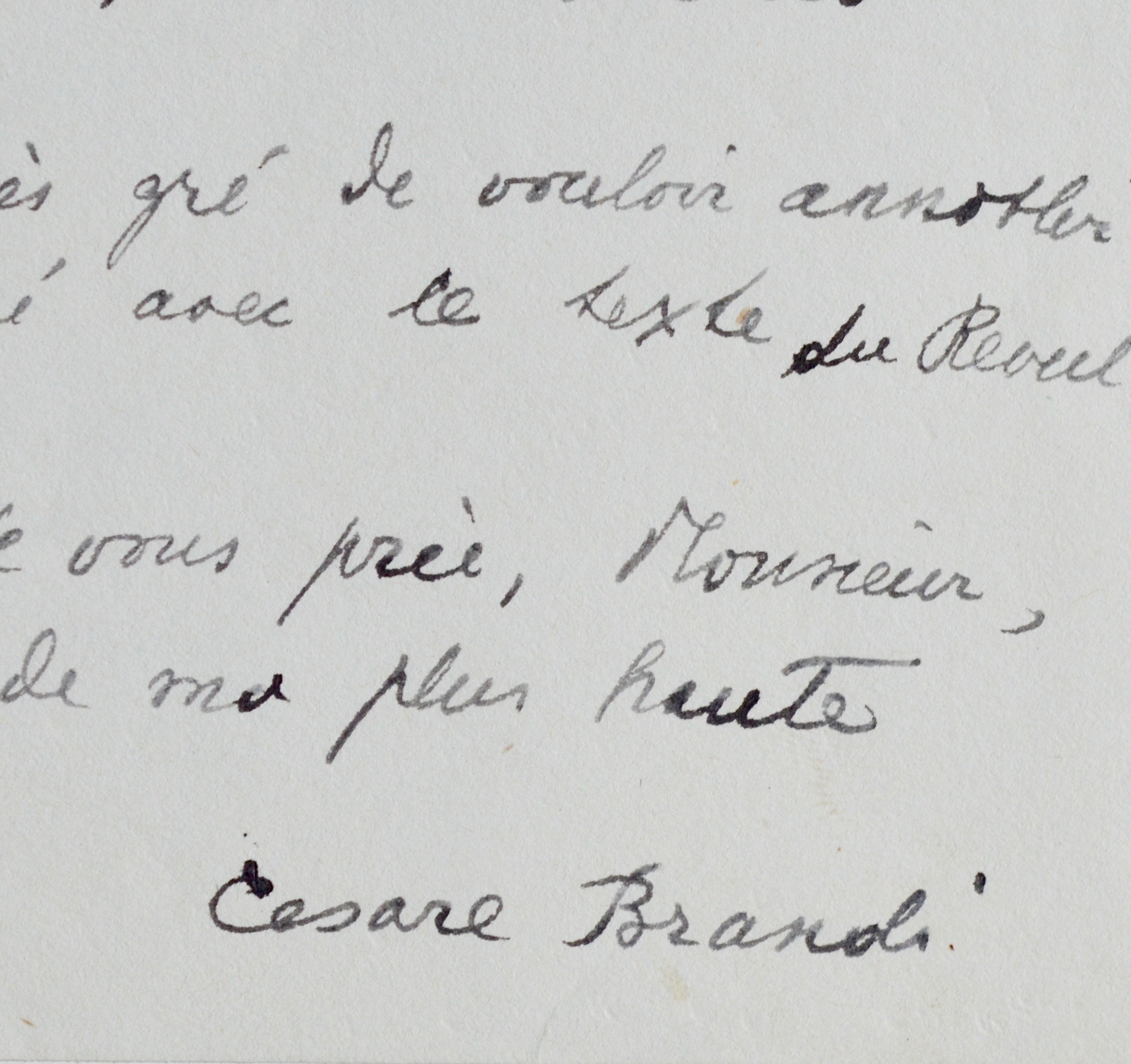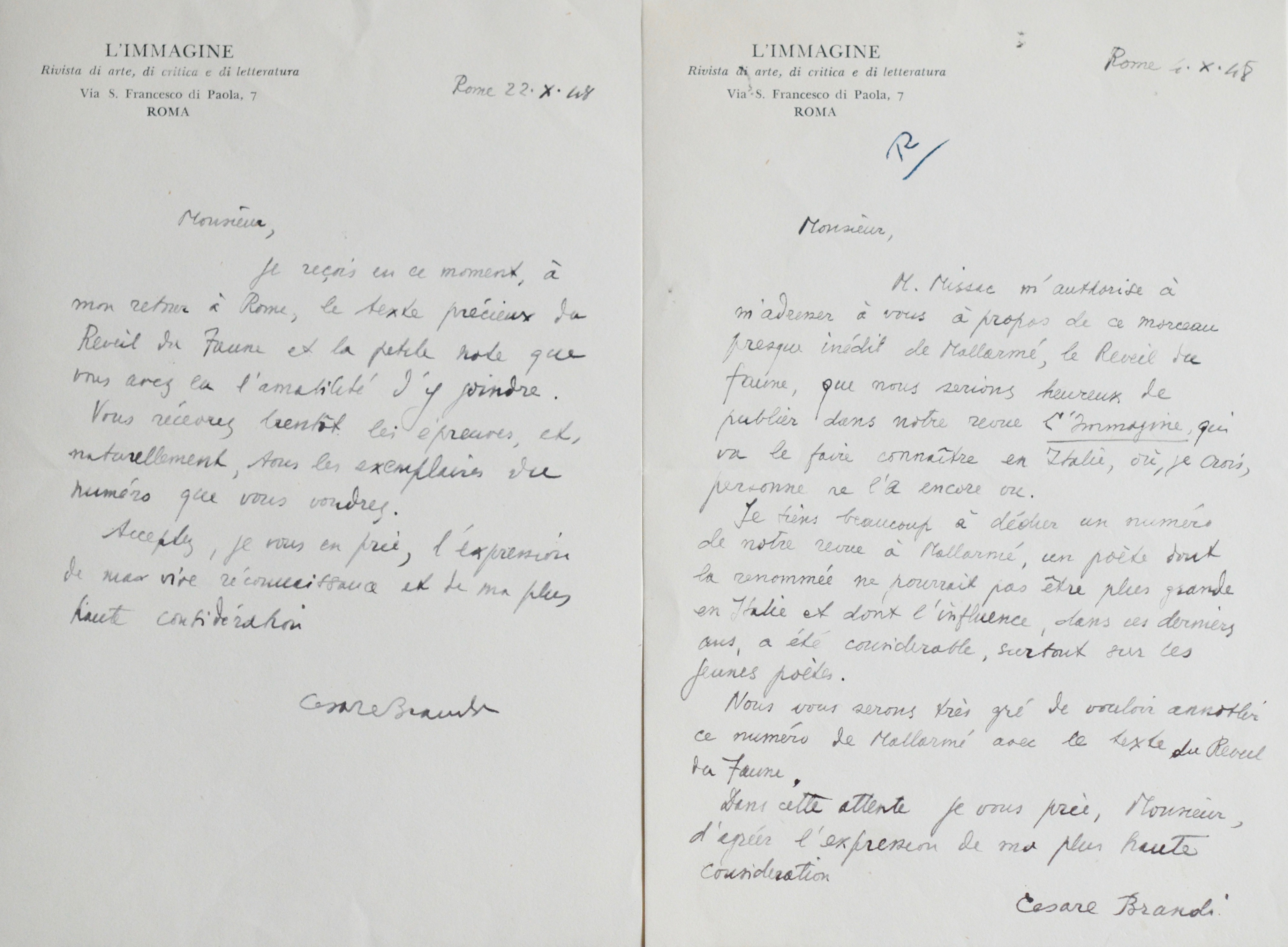 Brandi projette de consacrer un numéro de sa revue L'Immagine à Mallarmé. Il contacte donc Henry Charpentier et lui demande de lui adresser "ce morceau presque inédit de Mallarmé, le Réveil du Faune [...] qui va le faire connaître en Italie, où, je crois, personne ne l'a encore vu. Je tiens beaucoup à dédier un numéro de notre revue à Mallarmé, un poète dont la renommée ne pourrait pas être plus grande en Italie et dont l'influence, dans ces derniers ans, a été considérable, surtout sur les jeunes poètes [...]".