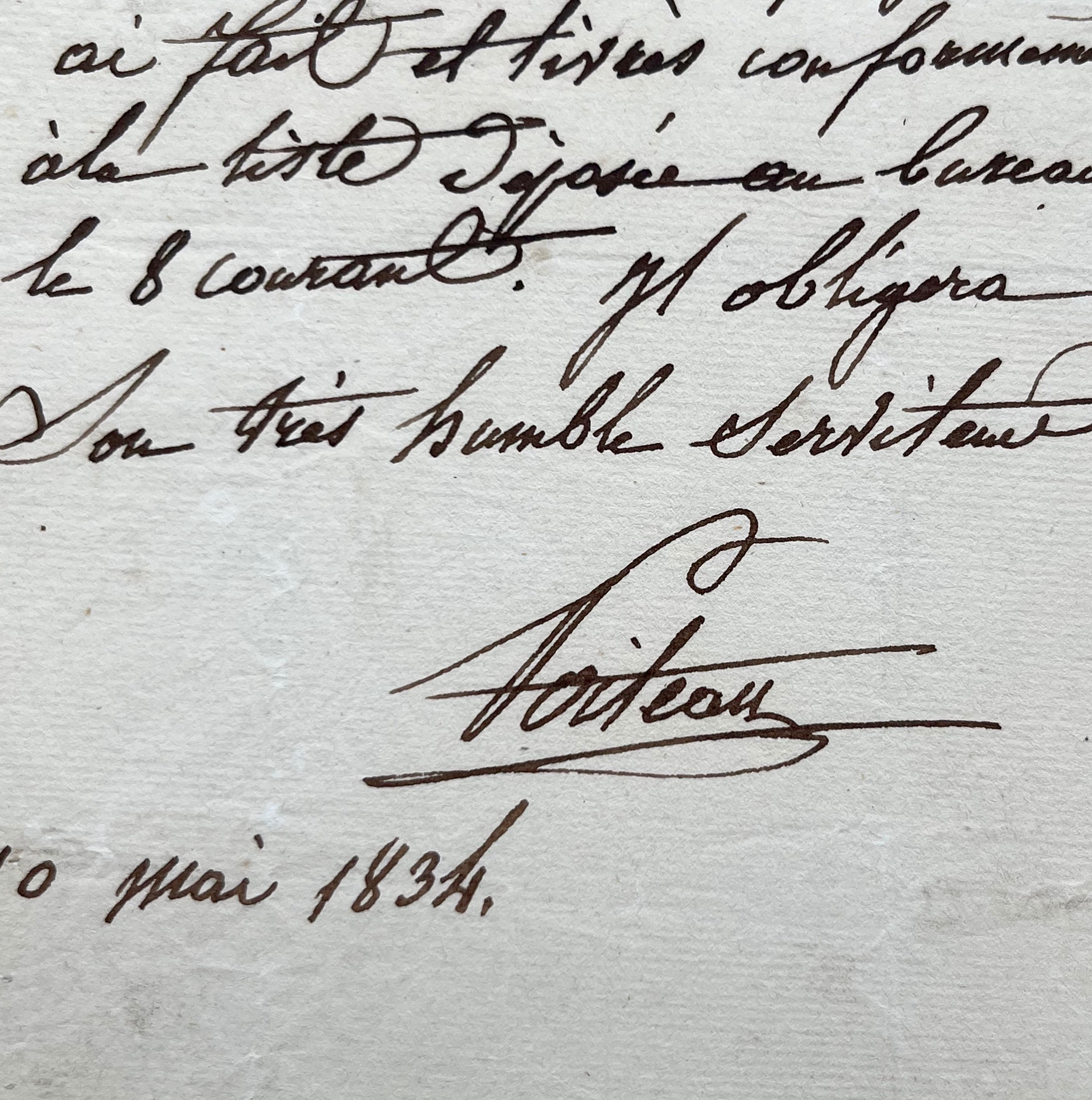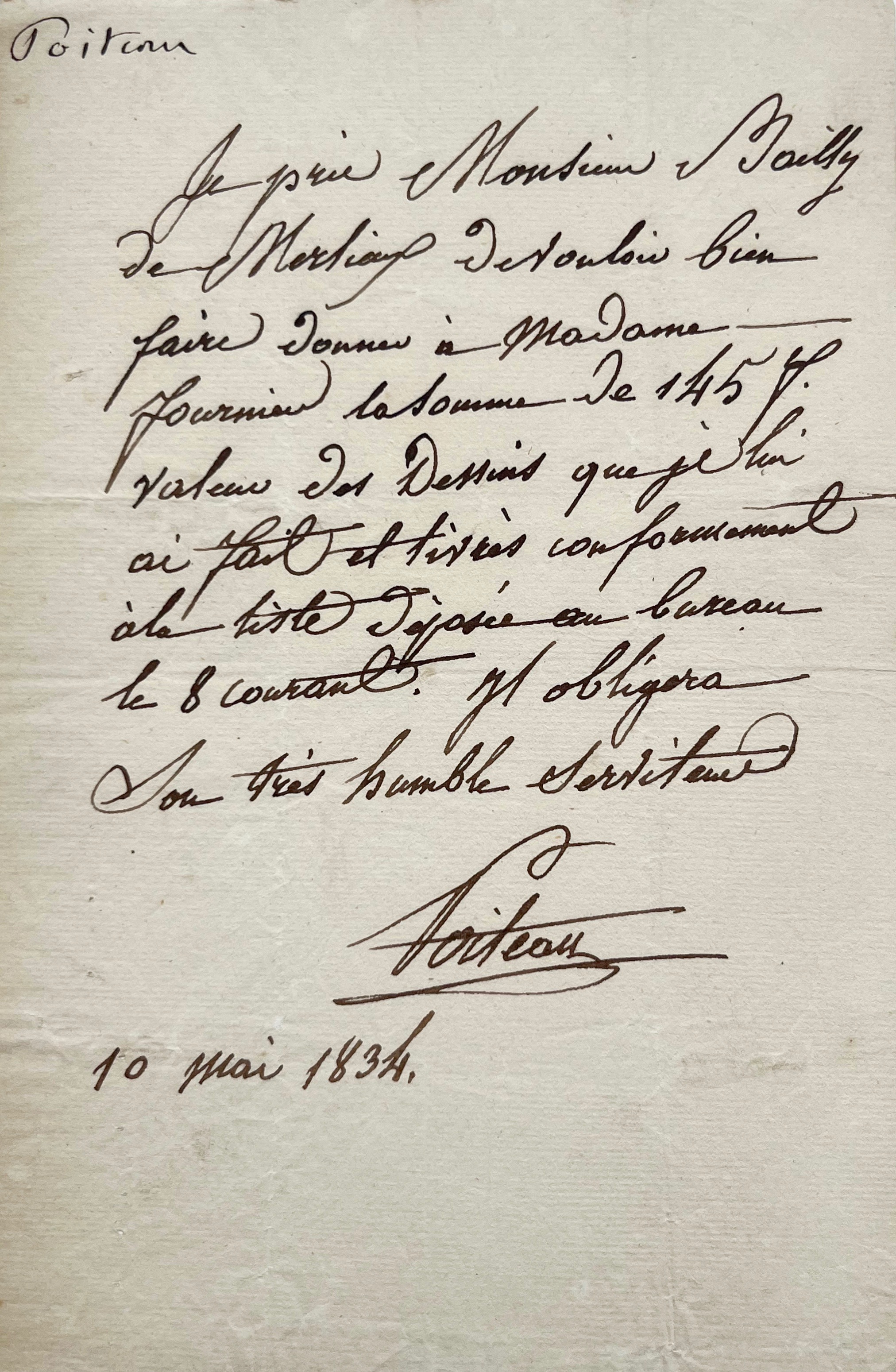 « Je prie Monsieur Bailly de Merlieux de vouloir bien faire donner à Madame Fournier la somme de 145 f. valeur des dessins que je lui ai fait livrer conformément à la liste déposée au bureau du 8 courant […] ». Poiteau était un dessinateur et illustrateur de grand talent, notamment pour les fruits et fleurs.