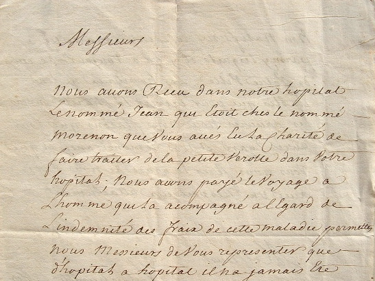 Lettre signée par les recteurs de l'Hôtel-Dieu de Marseille (Fortis, Simonin, Roux et Beaussier) à ceux de l'hôpital Saint-Jacques de Lambesc, les informant qu'ils ont reçu un patient «que vous avés eu la charité de faire traiter de la petite vérolle dans votre hôpital ; nous avons payé le voyage à l'homme qui l'a accompagné ; à l'égard de l'indemnité des frais de cette maladie, permettez nous messieurs, de vous représenter que d'hôpital à hôpital, il n'a jamais été question de semblables indemnités. Si cella avoit lieu, le notre auroit par là de grandes ressources car nous pouvons vous assurer que de deux cens malades que nous avons ordinairement et actuellement dans notre hôpital, il y en a toujours les deux tiers qui sont forrains non natifs ny résident à Marseille, parmy lesquels il y en a toujours de ceux de votre ville ; les hôpitaux ne sont établis que pour exercer la charité envers les pauvres ; nous nous flatons que vous aurés égard à nos remonstrances [...]».
