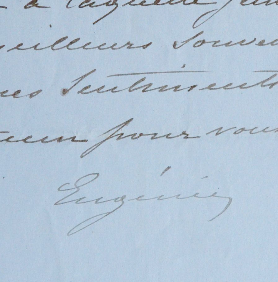 Eugénie de Montijo (Grenade, 1826/1920)À son retour de Wiesbaden, Eugénie a trouvé le dernier ouvrage d'Octave Feuillet, "Honneur d'artiste", dans sa demeure de Farnborough Hill. Elle le remercie de cet envoi et se dit charmée par sa lecture. "[...] Vous êtes accoutumé au succès mais je me réjouis particulièrement pour vous de celui-ci. Il vous encourage à le continuer et vous y trouverez ainsi l'oubli ou tout au moins des adoucissements à la douleur qui a déchiré votre coeur... J'associe dans cette pensée Madame Feuillet à laquelle j'envoie mes meilleurs souvenirs avec mes sentiments affectueux pour vous. Eugénie".