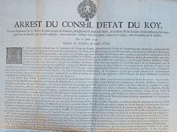 Voulant protéger les manufactures du royaume, Louis XIV avait fait interdire, en 1709, l'importation des toiles et étoffes, en particulier indiennes et chinoises. Mais cette mesure ne semble pas être appliquée avec toute la rigueur nécessaire. Le Conseil d'Etat proclame ce nouvel arrêt, «portant règlement sur les toiles de coton peintes ou blanches, mousselines et étoffes des Indes, de la Chine et du Levant ; et injonction de faire marquer tous les meubles qui en sont composés ; avec nouvelles défenses d'en faire aucun commerce ni usage, tant en meubles qu'en habits».