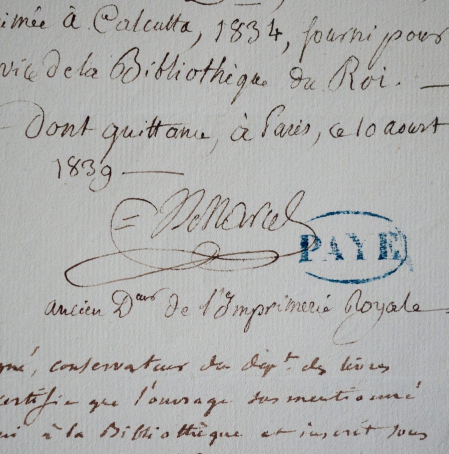 Jean-Joseph Marcel (Paris, 1776/1854)Document peu commun signé par Jean-Joseph Marcel, attestant de la vente d'un exemplaire du Dictionnaire Persan intitulé Borhân-Quâtté, imprimé à Calcutta en 1834.