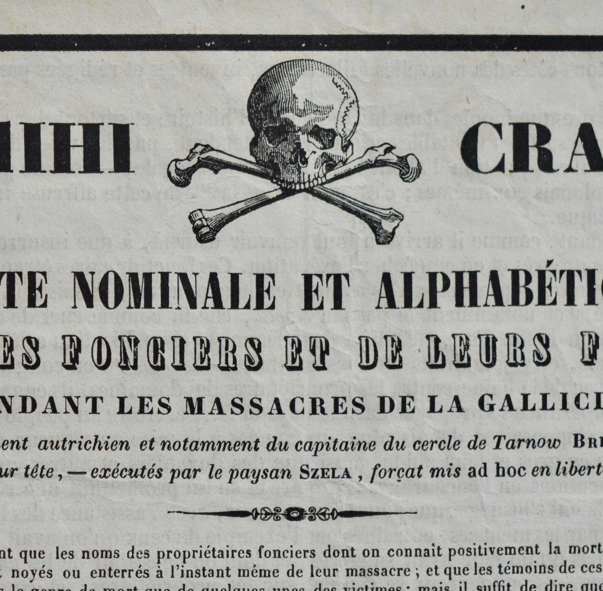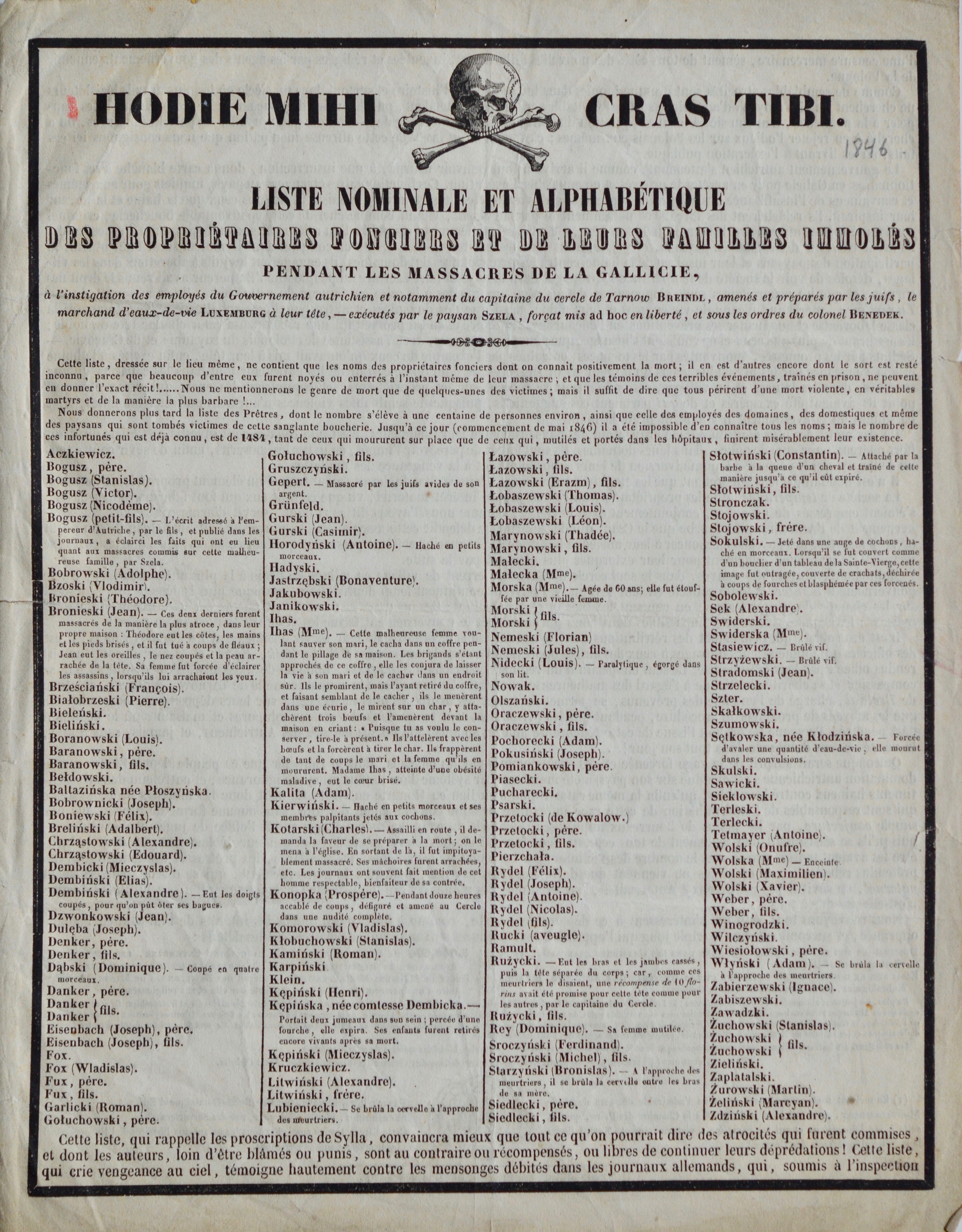 « Liste nominale et alphabétique des propriétaires fonciers et de leurs familles immolées pendant les massacres de la Gallicie [sic], à l'instigation des employés du Gouvernement autrichien et notamment du capitaine du cercle de Tarnow Breindl, amenés et préparés par les juifs, le marchand d'eaux-de-vie Luxemburg à leur tête […] ».