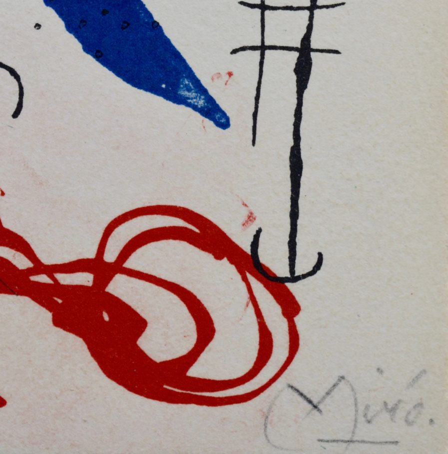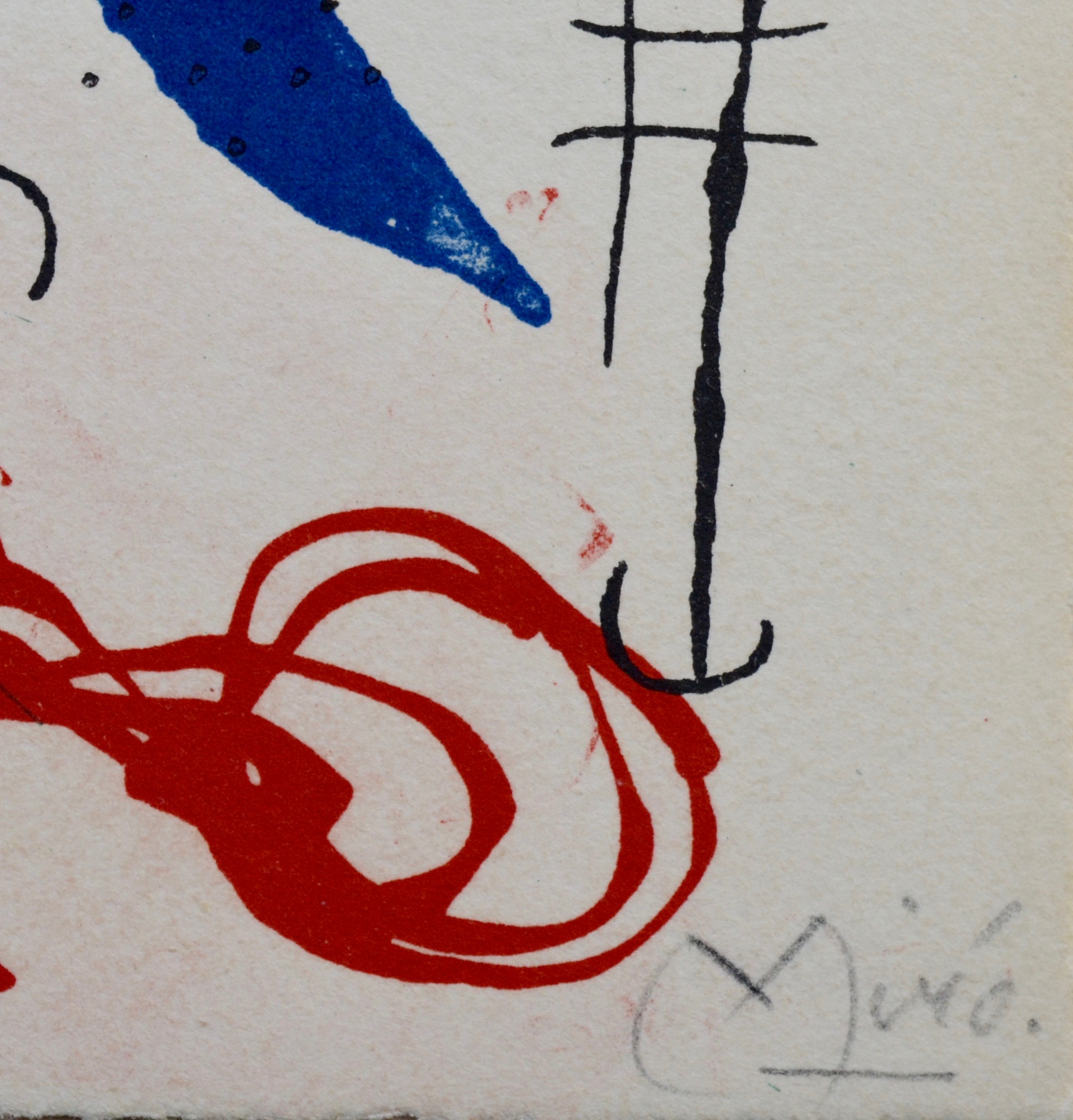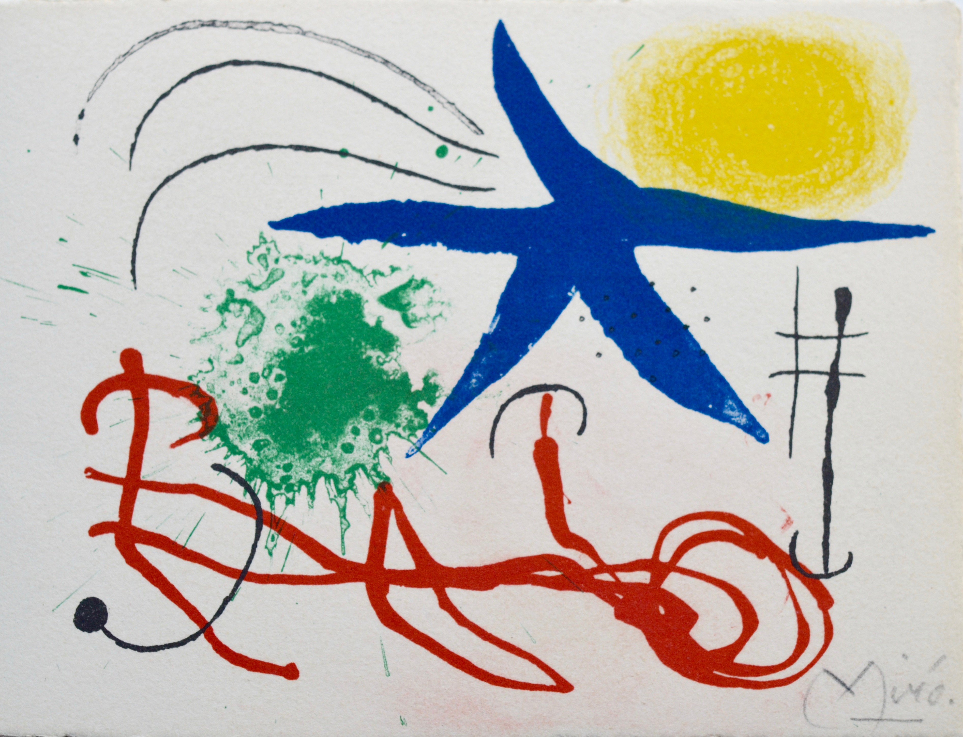 Belle carte autographe de Juan Miró, avec belle composition lithographiée et signée en pied.