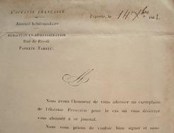 Lettre circulaire, portant la signature autographe d'Albert Cohen, directeur-gérant et propriétaire de "l'Océanie française". Il adresse un exemplaire du journal et demande à son correspondant s'il souhaite s'abonner. ("L'Océanie française" paraît, dans un premier temps, de mai 1844 à juillet 1845, puis est interdite par le ministère de la Marine. En 1883, Albert Cohen relance cet hebdomadaire républicain).