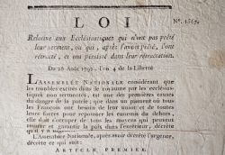"Loi relative aux Ecclésiastiques qui n'ont pas prêté leur serment, ou qui, après l'avoir prêté, l'ont rétracté, et ont persisté dans leur rétractation". « Tous les ecclésiastiques qui étant assujettis au serment par la loi du 26 décembre 1790, et celle du 17 avril 1791, ne l'ont pas prêté ou qui, après l'avoir prêté, l'ont rétracté, et ont persisté dans leur rétractation, seront tenus de sortir sous huit jours hors des limites du district et du département de leur résidence, et dans quinzaine, hors du royaume ; ces différents délais courront du jour de la publication du présent décret [...] ».