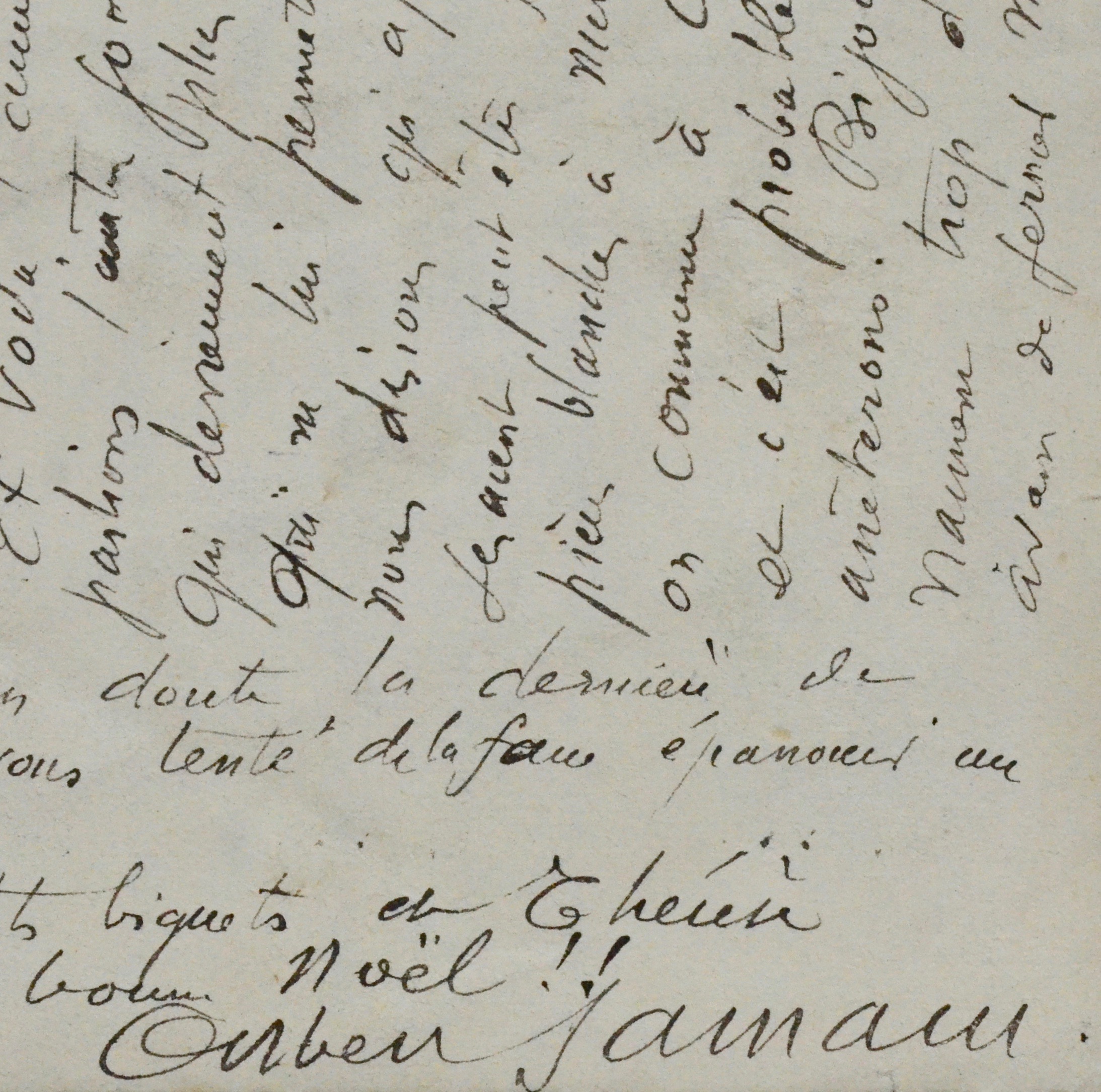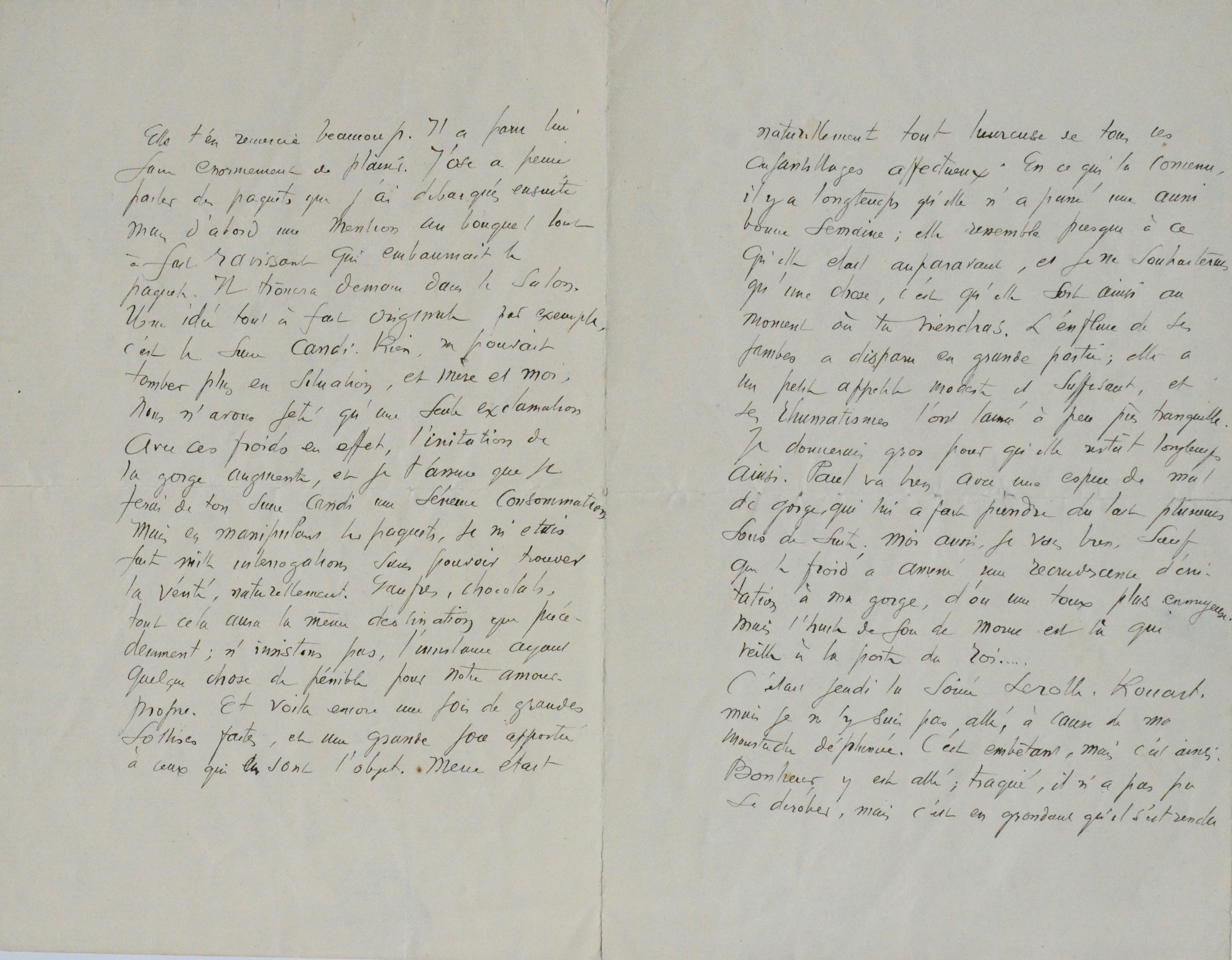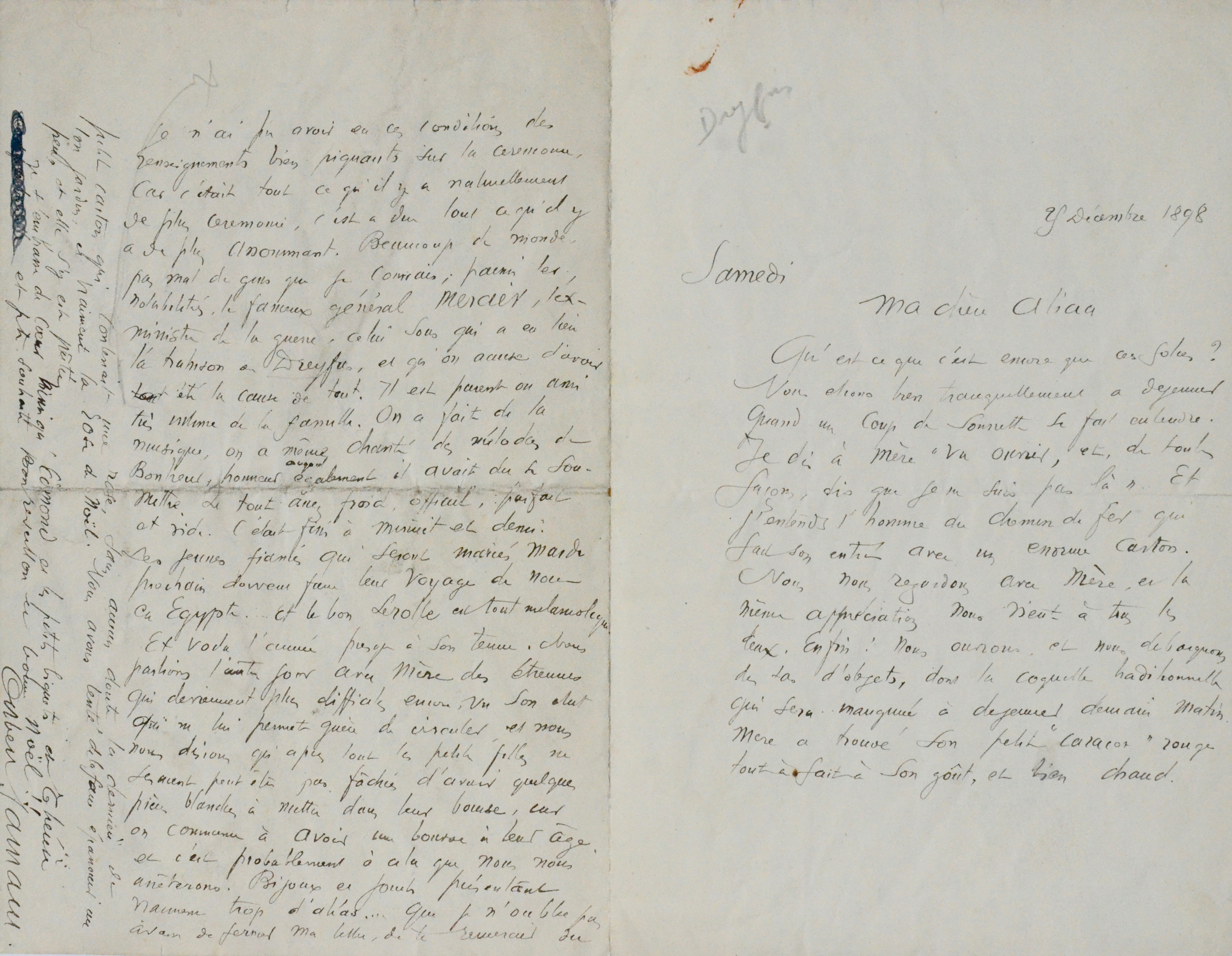 Albert Samain (Lille, 1858/1900)"Ma chère Alicia. Qu'est-ce que c'est que ces folies ?" Albert Samain, volubile, relate sa surprise lorsque, lors d'un déjeuner avec leur mère, un colis envoyé par sa soeur fut livré. Il relate longuement leurs réactions à la découverte de chaque cadeaux contenus dans la boîte, puis narre une soirée de fiançailles chez Lerolle-Rouart sans toutefois y avoir assisté, car, avec sa "moustache déplumée", il n'a pu s'y rendre. "Bonheur y est allé ; traqué, il n'a pas pu se dérober, mais c'est en grondant qu'il s'est rendu. Je n'ai pu avoir en ces conditions des renseignements bien piquants sur la cérémonie, car c'était tout ce qu'il y a naturellement de plus cérémonieux, c'est à dire à dire tout ce qu'il y a de plus assommant. Beaucoup de monde, pas mal de gens que je connais ; parmi les notabilités, le fameux général Mercier, l'ex-ministre de la guerre [Auguste Mercier], celui sous qui a eu lieu la trahison de Dreyfus, et qu'on accuse d'avoir été la cause de tout. Il est parent ou ami très intime de la famille [...]".