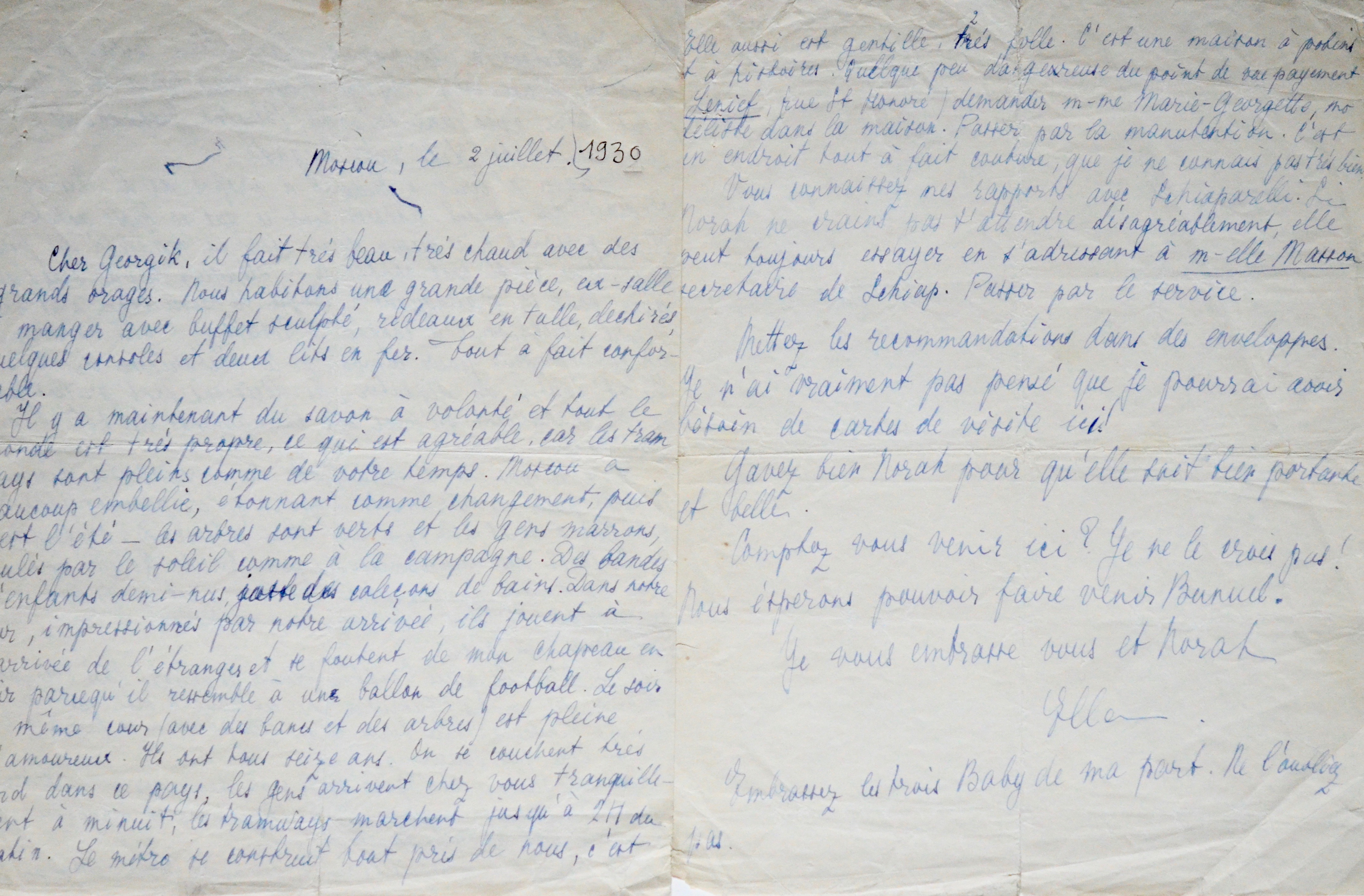 Elsa Triolet (Moscou, 1896/1970)Longue et violente lettre d'Elsa Triolet envoyée de Moscou, lors de son voyage en Russie avec Aragon. Elle décrit les changements survenus dans sa ville natale, évoque Luis Buñuel et à la rupture entre Aragon et le groupe surréaliste survenue quelques mois plus tôt.