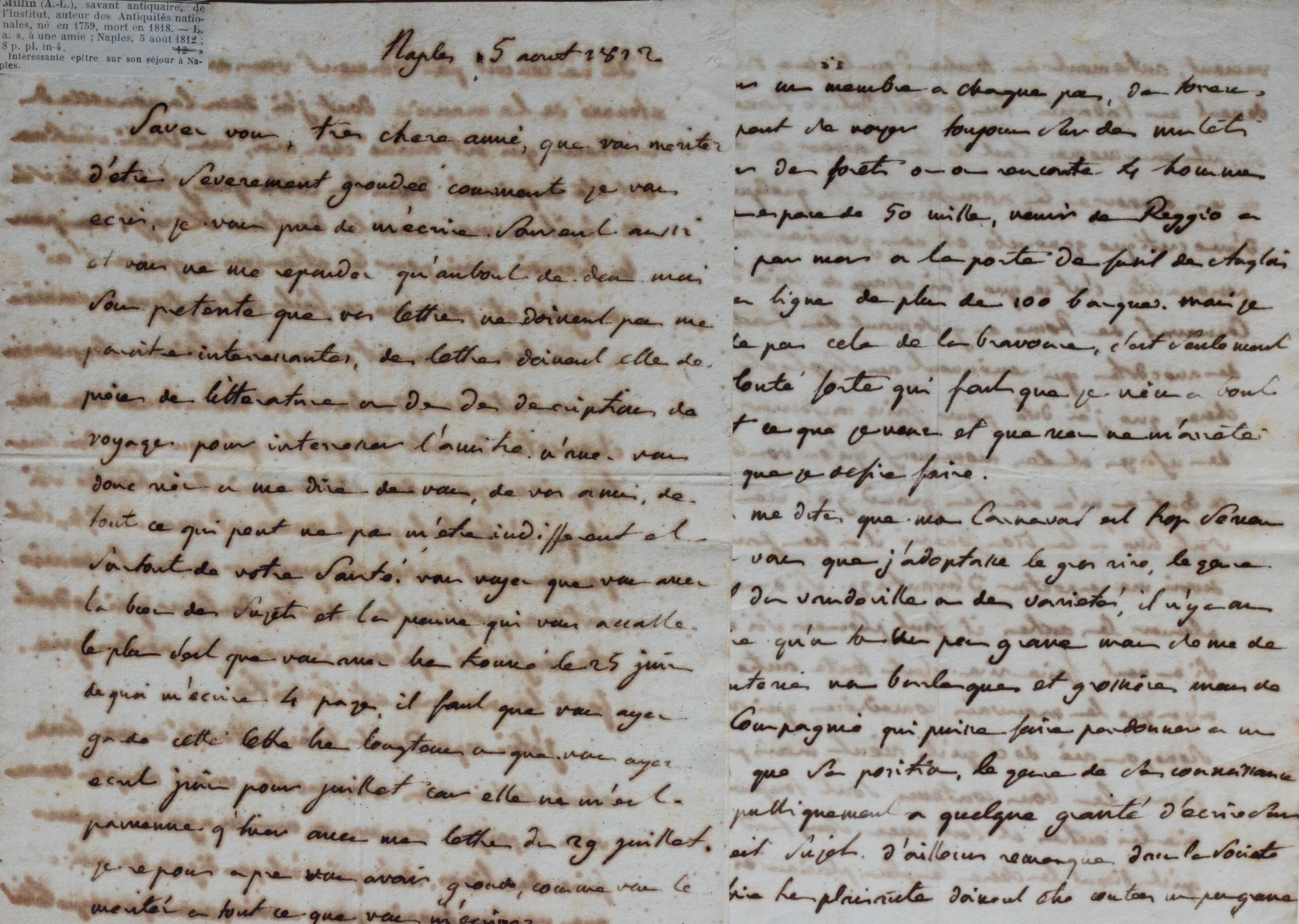 Longue lettre d’Aubin Louis Millin de Grandmaison, écrite de Naples en 1812
