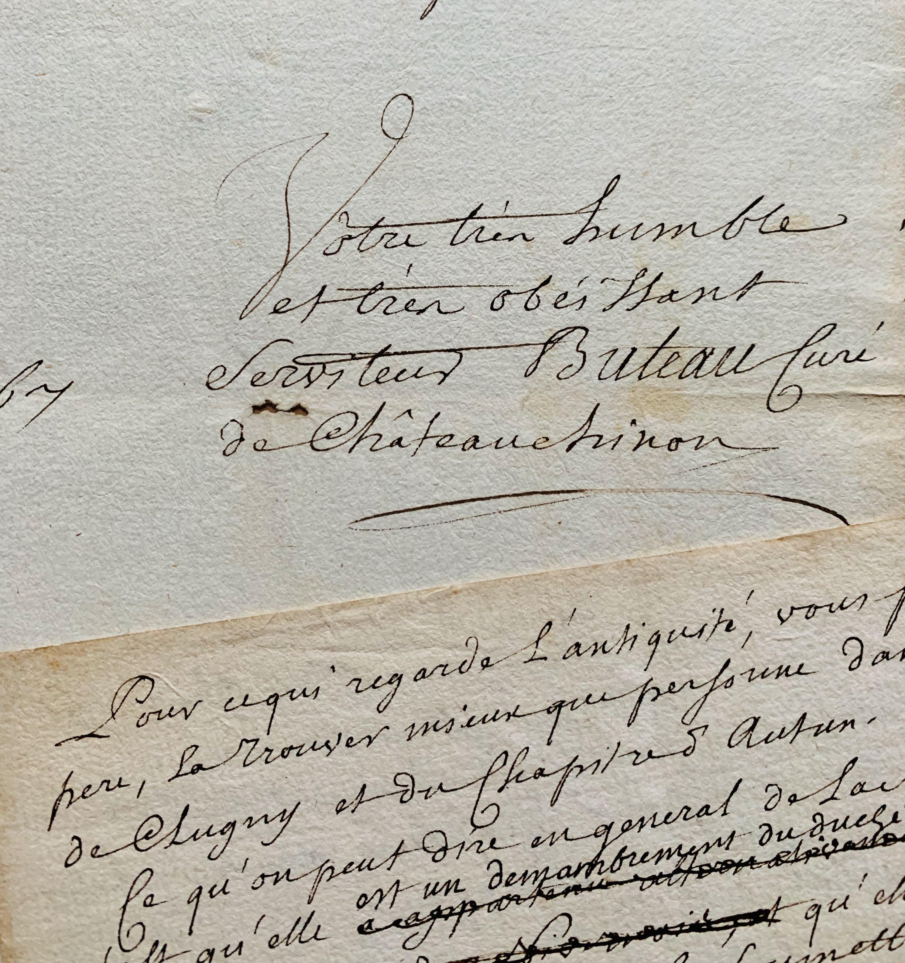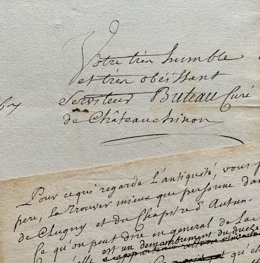 Très intéressante lettre de Bureau, curé de Château-Chinon, faisant un panorama de la ville, développé autour de 3 points : le château, le prieuré Saint-Christophe, la ville et la paroisse.